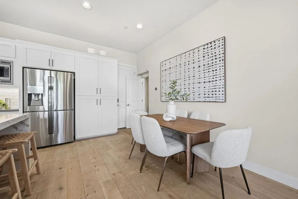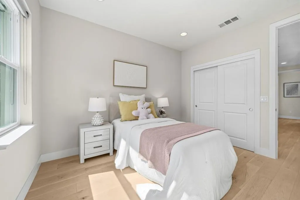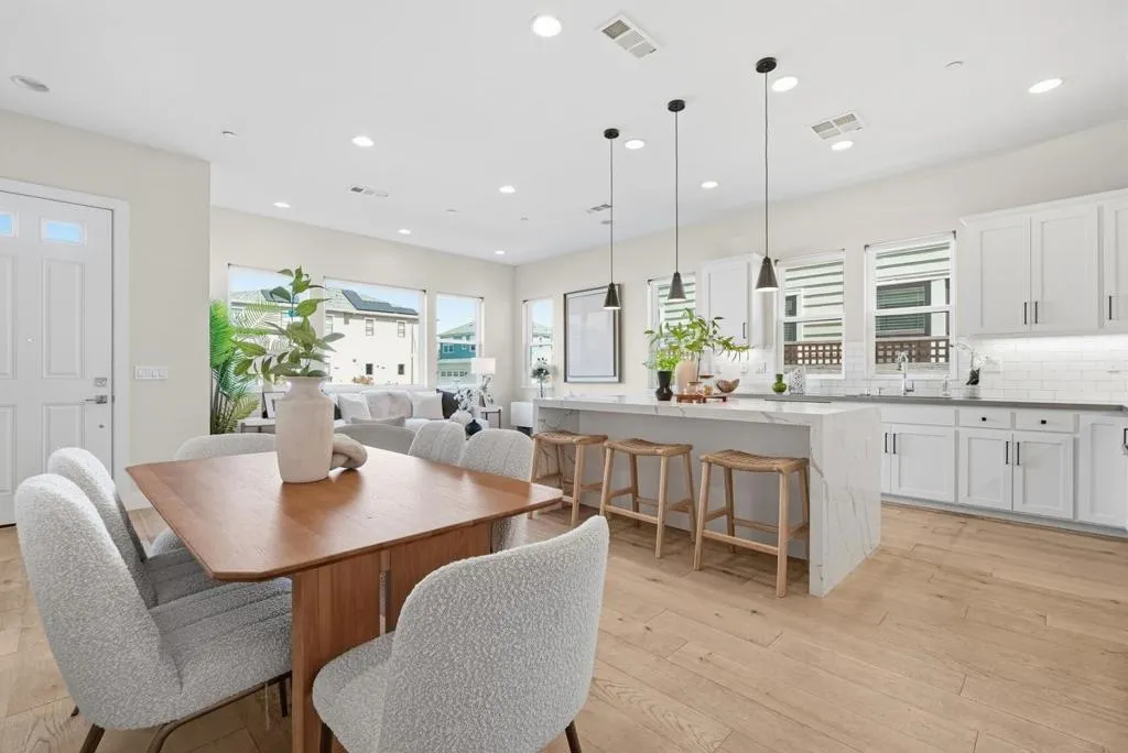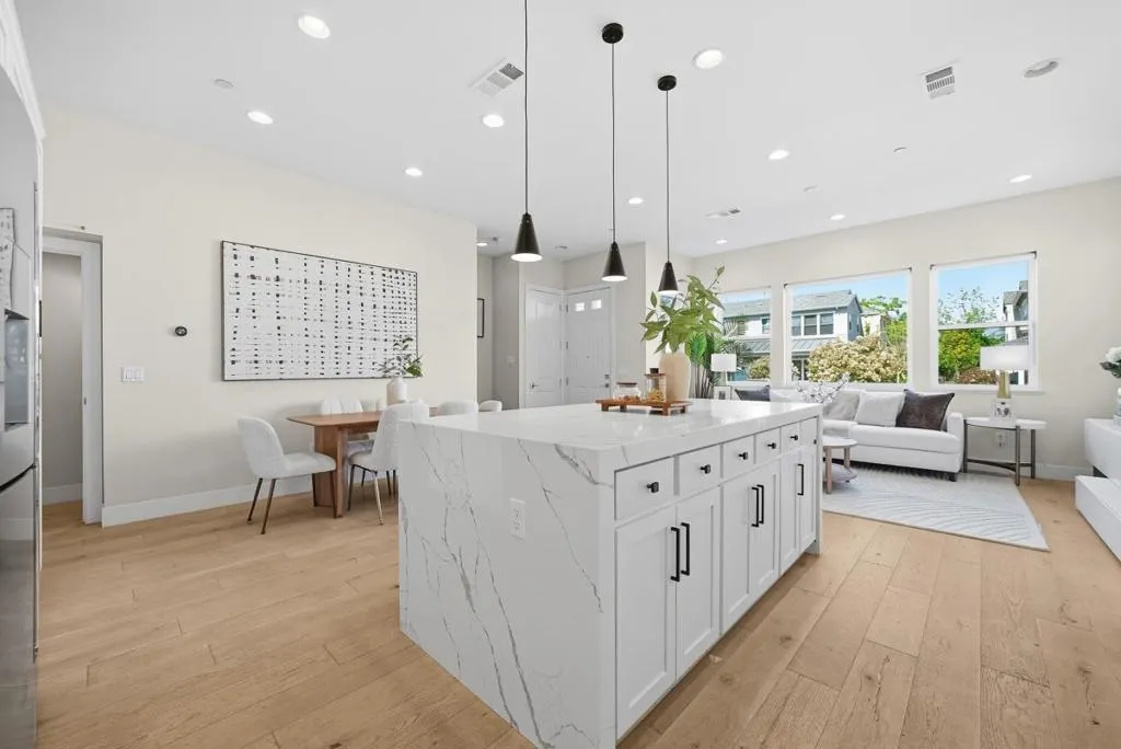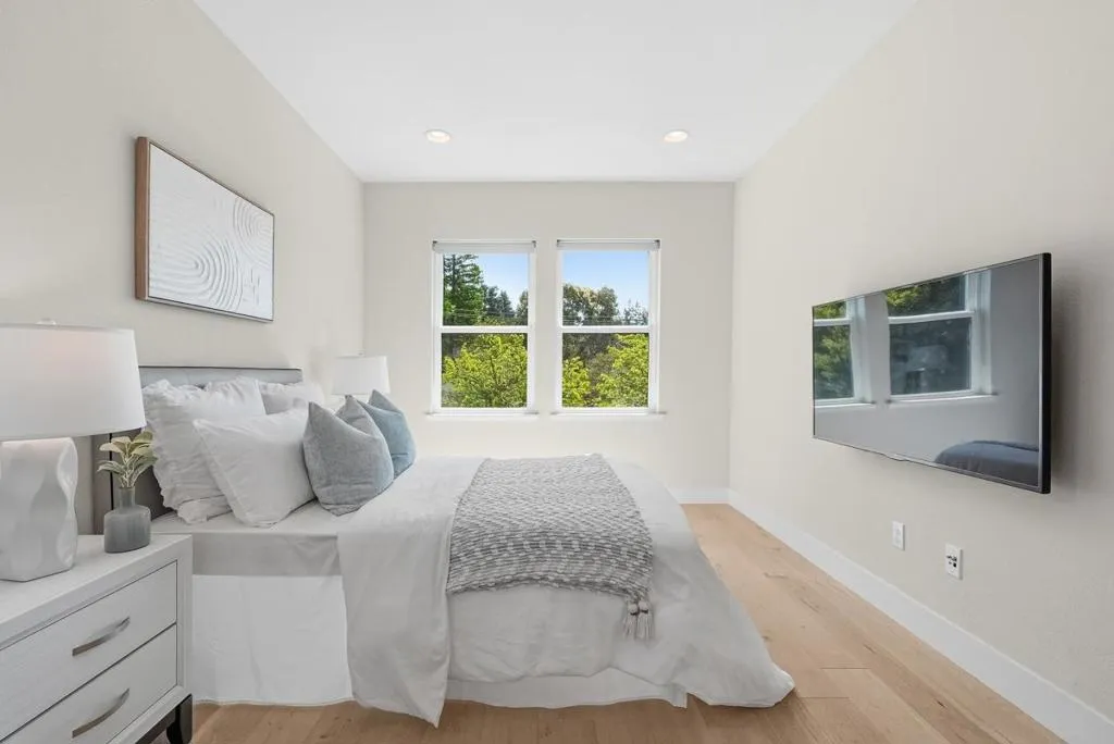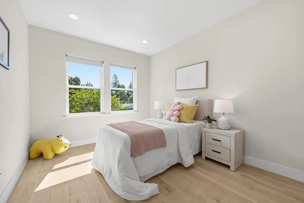Rare two-story duet in Mountain View with a private side yard and raised garden beds. Tucked away on a quiet cul-de-sac, this well-maintained home offers an open-concept layout with high ceilings, abundant natural light, and a beautifully upgraded kitchen featuring Bosch appliances, a separate range hood, large sink, and a striking waterfall countertop. Custom Shade Store blinds add a polished finish throughout. Upstairs, a spacious landing offers flexible use as a home gym with abundant storage. The master bedroom suite features a private shaded balcony, while the primary bath includes a relaxing soaking tub for a spa-like experience. Two additional bedrooms share a double vanity full bath and a laundry room with sink add everyday practicality. Smart home features such as Nest and Ring and smart locks, and the oversized garage offers ample storage and a Tesla charger. Enjoy close proximity to parks, tennis courts, Caltrain, and Downtown Mountain View, with easy access to Highways 101 , 237 and 85. Conveniently located near Google and Meta, with a Meta shuttle stop near the community.