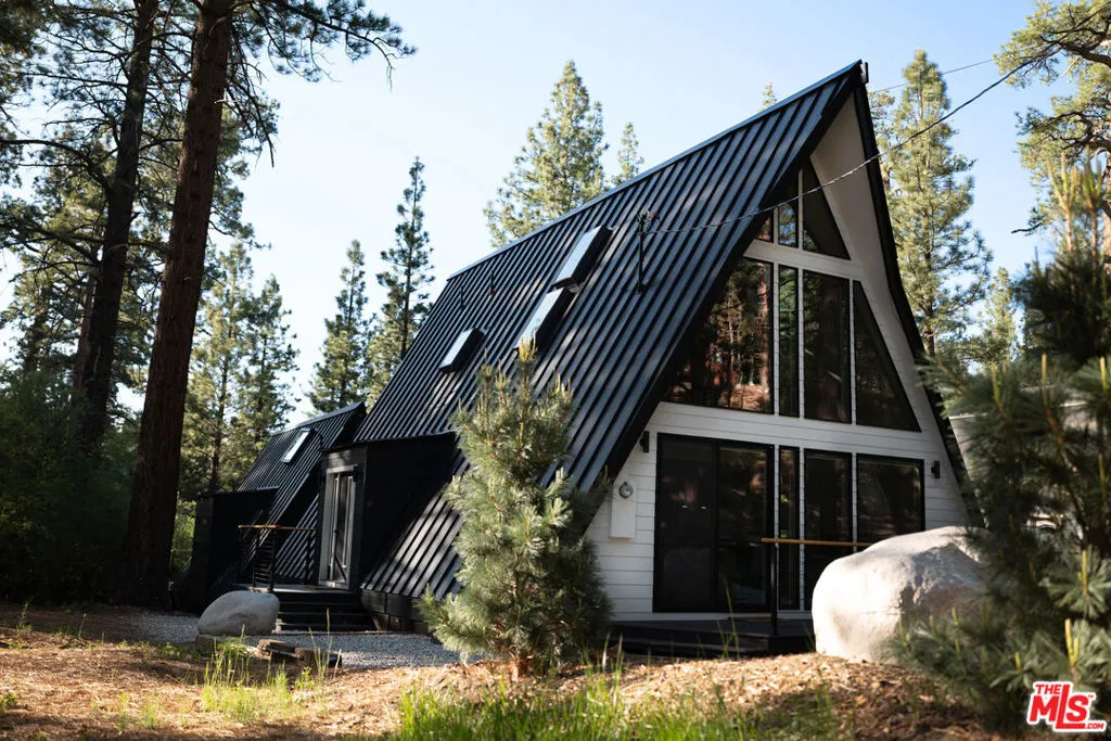 Tucked among the old-growth trees in the mountains of Big Bear, this striking Scandinavian retreat blends stone, hardwood, and thoughtful design into a truly one-of-a-kind alpine escape. Newly constructed and exuding extraordinary attention to detail, the property features two separate A-frame cabins, offering a rare combination of architectural beauty, flexibility, and peaceful mountain living. The main A-frame showcases a spacious design with soaring ceilings, clean lines, and an open, light-filled interior. Crafted from natural materials, the home pairs precision Baltic Birch walls with handmade Poplar end-grain floors, creating a warm and soulful interior that feels both modern and timeless. Large windows frame views of the surrounding forest, bringing in soft natural light during the day and moon lit trees by night. The central living area features dramatic vaulted ceilings and an open layout connecting the living, dining, and kitchen spaces, with a kitchen bar ideal for casual meals and entertaining. On the main level, a spacious guest bedroom sits alongside a beautifully finished British inspired wet bathroom featuring natural stone tile and a rain shower. A generous laundry and utility room offers the perfect place to drop skis, boots, and gear after a day on the slopes. Upstairs, a loft area provides additional flexible sleeping space, while the primary suite offers vaulted ceilings and a spa inspired bathroom, creating a peaceful retreat above the main living areas. A second A-frame at the rear of the property mirrors the concept design of the front home but with arguably more charm. With its own lofted bedroom, kitchen, and full bathroom, it is perfect for guests, extended family, or a private owner's retreat if the front cabin is used as a rental. Towering Jeffrey pines and native willows surround the seasonal creek behind the property, forming a natural privacy buffer that beautifully frames the A-frame homes and can be best enjoyed from the private back patio. This home has a spacious attached, heated garage with an elevated sleeping loft. Perfect for boat and activity storage, or convert to an additional living space with included utility hookups. Every element of this wall to wall hardwood mountain hideaway was intentionally crafted, creating a peaceful retreat where minimalist design meets Nordic alpine charm. Set in a quiet neighborhood at the end of the street, the property offers direct access to miles of serene forest trails. Despite its tranquil setting, the home is ideally located just minutes from ski resorts, outdoor recreation, local grocery stores, restaurants, and coffee shops.