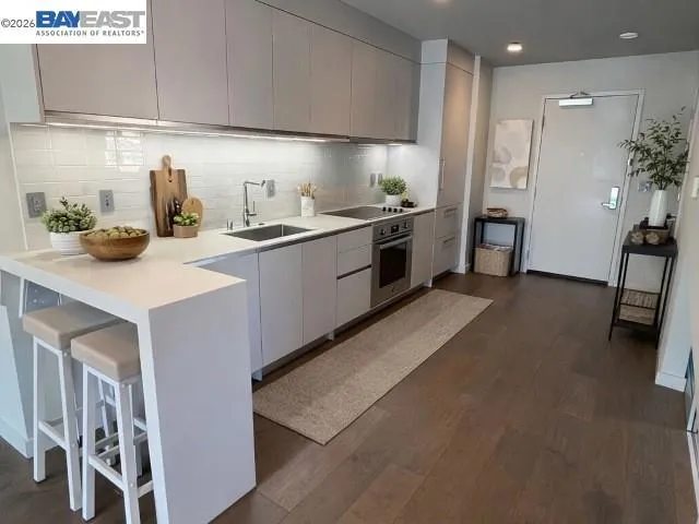 Modern and luxurious fifth-floor, two-bedroom condominium at Sutter North, in the heart of Polk Gulch. Residence 505 features a sleek contemporary kitchen with Italian cabinetry and high-end appliances, complemented by floor-to-ceiling windows that fill the space with natural light. Wide-plank walnut flooring and thermal radiant heating provide both style and comfort throughout. The spa-inspired bathroom showcases floor-to-ceiling Amalfi ceramic tile and a Duravit soaking tub. Additional highlights include an in-unit Bosch stackable washer and dryer, plus a deeded patio with marine-style IPE wood decking—perfect for indoor-outdoor living. A rare opportunity to own a sophisticated, move-in-ready home with premium finishes in a desirable location. The building has secured indoor bicycle storage and secured package delivery room.