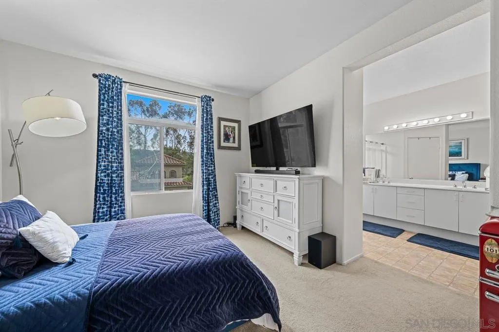 Welcome to this spacious two-story townhome located in a VA/FHA-approved complex. Featuring 9-foot ceilings on both levels, the home offers a bright, open, and inviting atmosphere throughout. A standout feature is the highly desirable downstairs flex space, complemented by a nearby powder room. This versatile area can easily serve as a third bedroom, home office, gym, or additional storage, making it a valuable extension of the living space. Upstairs, both generously sized bedrooms include private en-suite full bathrooms, providing ideal separation and privacy. The primary suite is further enhanced by a large walk-in closet. The kitchen has been tastefully upgraded with a newer stovetop, oven, dishwasher, and microwave, while the carpet has been replaced in recent years, adding to the home’s overall appeal. Enjoy seamless indoor-outdoor living with an oversized 21' x 10' private patio, significantly larger than typical townhome outdoor spaces and perfect for relaxing or entertaining. Additional highlights include an attached two-car garage and a full-size washer and dryer located in a dedicated laundry room with ample space for additional storage. Ideally situated just steps from the community pool and fitness center, this home is set within a quiet, well-maintained community. The location offers exceptional convenience, just moments from Poway Road with abundant shopping, dining, and entertainment options, as well as nearby parks and scenic hiking trails. Commuters will benefit from easy access to both the 15 and 56 freeways. The HOA provides excellent value by covering roof maintenance, trash pick-up, water, landscaping, etc. helping to simplify homeownership and reduce upkeep responsibilities. Located within the highly regarded Poway Unified School District, widely recognized as one of the top-rated districts in San Diego County, this home presents an outstanding opportunity to enjoy comfort, flexibility, and convenience in a prime location. This is a must see!