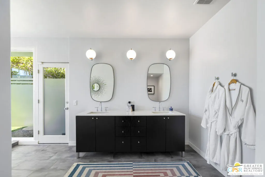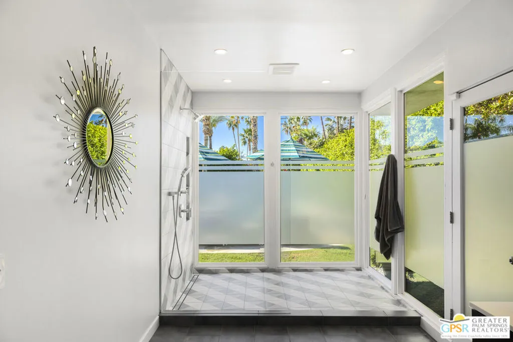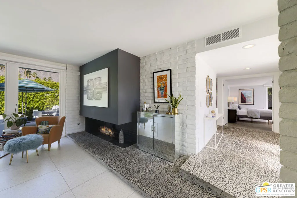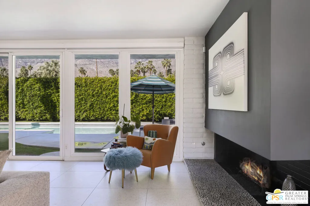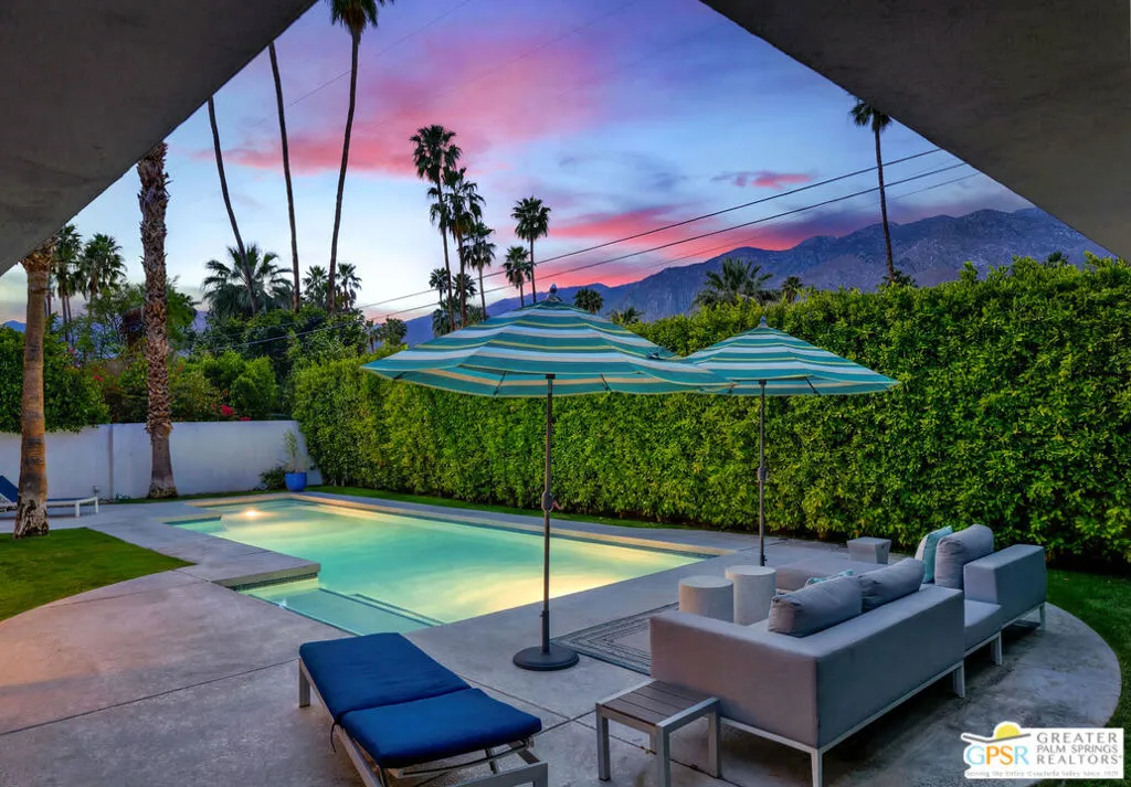 Located in the heart of Palm Springs' coveted Deepwell neighborhood, this quintessential 1961 mid-century modern home blends architectural character with thoughtful modern upgrades. Framed by a dramatic circular driveway and surrounded by gorgeous mountain views from both the front and back, the setting is as iconic as the home itself. Inside, a dramatic rounded wall and statement fireplace anchor the living room, creating a true architectural moment, while walls of glass and an effortless layout open to the outdoors, delivering the indoor-outdoor lifestyle Palm Springs is known for. The home has been updated with new terrazzo-style flooring, fresh interior paint, and new double-pane windows throughout, while preserving its original Italian stone and rock entryway an ideal balance of authenticity and refinement. The remodeled kitchen is both striking and functional, featuring gorgeous quartz countertops, premium Italian appliances, and a new gas line, all designed to connect seamlessly to the main living spaces and outdoor areas. Anchored by a dining area with beautiful mountain views, this space is ideal for both everyday living and entertaining. All three bedrooms are generously sized, offering comfort and flexibility, while the fully remodeled bathrooms showcase elevated finishes, including designer wallpaper. The primary suite is a true retreat, featuring a large walk-in closet, a massive walk-in shower, enhanced ventilation, and direct access to a private outdoor shower, perfectly embracing the indoor-outdoor lifestyle. An additional bonus office/den/guest area, complete with its own bath and direct access to the backyard, adds versatility and function. Step outside to a private backyard retreat featuring a pool and spa, new landscaping and outdoor lighting, multiple areas to relax and entertain, and stunning mountain views that create a true desert backdrop. Additional upgrades include owned solar with a Tesla Powerwall, two new A/C units, two new hot water heaters, a brand new roof (approximately 5 months old), and two new sewer lines connected to the city, offering both efficiency and peace of mind. With 3 bedrooms and 3 bathrooms, this is a rare opportunity to own a true architectural mid-century home in one of Palm Springs' most iconic neighborhoods, where timeless design meets modern comfort.