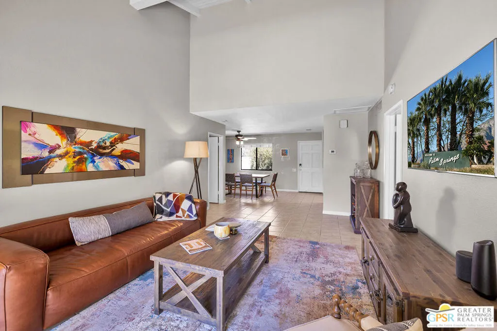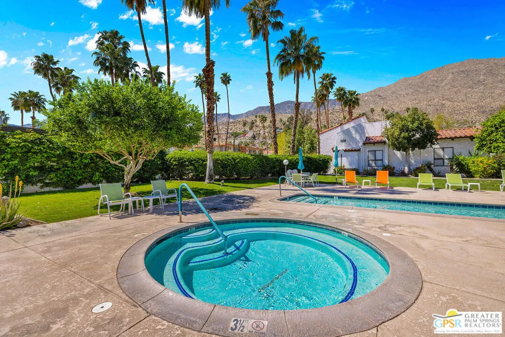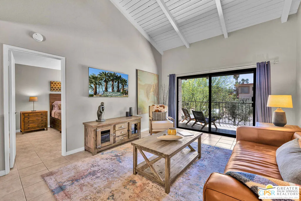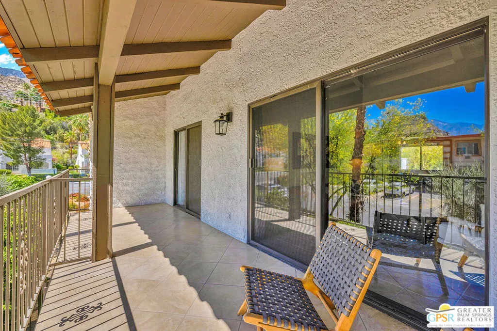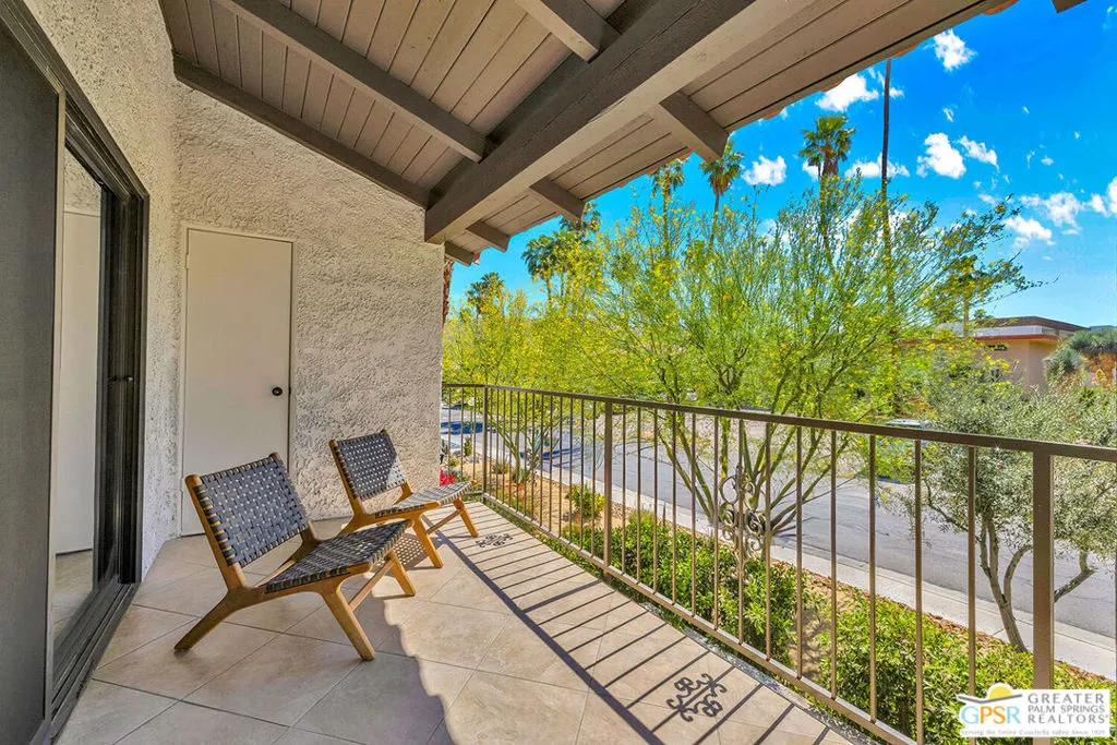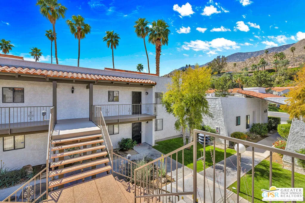 This well updated 2-bedroom, 2-bath condo at Estados South is ideally located in South Palm Springs, just one block from the base of the San Jacinto Mountains. Situated on the second floor, the home is designed with a split-bedroom layout for added privacy and is filled with natural light thanks to vaulted ceilings and large windows with desirable south-facing mountain views. The kitchen has been updated with stainless steel appliances, a gas range, and offers generous storage. The condo is offered furnished, making it well suited as a full-time residence, seasonal retreat, or investment property. Residents of Estados South enjoy access to two pools, two spas, and two tennis courts in a well-maintained, resort-style setting. The location provides convenient access to Smoke Tree Shopping Center, nearby golf courses, hiking trails, and downtown Palm Springs. The land lease extends through 2072, and additional details, including the inventory list, are available upon request.