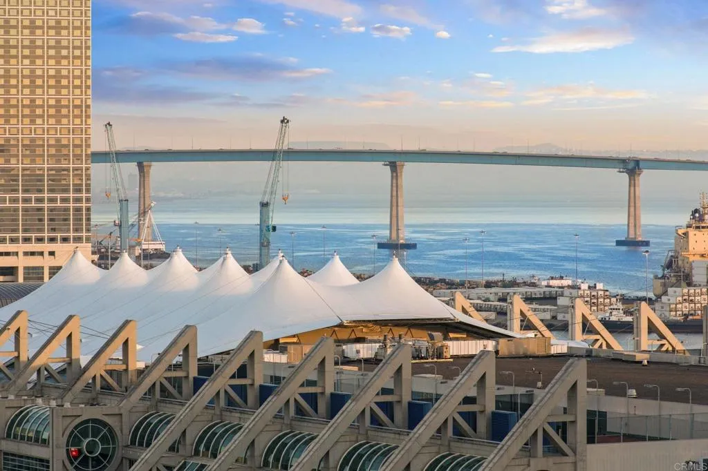 Experience effortless coastal living at The Pinnacle unit 1401, a highly sought-after southeast corner residence showcasing sweeping, unobstructed views of the bay, Pacific Ocean, Coronado Bridge, Point Loma, and the glittering downtown skyline. Dramatic 10 ft floor-to-ceiling windows flood the space with natural light, creating a stunning backdrop for unforgettable sunsets. Fully remodeled by Nicholls Design Build of Coronado with exceptional attention to detail, this 2-bedroom, 2.5-bath residence is offered fully furnished (except for artwork). Designer-curated interiors and finishes by Bungalow 56 Interiors of Coronado, seamlessly blend elevated sophistication and everyday comfort, thoughtfully selected for a cohesive and refined aesthetic. The kitchen is a showpiece, featuring premium Bosch double oven, 5-burner gas cooktop, built-in custom panel French door refrigerator, wine refrigerator and sleek Caesarstone quartz countertops. The open-concept living and dining areas flow effortlessly onto two recently tiled private balconies with retractable screen doors —ideal for enjoying panoramic coastal views and San Diego’s year-round sunshine. Elegant 12" x 24" glazed porcelain tile enhances the main living areas and bathrooms, while rich hardwood flooring adds warmth to both bedrooms. Additional highlights include custom soffit lighting and motorized roller shades in living/dining area, additional storage cabinetry, full size in-unit laundry, generous closet space, two secured (tandem) parking spaces and a private storage unit. Residents of The Pinnacle enjoy an array of resort-style amenities including, pool, spa, sauna, steam room, state-of-the-art fitness center with new equipment, outdoor BBQ and dining areas, community and conference rooms, guest suite, additional guest parking and 24-hour concierge service. Perfectly positioned in the heart of the Marina District, just moments from the iconic Rady Shell outdoor entertainment venue, Seaport Village, Petco Park, and the Embarcadero offering easy access to San Diego’s premier waterfront lifestyle, dining, and entertainment.