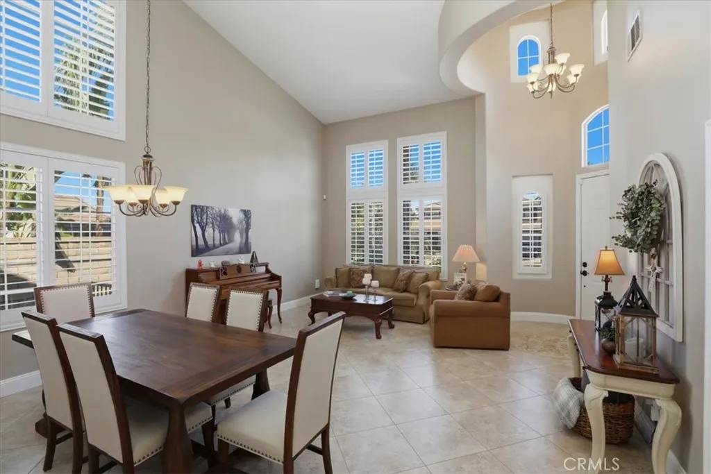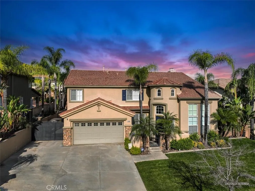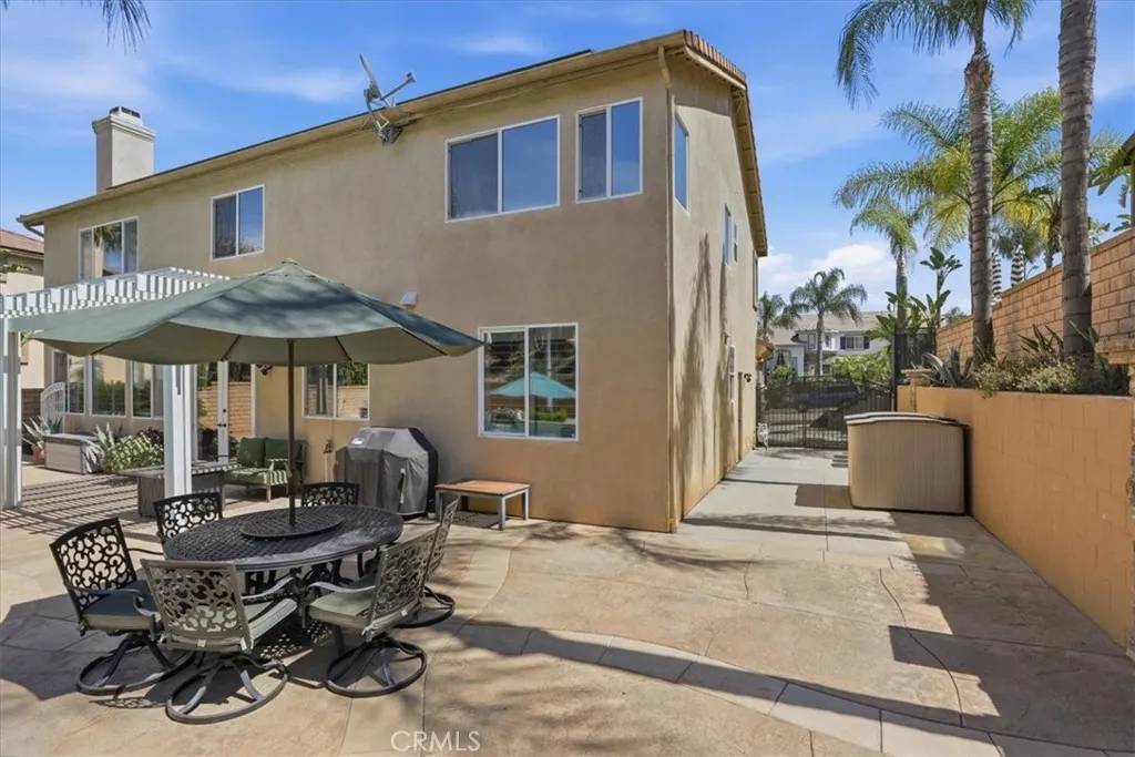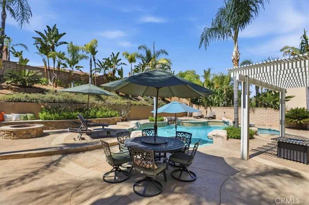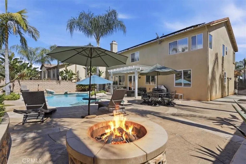 Paradise found in the highly sought-after Eagle Glen community! This exceptional home showcases one of the most desirable floor plans, offering approximately 2,885 square feet of well-designed living space with four bedrooms—including a convenient downstairs bedroom—three full bathrooms, a dedicated downstairs office, and an expansive upstairs loft/bonus room. Step inside to a grand entry featuring dramatic soaring ceilings, creating a light-filled and inviting atmosphere. The formal living and dining rooms set the stage for elegant entertaining, while the spacious family room features a built-in entertainment center and a stunning granite-surround fireplace with a custom mantle. The island kitchen is both functional and stylish, complete with granite countertops, stainless steel appliances, a built-in computer desk, and under-cabinet accent lighting. Upstairs, you’ll find three additional bedrooms, two bathrooms, and a generous loft/bonus room with custom built-ins—perfect for a media space large enough to accommodate an 85-inch TV. Throughout the home, enjoy thoughtful upgrades including plantation shutters, French doors, 7-inch baseboards, ceiling fans in every room, ample closet space, a custom storage bench, and Nest thermostats. Step outside to your own private resort-style backyard—truly a paradise! Enjoy a sparkling pool and spa with reef step and waterfall, stone seating pony walls surrounding a cozy fire pit, lush landscaping with Queen palms, sago, and Phoenix roebelenii palms, custom landscape lighting, stamped concrete, a lattice patio cover, and even a dog run. Additional highlights include privated gated courtyard, solar, low taxes and low HOA. Ideally located within walking distance to the Eagle Glen clubhouse—perfect for weekend breakfasts—and just a 5-minute drive to Dos Lagos for dining, entertainment, comedy shows, movies, and summer concerts. Beautifully upgraded and move-in ready—this is the home you’ve been waiting for!