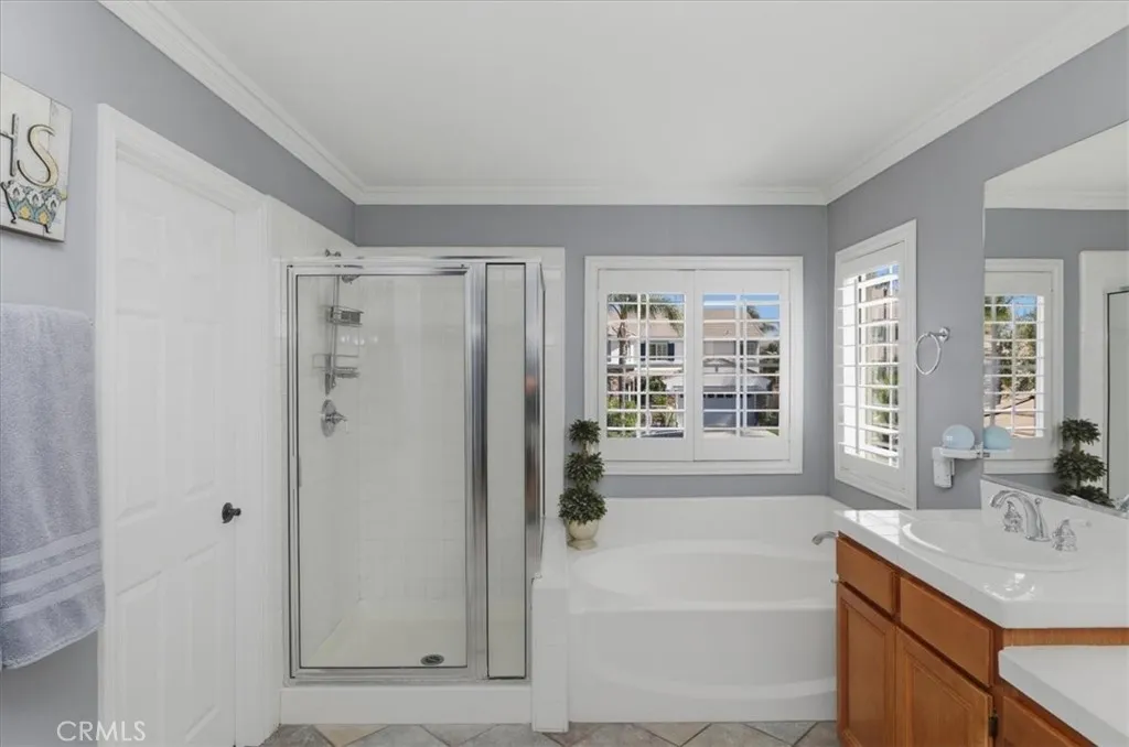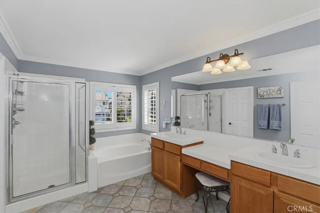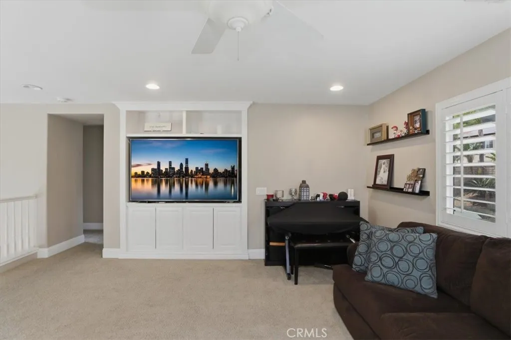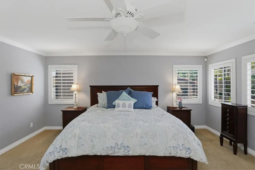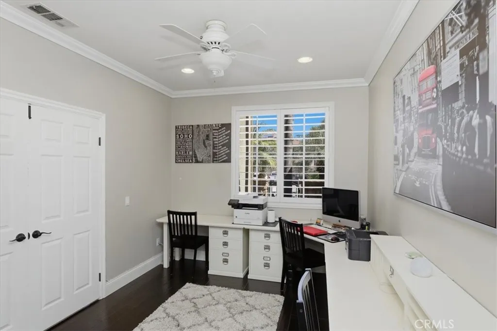 Paradise found in the highly sought-after Eagle Glen community! This exceptional home showcases one of the most desirable floor plans, offering approximately 2,885 square feet of well-designed living space with four bedrooms—including a convenient downstairs bedroom—three full bathrooms, a dedicated downstairs office, and an expansive upstairs loft/bonus room. Step inside to a grand entry featuring dramatic soaring ceilings, creating a light-filled and inviting atmosphere. The formal living and dining rooms set the stage for elegant entertaining, while the spacious family room features a built-in entertainment center and a stunning granite-surround fireplace with a custom mantle. The island kitchen is both functional and stylish, complete with granite countertops, stainless steel appliances, a built-in computer desk, and under-cabinet accent lighting. Upstairs, you’ll find three additional bedrooms, two bathrooms, and a generous loft/bonus room with custom built-ins—perfect for a media space large enough to accommodate an 85-inch TV. Throughout the home, enjoy thoughtful upgrades including plantation shutters, French doors, 7-inch baseboards, ceiling fans in every room, ample closet space, a custom storage bench, and Nest thermostats. Step outside to your own private resort-style backyard—truly a paradise! Enjoy a sparkling pool and spa with reef step and waterfall, stone seating pony walls surrounding a cozy fire pit, lush landscaping with Queen palms, sago, and Phoenix roebelenii palms, custom landscape lighting, stamped concrete, a lattice patio cover, and even a dog run. Additional highlights include privated gated courtyard, solar, low taxes and low HOA. Ideally located within walking distance to the Eagle Glen clubhouse—perfect for weekend breakfasts—and just a 5-minute drive to Dos Lagos for dining, entertainment, comedy shows, movies, and summer concerts. Beautifully upgraded and move-in ready—this is the home you’ve been waiting for!