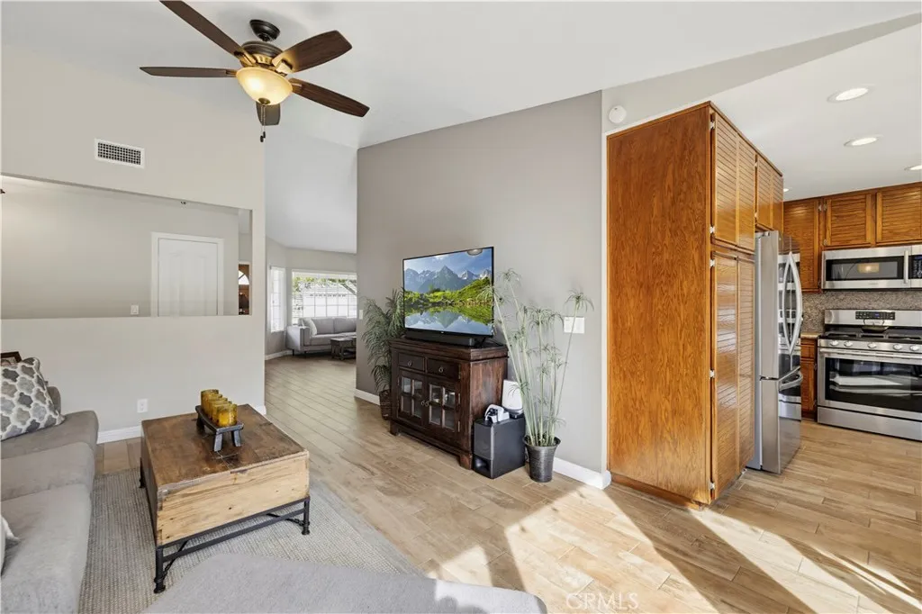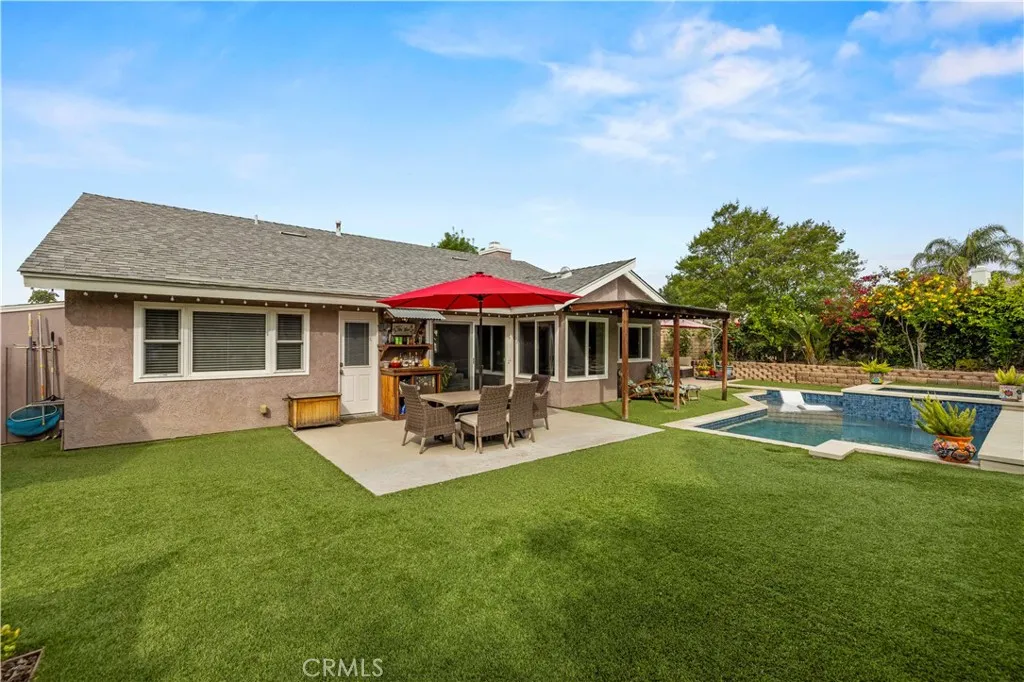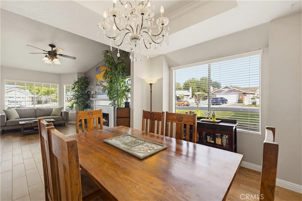 Welcome to this beautifully updated corner-lot pool home tucked away in a peaceful, established neighborhood. Offering 3 bedrooms, 2 bathrooms, and 1,608 square feet of inviting living space, this home blends comfort, style, and effortless California living. Step inside to find wood-look tile flooring throughout most of the home, a spacious living room with a cozy fireplace, and a formal dining area that’s perfect for both everyday living and special gatherings. The updated kitchen is a standout, featuring granite countertops, stainless steel appliances, abundant cabinetry, and a charming breakfast nook for casual mornings at home. Just off the kitchen, the warm and welcoming family room overlooks the backyard, creating a seamless flow between indoor and outdoor living. The generous primary suite offers a relaxing retreat with newer carpet, wall-to-wall closet space, and an updated en-suite bath complete with modern vanity and glass-enclosed shower. Two additional secondary bedrooms also feature newer carpet and ceiling fans and are served by a well-appointed hall bathroom. Outside, your own private resort-style oasis awaits. Enjoy a sparkling saltwater pool and spa, covered patio, and multiple seating areas designed for both entertaining and unwinding. The beautifully landscaped yard is filled with thoughtful touches, including maintenance-free turf, outdoor lighting, colorful plants, flowers, and citrus trees. Additional upgrades include a new tankless water heater, new garage door opener, direct-access 2-car garage that is electric-car-ready, and a whole-house attic fan. With no HOA and no Mello-Roos, plus an ideal location within walking distance to award-winning schools, parks, and local shopping, this home offers the perfect combination of convenience, charm, and lifestyle.