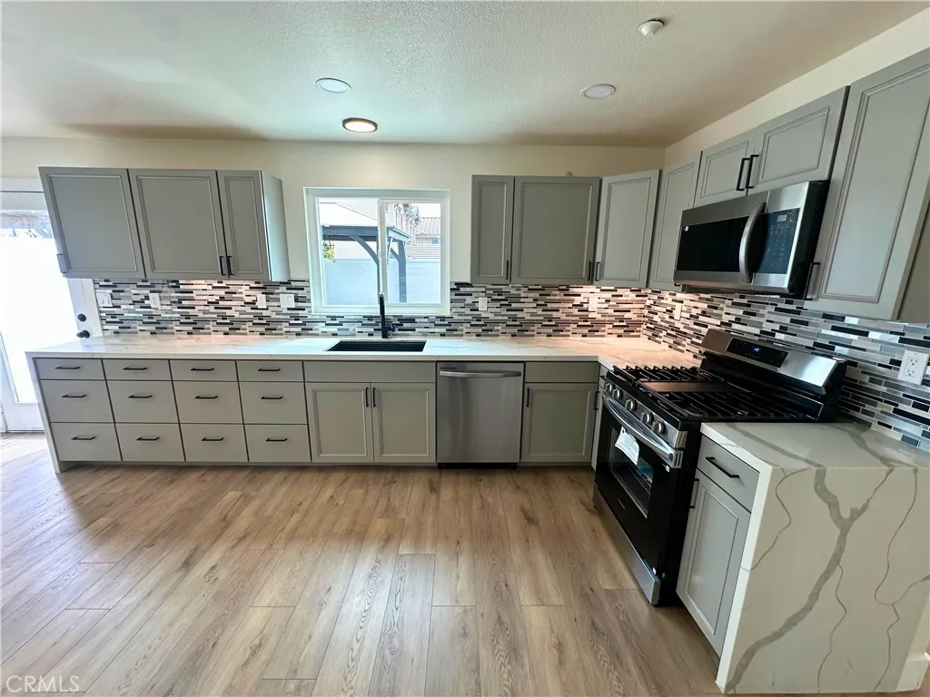 Beautifully updated home located in the Sierra Lakes Golf Community with NO HOA!! Spacious corner lot two-story house has 5 bedrooms and 2.5 bathrooms, open floor plan with new interior and exterior paint, laminate wood flooring throughout, and all new windows with lots of natural light. The main level includes a convenient downstairs bedroom, an updated half bathroom along with a laundry room. Has a separate dining area, remodeled kitchen featuring updated cabinetry, quartz countertops, a stylish backsplash, and under-cabinet lighting, has recessed lighting throughout the home. Upstairs has 4 bedrooms and 2 updated bathrooms, Master bathroom with a walk in closet, central air conditioner and heating. Attached 2-car garage, and a spacious backyard with a gazebo and kids playset—great for entertaining or relaxing outdoors. Centrally located within walking distance to major shopping centers, restaurants, Chase bank, and Lowes hardware store, just minutes from the 210 freeway, Costco and nearby schools. A must see!