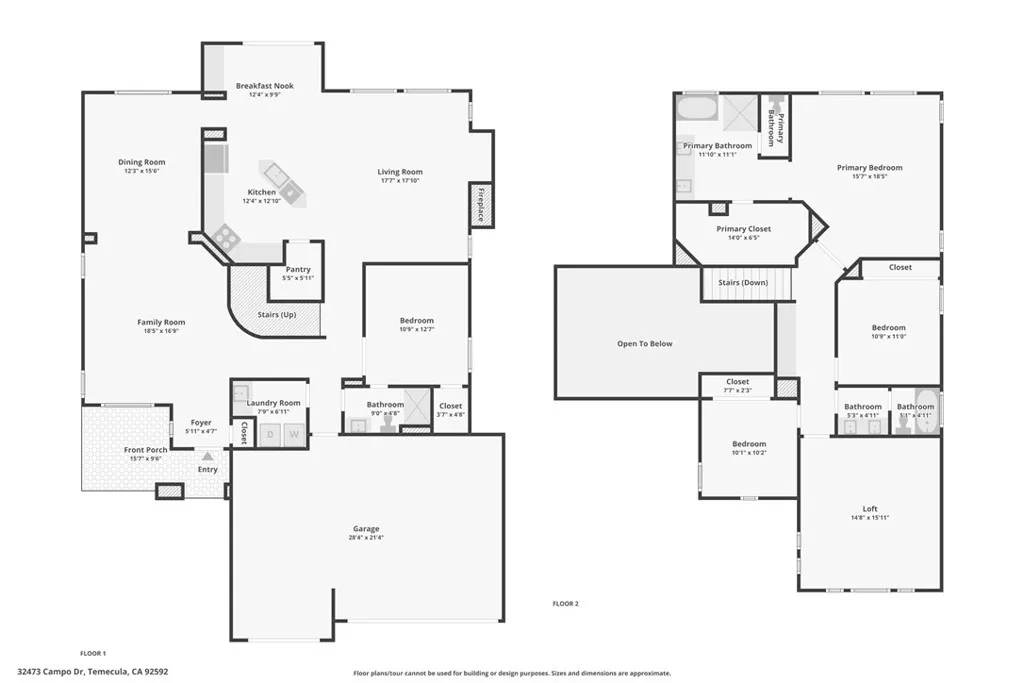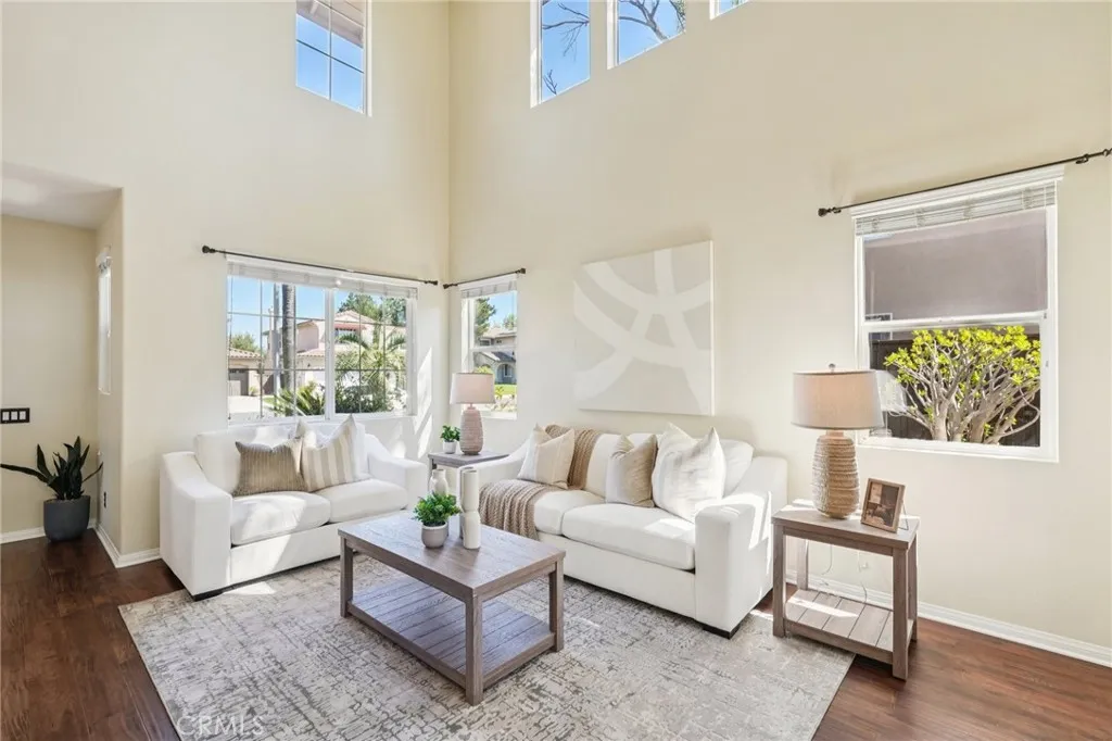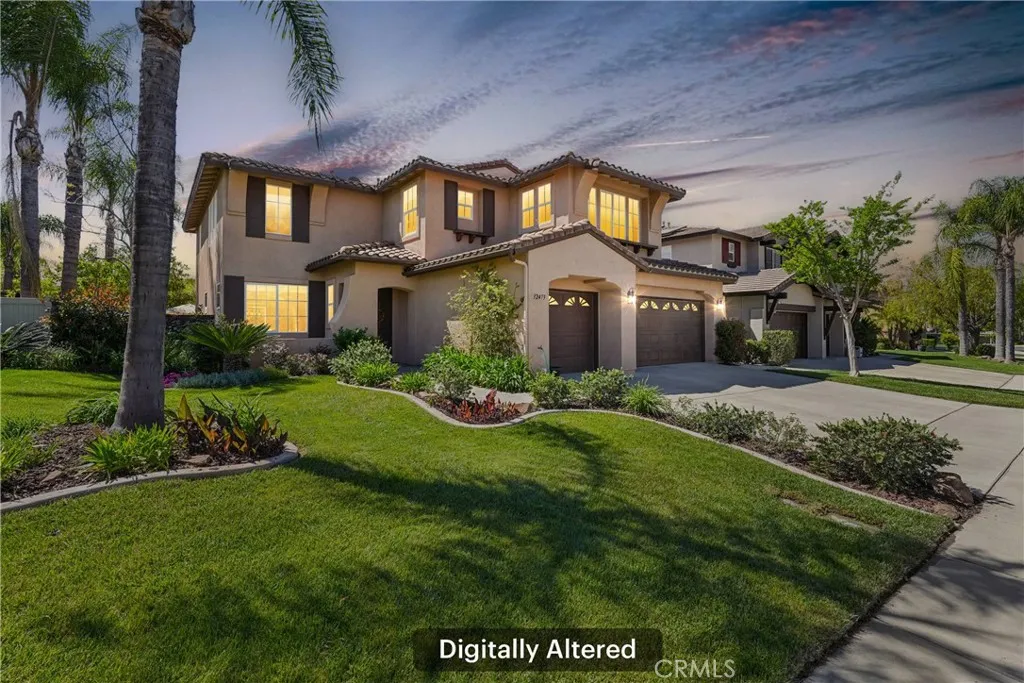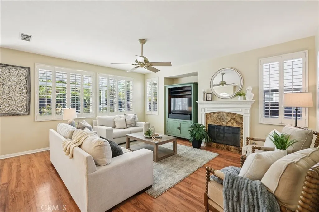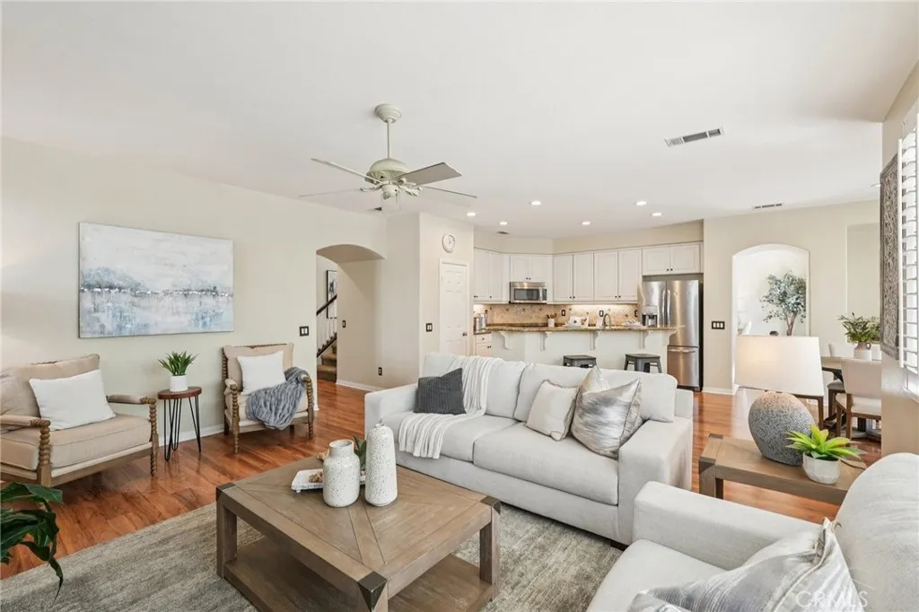 Welcome to this stunning two-story home located in the highly desirable Paseo del Sol community. Showcasing fantastic curb appeal, this home features an attached 3-car garage and leased solar panels for enhanced energy efficiency and long-term savings! Before stepping inside enjoy the front porch area great for relaxing. The spacious interior offers a thoughtfully designed floor plan highlighted by recessed lighting, a neutral paint scheme, and stylish laminate wood-look flooring throughout. The formal living room impresses with soaring two-story ceilings and an abundance of natural light, creating a bright and airy ambiance. Adjacent, the formal dining room is elevated by a modern industrial-style chandelier, this space is perfect for hosting! The open-concept great room seamlessly combines comfort and functionality, featuring a cozy fireplace in the family room, a charming breakfast nook, and a well-appointed kitchen that is equipped with granite countertops, a center island with breakfast bar seating, ample cabinet storage space, a pantry, and stainless steel appliances which include the refrigerator. Convenience meets flexibility with a main floor bedroom and full bathroom, ideal for guests or multi-generational living. There is also a dedicated laundry room. Upstairs, you’ll find a spacious bonus loft that can easily serve as a 5th bedroom, home office, or media room, along with three additional bedrooms including the large primary suite with private spa-like ensuite bathroom featuring dual sinks, a soaking tub, a separate shower, and a large walk-in closet. A full hall bathroom serves the secondary bedrooms. Also, step outside to enjoy your private backyard oasis, designed for both relaxation and entertaining with pergola to relax under, concrete hardscaping, turf accents, and a garden perimeter with mature plants. There is also large community, sparkling lap pool and kids pool directly across the street plus an included hot tub in the backyard! Also conveniently located near the gym, park, pond/trails, as well as a close proximity to schools including Temecula Middle School (0.2 miles away), Abby Reinke Elementary School, and Temecula High School, plus there are grocery stores (Barons 1.1 miles away and Sprouts 1.4 miles away). This exceptional home offers the perfect blend of comfort, style, and community living, schedule your private tour today!