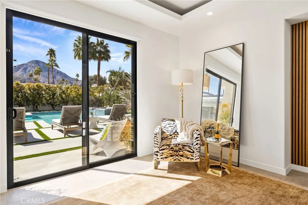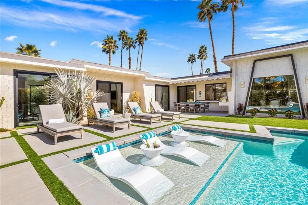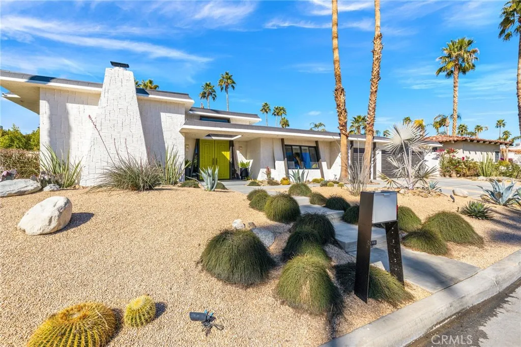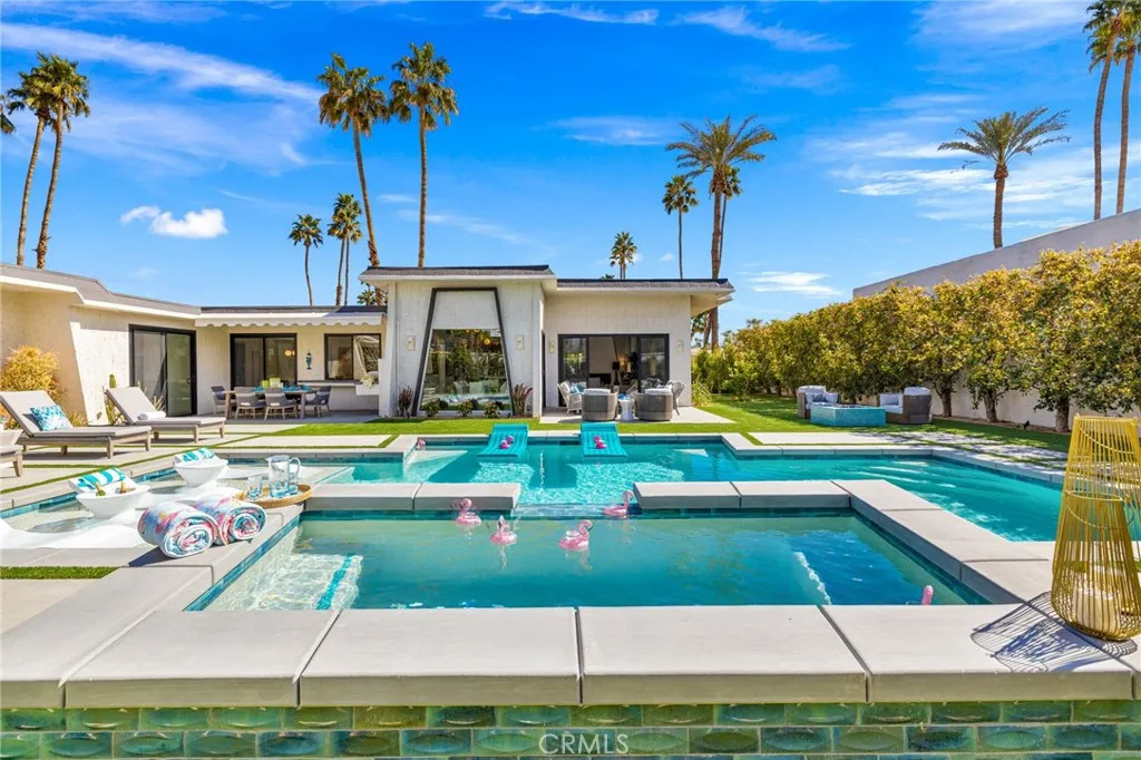 Rooted in the architectural language of 1960s modernism, this newly reimagined Indian Wells residence is a striking interpretation of mid-century design defined by bold geometry, dramatic volumes, and seamless indoor-outdoor living. Towering walls of glass flood the great room with natural light, revealing soaring ceilings, curated art walls, and sweeping desert and mountain views. A teak-clad chef’s kitchen appointed with Thermador appliances and an adjacent den overlook the living space, enhancing the home’s sense of scale and connection. Comprehensively renovated in 2022, the property blends refined materials with an effortless, livable elegance. Outdoors, a newly designed saltwater pool and oversized 12-jet spa are set within lush, private grounds featuring mature desert landscaping and citrus trees including grapefruit, lemon, lime, and kumquat. The primary suite is a tranquil retreat, opening to expansive mountain views with direct access to the pool and a private outdoor shower. The spa-inspired bath is richly appointed, complementing the home’s elevated yet relaxed aesthetic. Offering four bedrooms (one currently styled as a den/office) and four baths, the residence also includes custom teak cabinetry, generous storage, a walk-in pantry, laundry room, indoor and outdoor fireplaces, an outdoor bar with built-in BBQ, and an oversized 2.5-car garage. Set on one of the area’s most desirable streets, moments from Indian Wells Country Club, El Dorado, and The Vintage, this exceptional property captures the essence of private desert resort living, sophisticated, serene, and distinctly timeless.