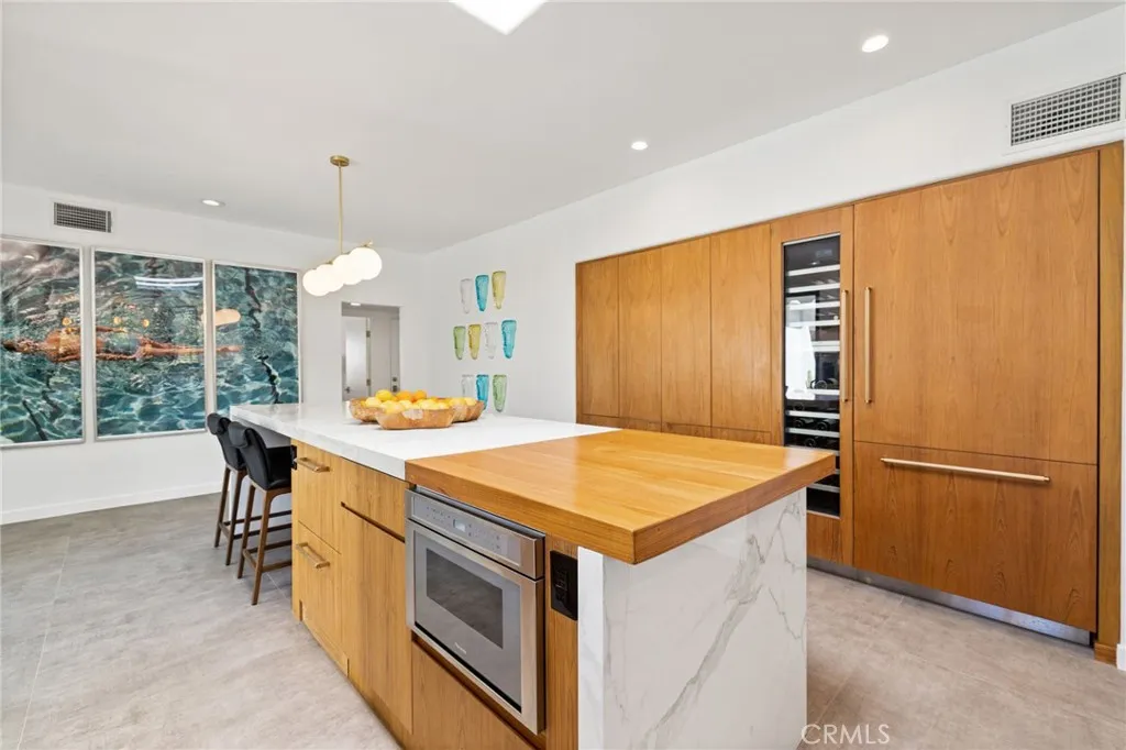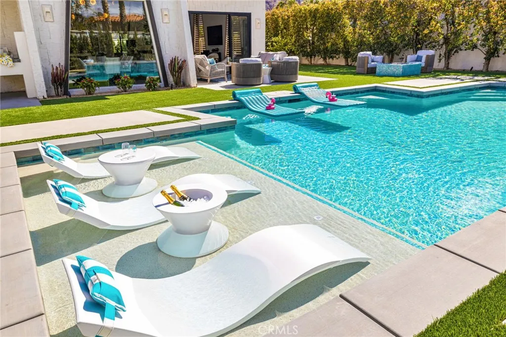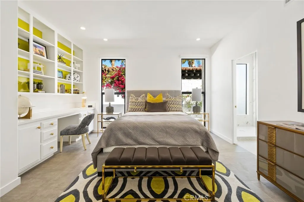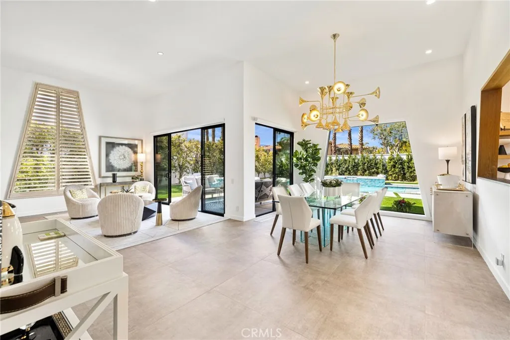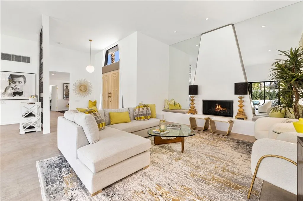 Rooted in the architectural language of 1960s modernism, this newly reimagined Indian Wells residence is a striking interpretation of mid-century design defined by bold geometry, dramatic volumes, and seamless indoor-outdoor living. Towering walls of glass flood the great room with natural light, revealing soaring ceilings, curated art walls, and sweeping desert and mountain views. A teak-clad chef’s kitchen appointed with Thermador appliances and an adjacent den overlook the living space, enhancing the home’s sense of scale and connection. Comprehensively renovated in 2022, the property blends refined materials with an effortless, livable elegance. Outdoors, a newly designed saltwater pool and oversized 12-jet spa are set within lush, private grounds featuring mature desert landscaping and citrus trees including grapefruit, lemon, lime, and kumquat. The primary suite is a tranquil retreat, opening to expansive mountain views with direct access to the pool and a private outdoor shower. The spa-inspired bath is richly appointed, complementing the home’s elevated yet relaxed aesthetic. Offering four bedrooms (one currently styled as a den/office) and four baths, the residence also includes custom teak cabinetry, generous storage, a walk-in pantry, laundry room, indoor and outdoor fireplaces, an outdoor bar with built-in BBQ, and an oversized 2.5-car garage. Set on one of the area’s most desirable streets, moments from Indian Wells Country Club, El Dorado, and The Vintage, this exceptional property captures the essence of private desert resort living, sophisticated, serene, and distinctly timeless.