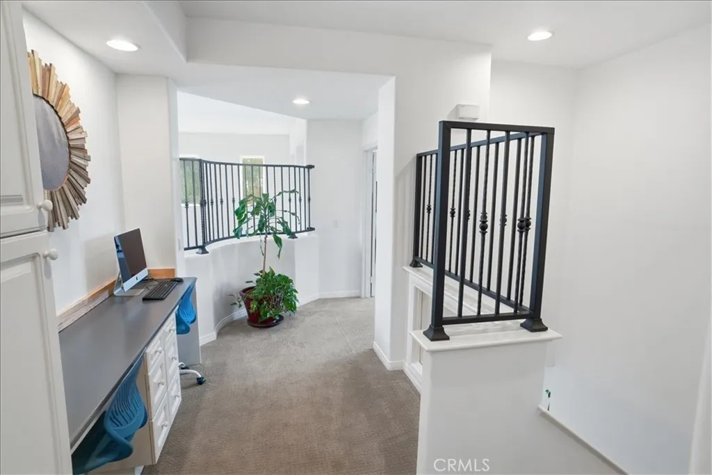 Desirable Valencia Northbridge “Montage” home located at the end of a cul-de-sac, offering privacy, minimal traffic, and an expansive pie-shaped lot with treetop sunset views. This spacious residence features 4 bedrooms plus a separate downstairs game/activity room, 3 bathrooms, and approximately 3,037 square feet of living space. A highly functional floorplan includes a downstairs bedroom with walk-in closet and adjacent full bath; ideal for guests or multi-generational living. The home offers both formal living and dining areas, along with a generous family room that opens to a spacious kitchen featuring a center island, double ovens, large pantry, abundant cabinetry, and a bright breakfast area overlooking the rear yard. Upstairs, you'll find two secondary bedrooms—each with walk-in closets—a full hall bath with dual sinks, and a versatile landing area with built-in work/study station and extensive storage, including a convenient laundry chute to the downstairs laundry room. The expansive upstairs primary suite offers a private balcony with treetop and horizon views, a separate retreat area (perfect for nursery, office, or sitting space), and a well-appointed bath with luxurious tub, separate shower, dual sinks, makeup vanity, walk-in closet, and private water closet. Interior highlights include wood flooring, plantation shutters throughout, natural gas fireplace, and a downstairs laundry room. The oversized lot provides a covered patio, grassy area, garden spaces, and a large side yard including an elevated playhouse. Additional features include an extended driveway for added parking and activities, owned solar system, and access to community pool and play areas. Convenient access to the Valencia Paseo and Santa Clarita trail system connecting parks, schools, shopping, and dining. No Mello Roos Taxes. Low HOA dues.