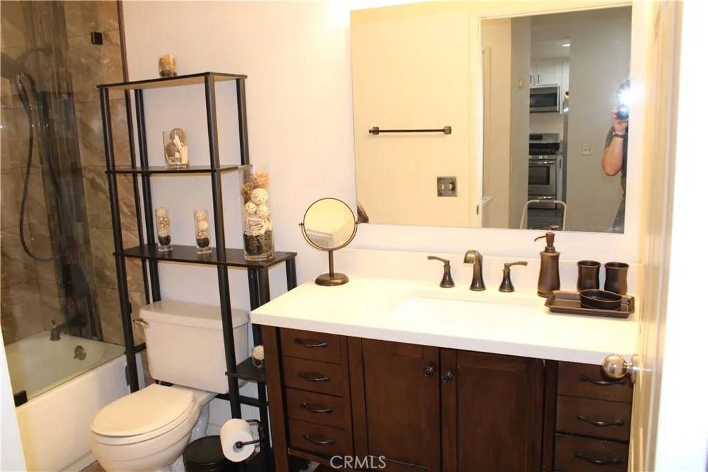 This stunning ground-level end unit offers the perfect blend of comfort and convenience with no stairs and a prime location next to a lush greenbelt. The open-concept interior is bathed in natural light from expansive windows, highlighting the laminate wood flooring and a cozy fireplace. The remodeled chef’s kitchen features a sleek breakfast bar that flows effortlessly into the living and dining areas. The master suite is a private retreat with mirrored wardrobes and direct access to a tranquil patio. Both bathrooms have been tastefully updated, including a fully remodeled guest bath. Modern essentials abound, including a new furnace, new water heater, and an indoor laundry area. Complete with a private entrance, a one-car garage with custom storage, and an additional carport, this home is just minutes from the 91 Freeway, 241 Toll Road, and the Metro Link.