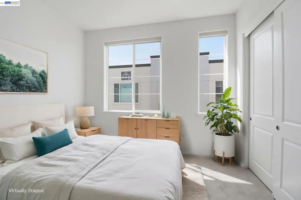 Step into contemporary comfort with this light-filled 2-bedroom, 1.5-bath townhome-style condo in the vibrant Bay37 waterfront community. Built in 2023, this 1,138-square-foot residence showcases designer LVP flooring & upgraded lighting package throughout the main level, perfect for everyday living & effortless entertaining. At the heart of the home, the gourmet chef’s kitchen impresses with a large island, premium cabinetry & quartz countertops. Modern conveniences abound, including central AC with three zoned smart thermostats, WiFi-enabled appliances, and recessed lighting—all powered by fully paid-for solar system, keeping energy costs impressively low. Upstairs, the in-unit laundry is conveniently located near both bedrooms, while two private balconies offer peaceful outdoor retreats perfect for fresh air and relaxation. An oversized, side-by-side two-car garage with direct access adds a rare level of urban convenience. Ideally situated near the Target, Safeway, In-N-Out, shopping center and the lively “Spirits Alley”—home to favorites like The Almanac and Saltbreaker—this home also offers convenient commuting with a water taxi to Jack London Square and ferry service to San Francisco. Enjoy the serenity of waterfront living without sacrificing access to city life. Must See.