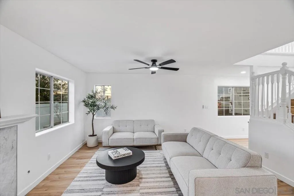 Welcome to this beautifully remodeled, light-filled end unit that truly lives and feels like a detached home. Situated in a highly desirable Poway neighborhood, this residence seamlessly blends modern sophistication with everyday comfort. The thoughtfully redesigned kitchen is a modern standout, featuring quartz countertops, sleek soft-close cabinetry, a farmhouse sink, and premium fingerprint-resistant slate appliances. Freshly updated throughout, the bright floor plan boasts custom paint, new flooring in two bedrooms, updated ceiling fans, and a newly renovated half-bath. Everyday comfort and convenience are elevated by central A/C, a cozy gas fireplace, under-stair storage, and a pristine epoxy-floored garage with built-in cabinetry. complemented by ample guest parking in the community. Perfectly situated in central Poway, you're just a short, effortless stroll from local shopping, dining, and fitness centers.