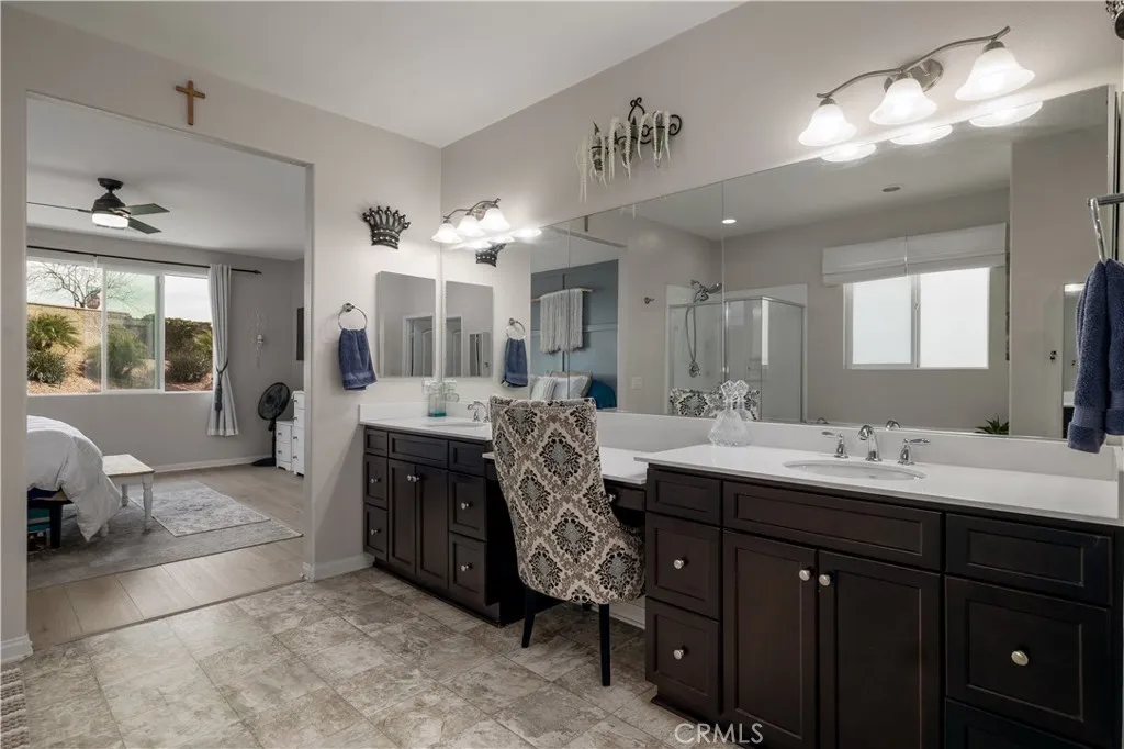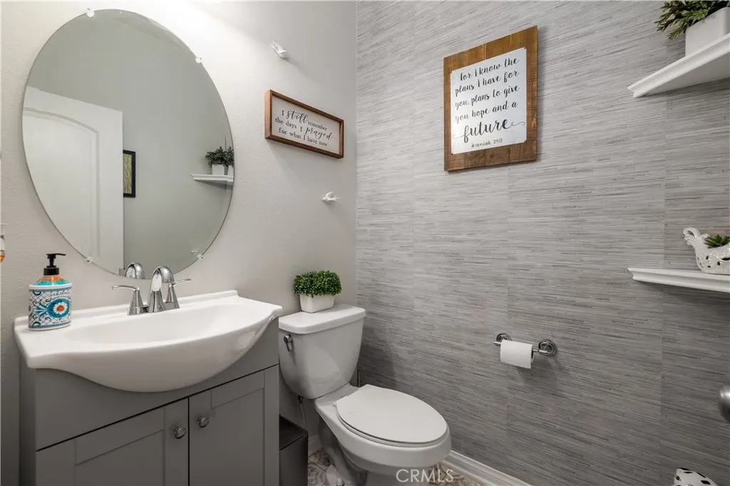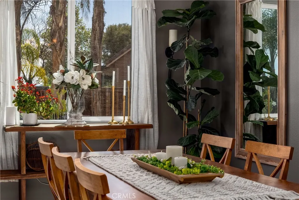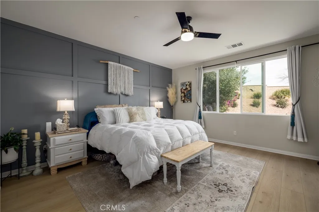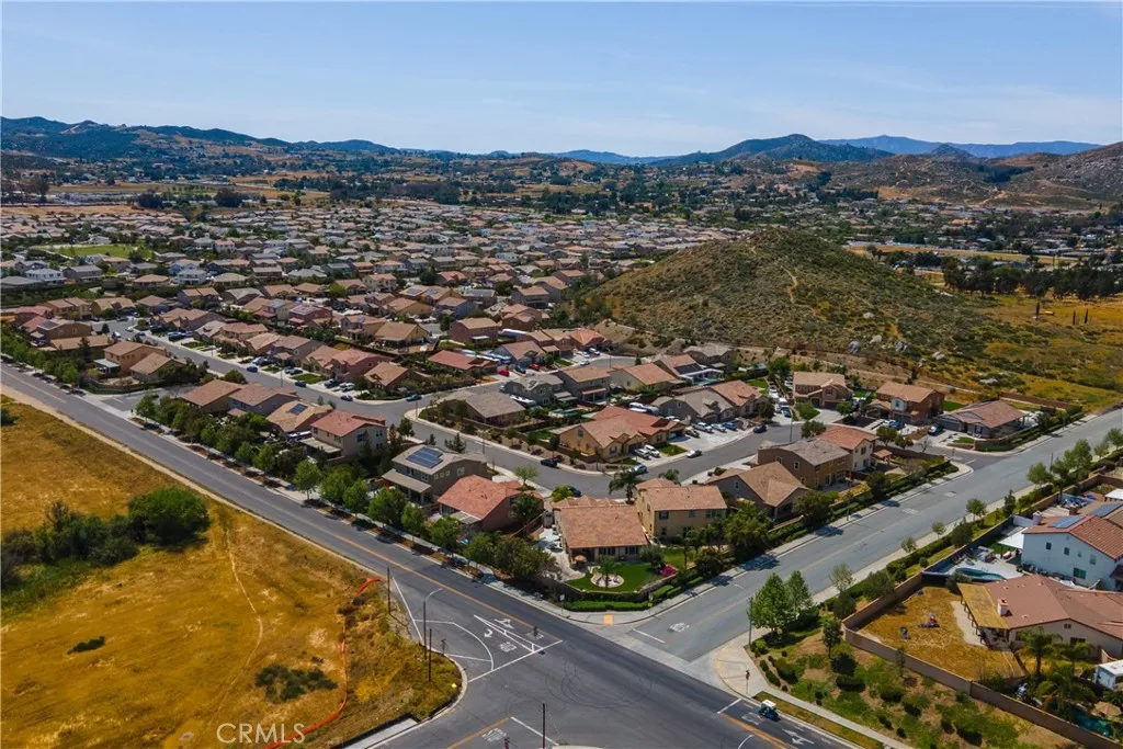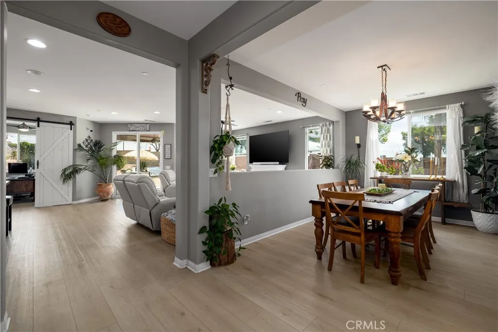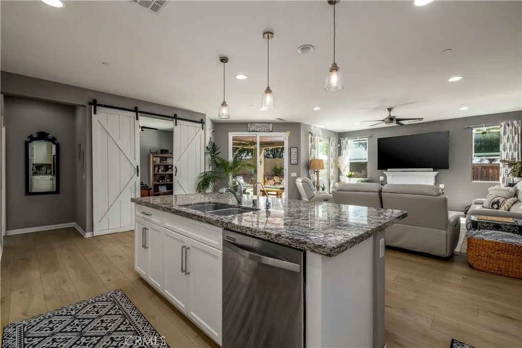 Your private backyard resort awaits on this rare oversized 12,197 sq ft lot with no rear neighbors in Menifee’s desirable Alasia community! Welcome to a beautifully maintained single-story home ideally situated at the bend where two streets meet, creating a unique homesite with extra space and added privacy. Step through the custom glass front door and immediately notice the impressive 70-inch wide hallway and new luxury vinyl plank flooring that flows throughout the home. Just off the entry are two bedrooms and a full bathroom, thoughtfully located on the opposite side of the home from the primary suite for privacy and flexibility. The heart of the home is the open-concept kitchen and family room, designed for everyday living and entertaining. The kitchen features granite countertops, an 8-foot island, walk-in pantry, 5-burner cooktop with oven, and newly resurfaced cabinets. A formal dining room and dry bar provide additional space for hosting gatherings, while a private office near the rear of the home features custom barn doors and peaceful views of the backyard. The primary suite is tucked privately at the back of the home and features a custom-designed accent wall, an oversized bathroom with dual sinks, soaking tub, and separate shower. The large walk-in closet offers direct access to the spacious laundry room, which also has a second entrance from the main hallway. A stylish half bath in the main hallway showcases custom tile flooring and designer wallpaper. Step outside and you’ll understand what truly sets this property apart. The resort-style backyard was designed for both relaxation and entertaining. Enjoy a saltwater pool and spa with a WiFi-controlled Hayward filtration system, a built-in natural gas BBQ grill, custom fire pit with surrounding seating area, automated outdoor lighting, and multiple gathering spaces. The expansive lot allows for the pool and patio area on one side while the other side offers a large grassy play area. A gentle landscaped slope with trees and plants adds beauty and privacy, creating the perfect stay-at-home retreat. Additional highlights include a whole-house water softener, reverse osmosis filtration system, tankless water heater, foam-insulated walls and attic, seismic-resistant foundation, hardwired smoke and carbon monoxide detectors, fire sprinkler system, ADT security system, irrigation drip system, leaf-filter rain gutters, and beautifully landscaped drought-tolerant front yard.