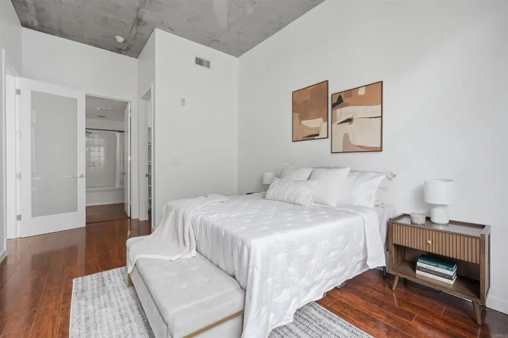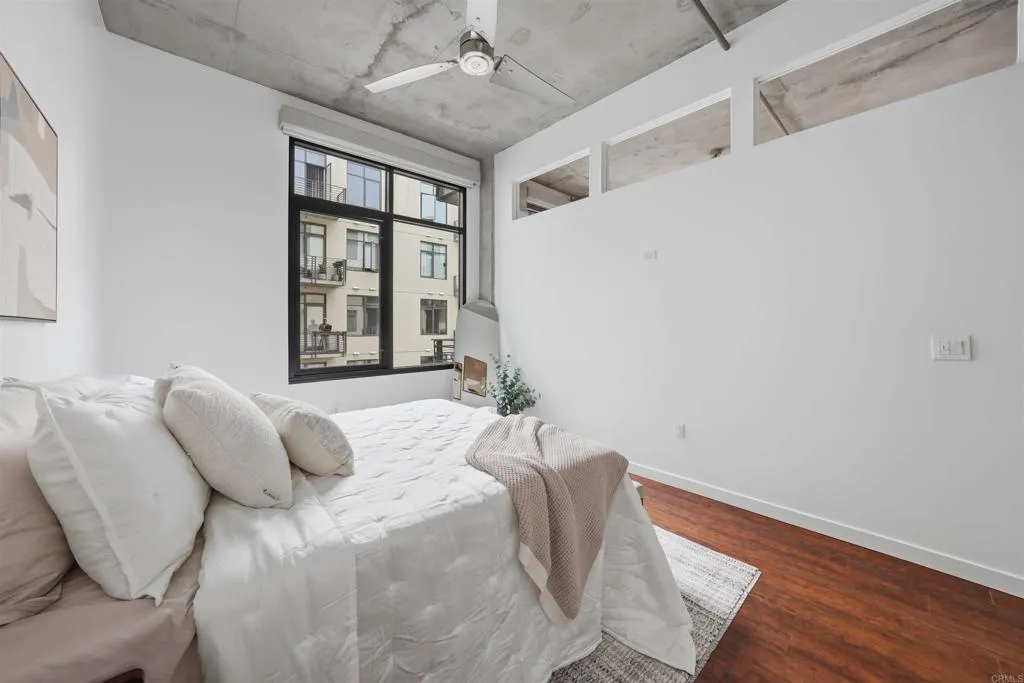 Welcome to Residence #525 at 1050 Island Ave, a beautifully updated 1 bedroom, 2 full bath home in the heart of downtown San Diego. Featuring 11 foot ceilings and oversized windows, this light-filled residence offers an open, airy layout with a modern industrial feel and the flexibility to add an additional bedroom. Rich wood flooring, motorized blackout shades, and stainless steel appliances create a space that is both refined and functional. Step out onto your private balcony overlooking the peaceful interior courtyard, offering a rare sense of calm in the middle of the city. Additional highlights include central AC, in unit washer and dryer, tandem parking, and an oversized private storage unit. Located just two blocks from Petco Park, you are within walking distance to restaurants, shopping, and everything downtown has to offer while still coming home to a quiet, cozy retreat. Residents of M2i enjoy a remodeled fitness center, two lobbies, a lush courtyard, and a rooftop patio with firepit and BBQs. This is downtown living at its best.