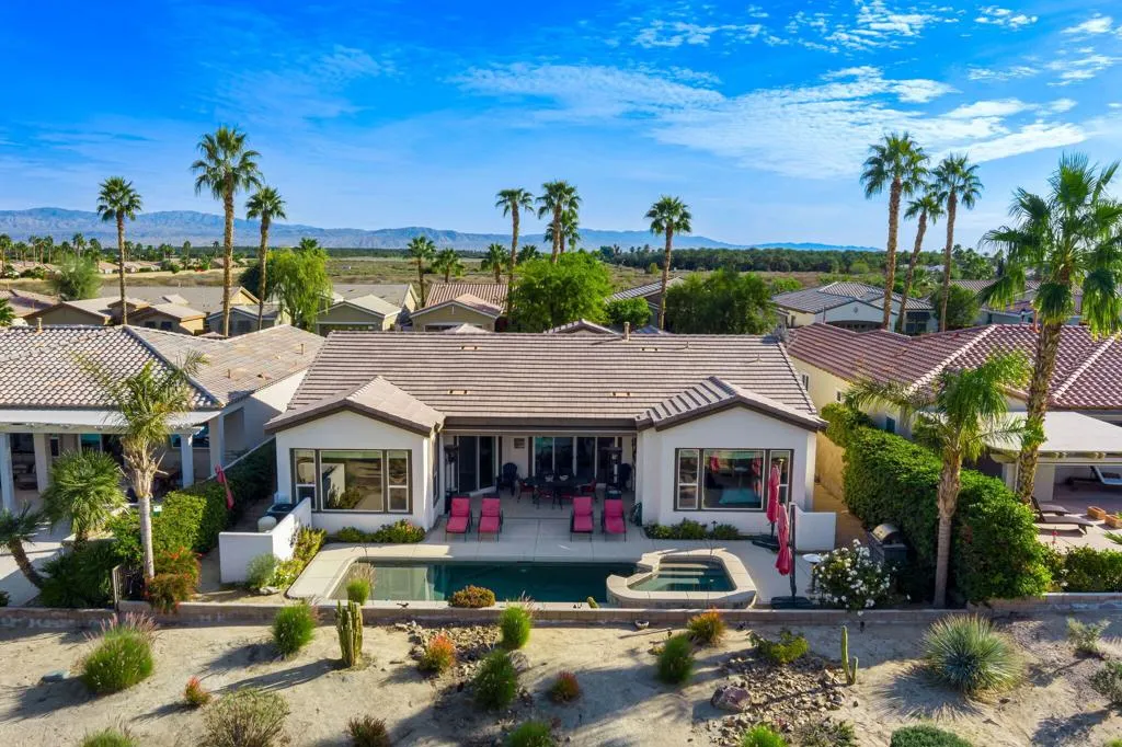Located on the 13th tee in the highly sought-after 55+ resort community of Trilogy at La Quinta, this beautifully designed Cassius floor-plan offers stunning golf course, mountain, and lake views along with exceptional indoor-outdoor living. Spanning approximately 2,482 square feet, the home features 3 bedrooms and 3.5 bathrooms, including an attached guest casita that is perfect for hosting guests or creating a private retreat. The open-concept floor plan is thoughtfully designed for both everyday living and entertaining, featuring a spacious great room with fireplace that flows seamlessly into the kitchen and dining areas. The kitchen offers ample cabinetry, generous counter space, and an ideal layout for gatherings, while the primary suite provides a peaceful escape with views and a well-appointed en-suite bath. Step outside to a private backyard overlooking the lush fairways, where you can enjoy breathtaking sunsets and the serene desert surroundings. Residents of Trilogy at La Quinta enjoy an unparalleled lifestyle with access to championship golf, a state-of-the-art fitness center, resort-style pools and spa, tennis and pickleball courts, clubhouse dining, and a full calendar of social events and activities, all set against the backdrop of the Santa Rosa Mountains. This is desert living at its finest, combining premier location, exceptional views, and the vibrant lifestyle that makes Trilogy one of La Quinta's most desirable communities.
