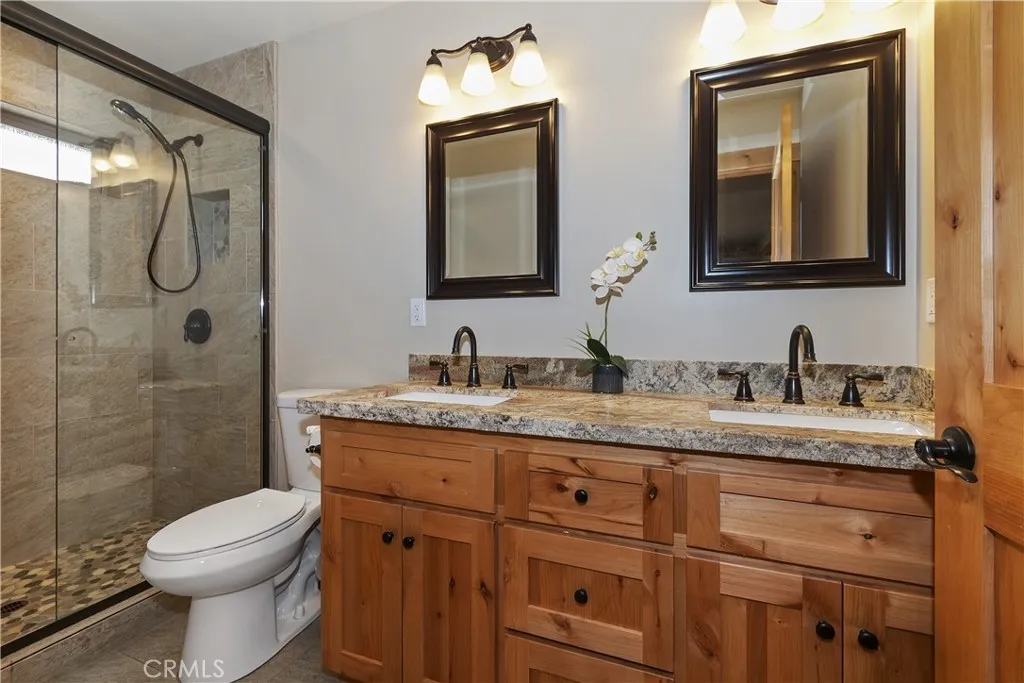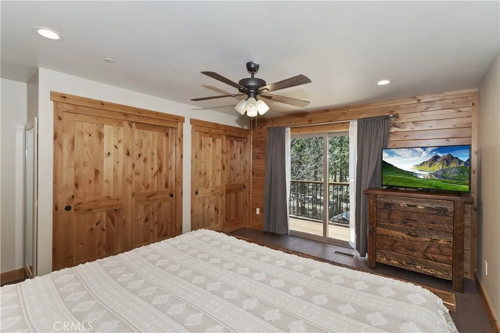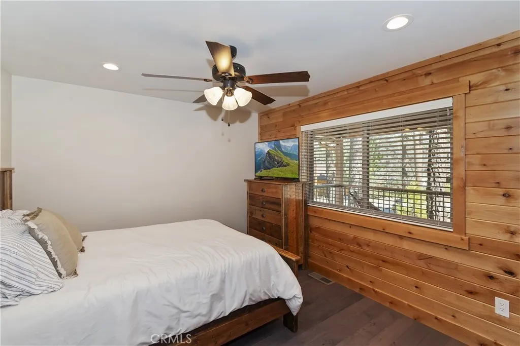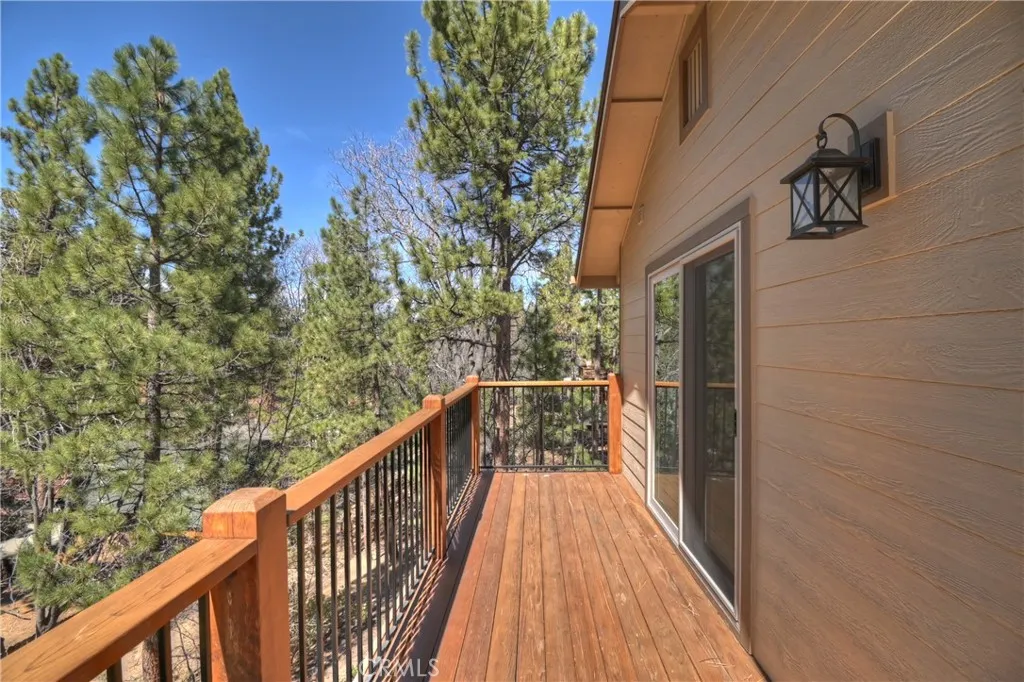 Stunning 2019 built, single story, level entry, mountain retreat in a prime central Big Bear Lake location ~ Experience refined mountain living in this exceptional custom-built home ~ It's had one loving owner and is ideally situated close to the top of a street that ends at the access to Town Trail and other Snow Summit trails, is just minutes from the ski slopes, Big Bear Lake, and walking distance to the Village ~ Featuring 1,613 square feet of open, light and bright living space, this home has 3 bedrooms and 2 bathrooms, and is thoughtfully designed with high-end finishes ~ The expansive great room showcases soaring vaulted Alderwood ceilings, rich engineered hardwood flooring, and an impressive floor-to-ceiling rock fireplace—creating a warm gathering space ~ The large kitchen is both elegant and functional, appointed with granite countertops with a live edge, large center island with lots of cabinets, custom Alderwood cabinetry, and stainless steel appliances, even has a dishwasher ~ It's perfect for entertaining or quiet evenings at home ~ The primary suite offers a slider out to the deck, large closet and ceiling fan ~ The master bath has double sinks, a beautifully tiled walk-in shower featuring a flat pebble stone floor and granite accents, and more gorgeous Alderwood cabinets ~ Step outside to enjoy the serene mountain setting from the covered front porch or the private rear deck, both redwood with wrought iron accents—ideal for entertaining beneath the pines ~ This home offers year-round recreation and luxury mountain living at its finest ~ Additional amenities include a tankless water heater, fully finished insulated garage with electric vehicle charging capability, and a striking exterior of low-maintenance siding accented by stone and shake detailing ~ This comfortable and solid home would make a wonderful primary residence or vacation home, and with its exceptional location and layout, it has a lot of short term rental potential.