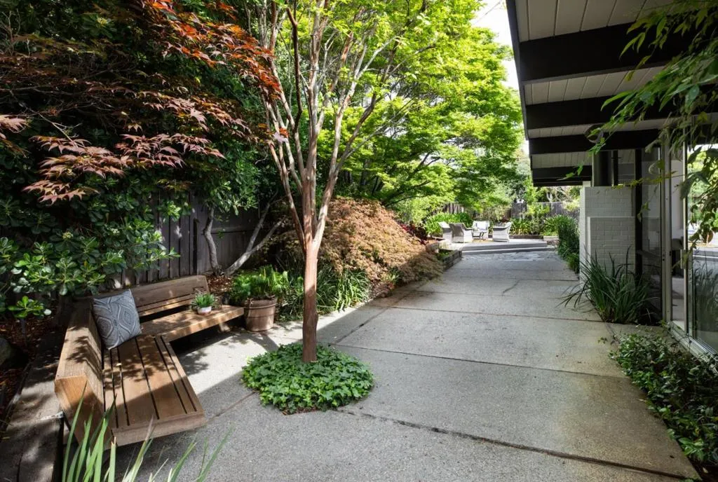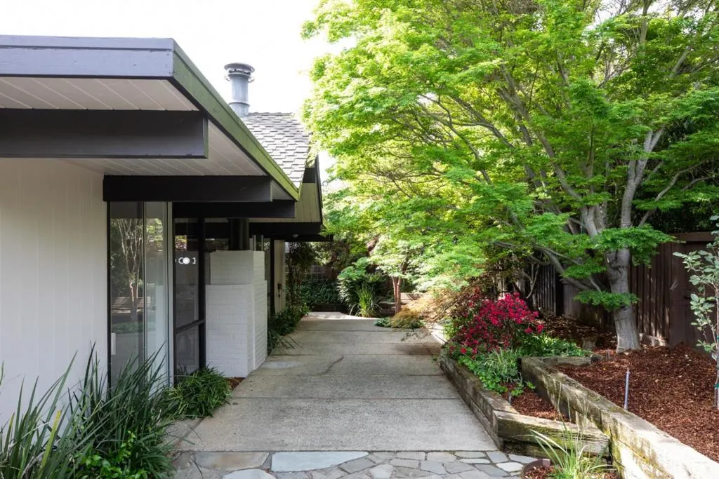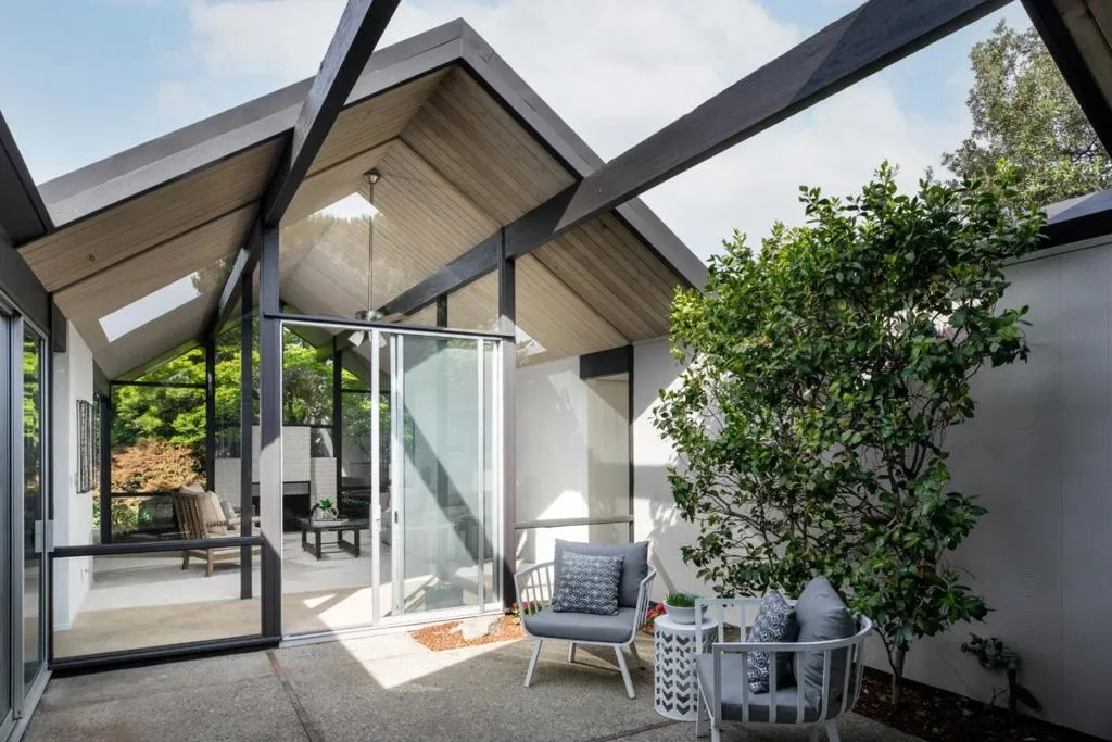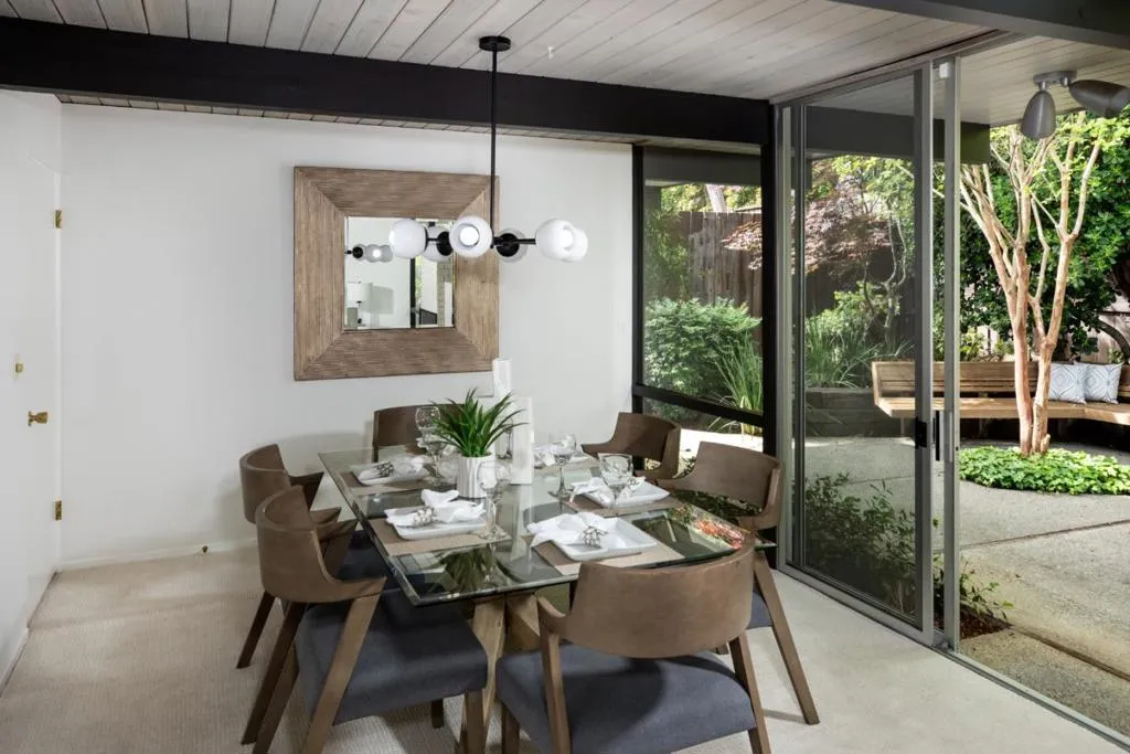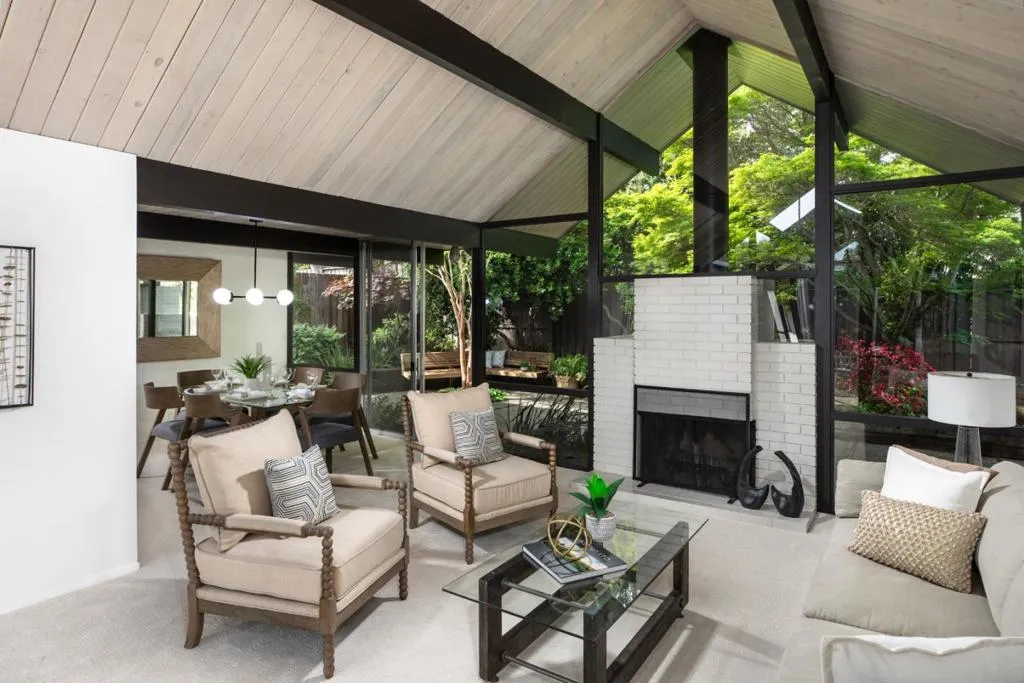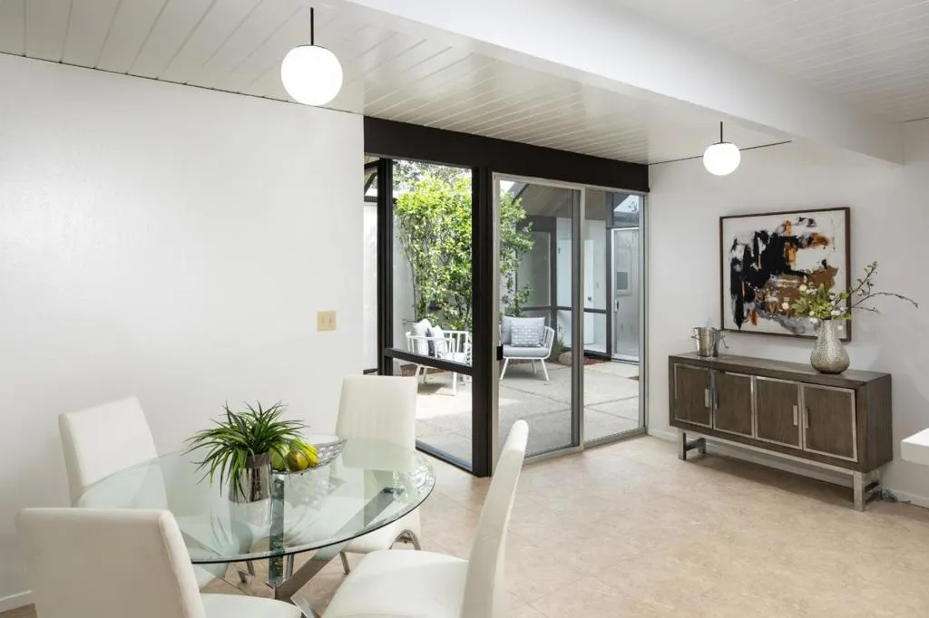 Welcome to this sleek mid-century modern home. Enter through the open-air atrium foyer which allows light to the center of this beautifully built Eichler home. One is greeted by the bright & contemporary living room with a wall of windows, floor-to-ceiling brick fireplace, white washed wood ceiling & dramatic post-&-beam architecture. Adjoining is the dining area with a sophisticated mid-century lighting fixture & views of the pristine garden. Open eat-in kitchen with a center island, skylight, globe lighting & spacious pantry. Adjacent to a convenient laundry area & access to the attached two-car garage. The property has been enhanced with fresh interior & exterior paint, new carpeting & lighting fixtures. The primary bedroom has access to the rear yard, walk-in closet, plus bathroom with new vanity, flooring and lighting. Tucked on a quiet cul-de-sac in coveted Ortega Park, on a private lot with mature landscaping, radiant heat, walls of glass & open-air atrium taking advantage of California's indoor/outdoor lifestyle. Top-rated schools: Stocklmeir Elementary, Cupertino Middle & Fremont High School. In close proximity to schools, Caltrain & Apple Park. A rare opportunity to own a preserved Eichler with timeless minimalist appeal and modern amenities.