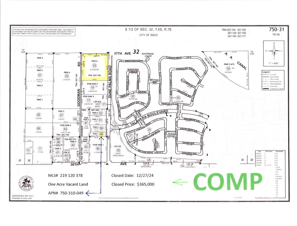 Perhaps the last chance to buy affordable acreage in Indio. 9.17 acres zoned DET-3 which allows up to 3 homes per acre plus ADUs (Accessory Dwelling Units) if desired. Minimum lot size is 10,000 s.f. Parcel is across the street from Talavera (820 homes) and close to Sun City Palm Desert. Owner motivated. Listing broker does not warrant the accuracy of the information provided. Buyer to do their own research and due diligence.