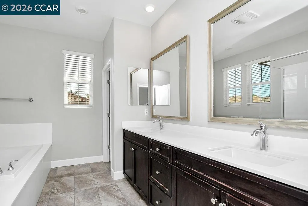 Step into a home where comfort, style, and modern convenience come together effortlessly. This beautifully maintained 4-bedroom, 2.5-bath two-story home, built in 2017, offers 1,958 sq ft of thoughtfully designed living space and true pride of ownership from the original owners. The upgraded kitchen features extended counter space, abundant storage, built-in wine and beverage refrigerators, stainless steel appliances, a farmhouse sink, and a gas range—perfect for everyday living and entertaining. The open, bright floor plan flows seamlessly with laminate flooring downstairs, tile in all three bathrooms, and plush carpet in the upstairs hallway and bedrooms. Interior walls and baseboards have been recently painted, creating a fresh, move-in ready feel. Upstairs offers a convenient laundry room and well-appointed bedrooms. The attached two-car garage includes a Tesla wall connector. Owned solar adds efficiency and savings. Ideally located near shopping and major commute routes, approximately 30 minutes to SFO and Oakland Airport. This is more than just a home—it’s a place to settle in, entertain with ease, and enjoy everyday living in a location that keeps you connected.