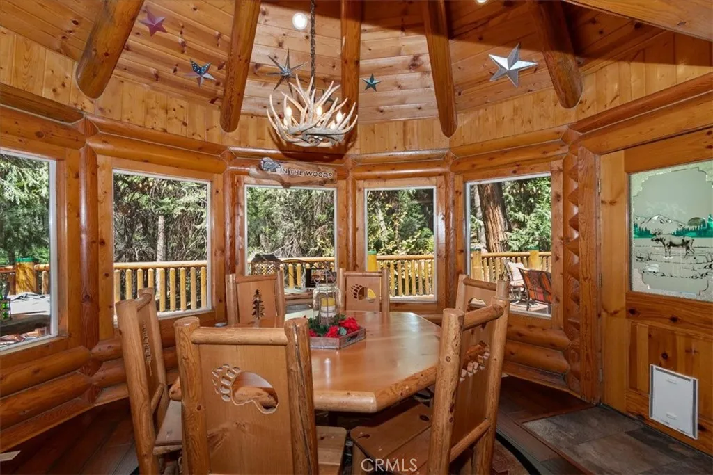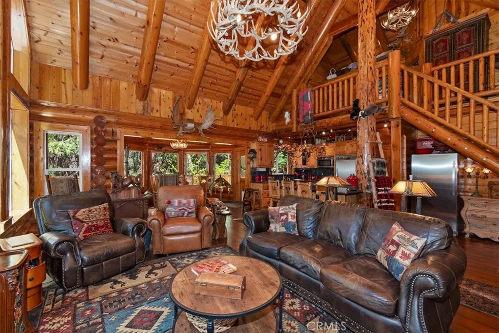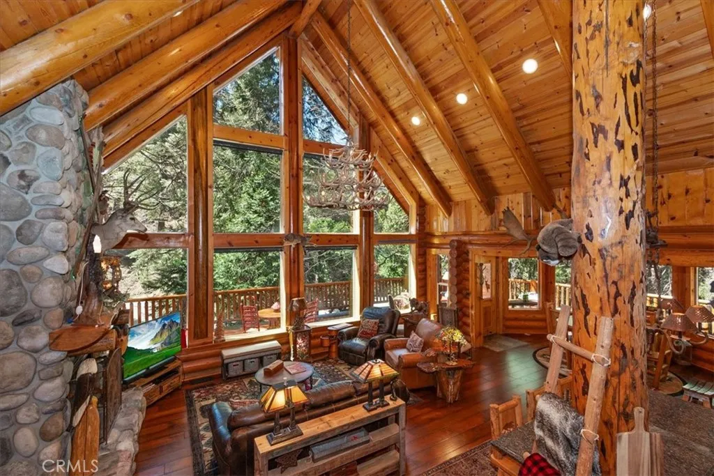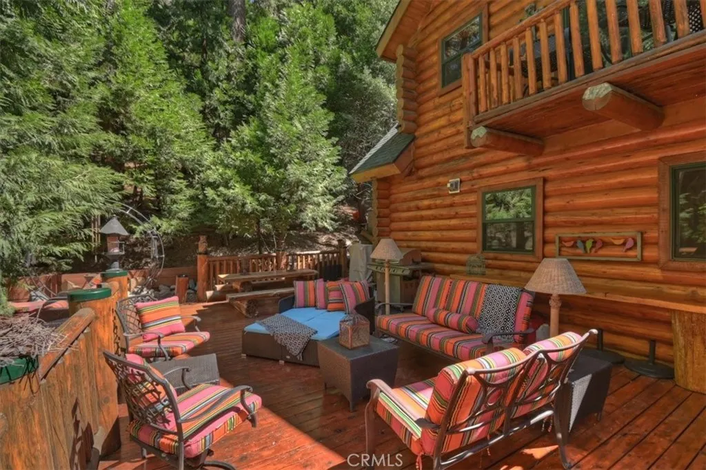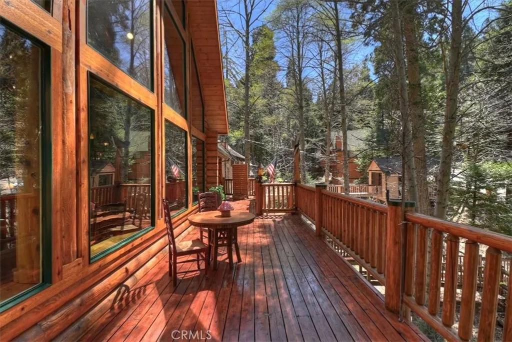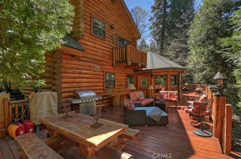 Nestled in the desirable Mountain Community of Lake Arrowhead, this custom log home with coveted lake rights offers the perfect blend of rustic charm and modern comfort. Featuring 3 bedrooms and 3 bathrooms, the home is designed for both relaxing retreats and year-round living. The spacious primary suite serves as a private sanctuary, complete with a cozy wood-burning fireplace and French doors that open onto a beautiful Cedar deck-ideal for enjoying serene forest views. Throughout the home, newer hardwood flooring adds warmth and continuity, while large double-paned windows invite in natural light and showcase the surrounding landscape. The open-concept living and dining area is anchored by a stunning, large stone fireplace, creating a welcoming gathering space for family and friends. The kitchen is thoughtfully appointed with granite and Corian countertops and stainless steel appliances, making it both functional and stylish. Additional highlights include a versatile loft, a generous 12,000 sq ft lot, and an expansive wraparound deck perfect for outdoor entertaining. Recent upgrades provide peace of mind, including a new roof, a new HVAC system, and a portable generator with a sub-panel. Set among towering Cedar and Elder Trees, with a seasonal creek running in front of the property, his home offers a tranquil mountain setting while remaining conveniently close to Lake trails, shopping, and dining. Whether you're seeking a full-time residence, vacation getaway, or investment opportunity, this property delivers a lifestyle of comfort, nature, and lasting memories.