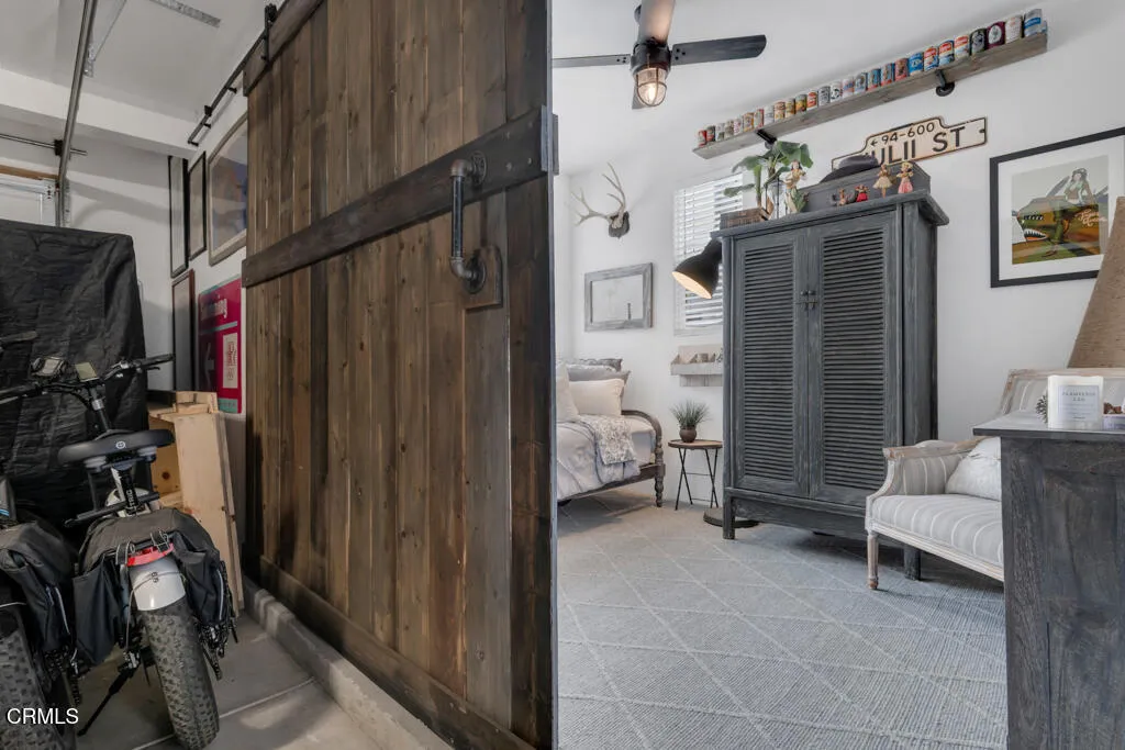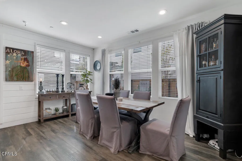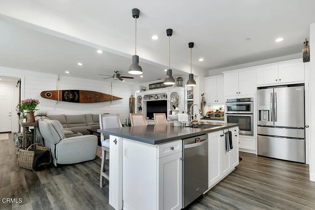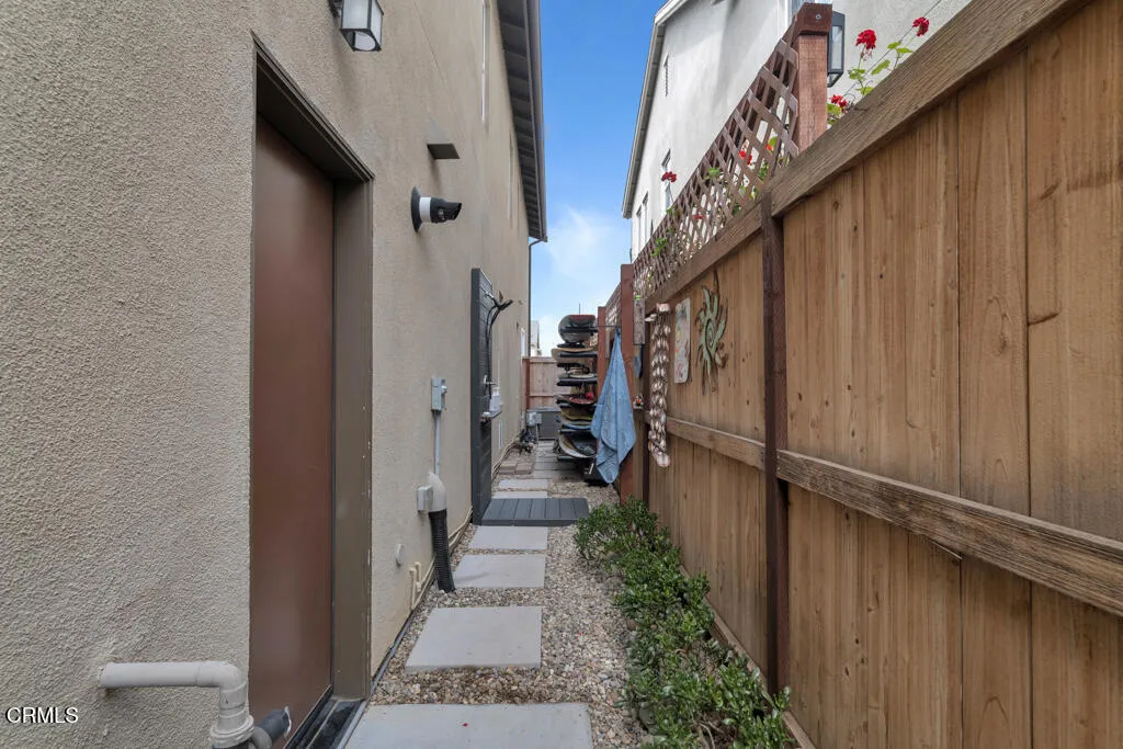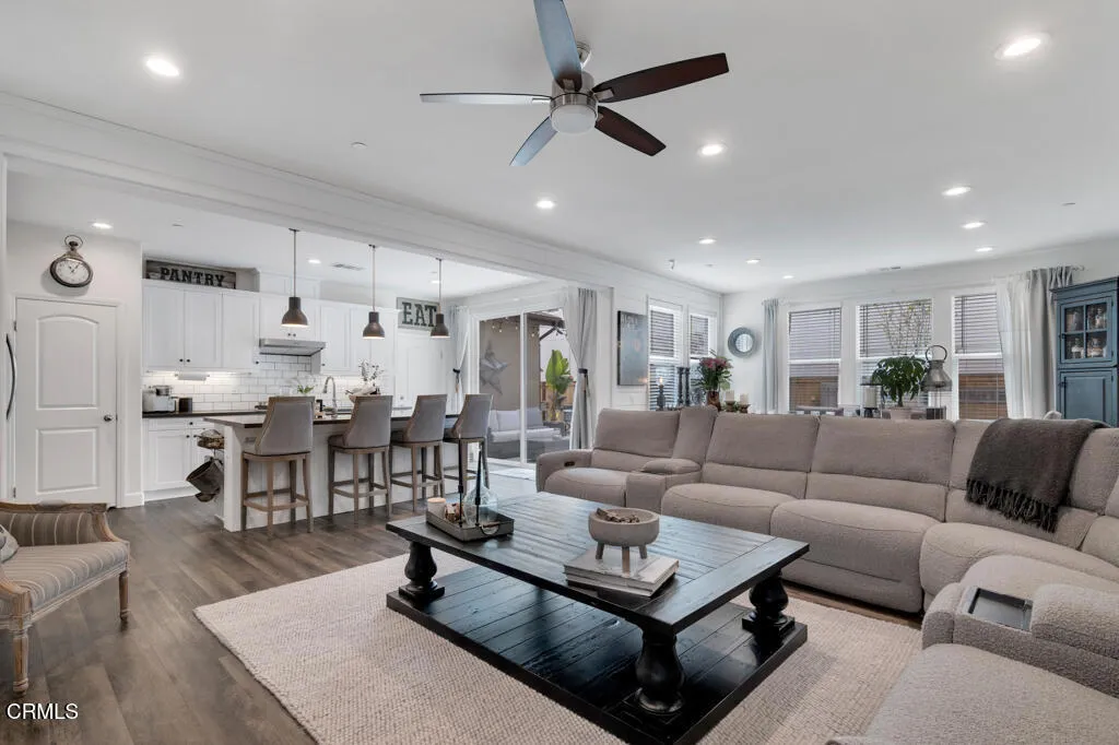 Some homes simply check the boxes. Others create a lifestyle. This Solana Heights home does both. Thoughtfully designed and tastefully furnished, it sits perfectly between the laid-back surf culture of Ventura's beaches and the scenic beauty of the Ojai mountains. Stepping onto the covered front porch feels warm and inviting. Inside, luxury vinyl flooring flows throughout - a clean, modern look while remaining durable for everyday living. At the heart of it all is the great room - w/ shiplap accent walls, it's a true gathering space designed for connection. The kitchen island, moody quartz counters, fun pendant lights, stainless steel appliances, and a crisp white subway tile backsplash bring together a sophisticated yet timeless kitchen design. The built-in oven, range top and hood, island sink, dishwasher and pantry make cooking feel effortless.Flexible spaces that adapt to your lifestyle include a bedroom and full bath w/ its own separate entrance and private gated side yard that can easily serve as a student studio or bachelor suite for potential rental income opportunity and a surprise bonus room w/ a lighted ceiling fan and sliding barn door offering additional space. Step outside to relaxed California living on a neutral paver patio w/ two pergolas and water feature. After a day at the beach, rinse off in the heated outdoor shower. The loft offers a moment to pause and catch a peek-a-boo view of the island and ocean and an ideal spot for relaxing in the evening or a play area for little ones while laundry runs in the nearby laundry room. The primary suite invites you to slow down -whether that means sinking into the soaking tub, enjoying the walk-in shower or taking in the mountain views. It's a space designed to recharge.Other features include a large walk-in closet in the master, built-ins for surfboards, tankless water heater, water softener, storage, community dog park, playground, picnic areas and easy access to downtown and bike paths leading to the beach and the Ojai Valley. Spend the morning surfing, the afternoon riding bikes through the preserve, and the evening relaxing on your festively lit patio or entertaining friends and family.This isn't just a home - it's Ventura living at its best. Tastefully furnished, it's ready for you to begin enjoying the lifestyle immediately.