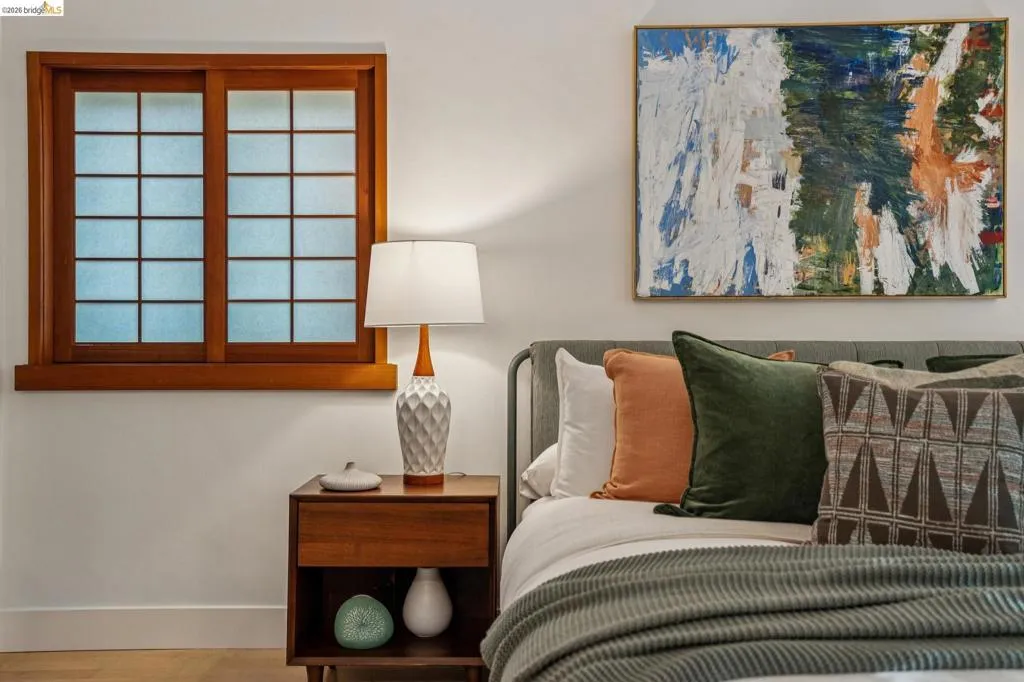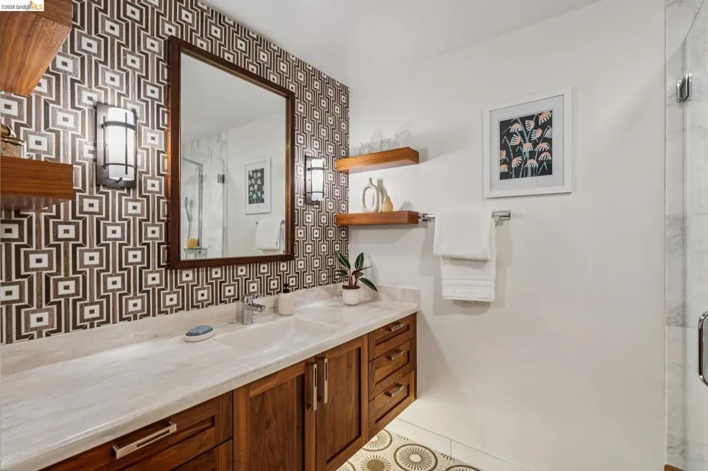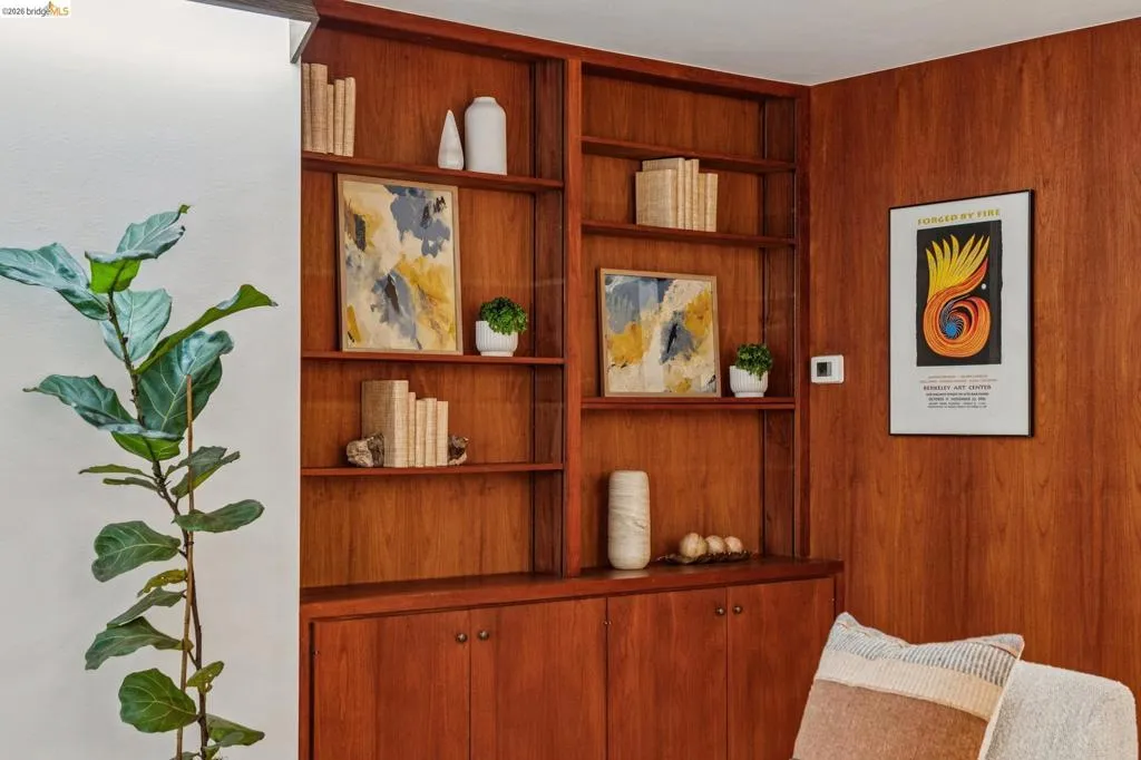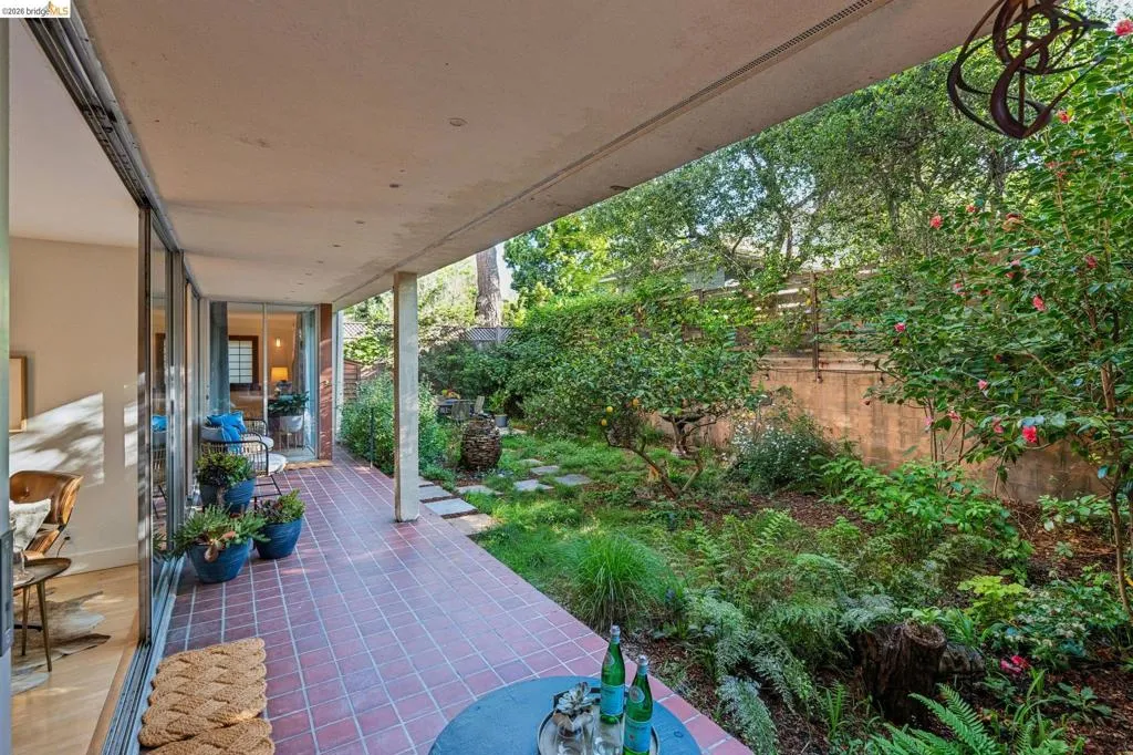 Experience luxurious, all-level living in one of Berkeley's most coveted locations. This expansive Mid-century residence offers a sophisticated retreat in the heart of walkable North Berkeley, just steps from the famed Gourmet Ghetto. As one of only two units with a private garden, it is professionally landscaped featuring two soothing water features and offers a truly serene environment. Situated on the quiet, garden-facing side of a rare elevator building, this unit has two spacious bedrooms—including a primary suite—and two bathrooms. The home is anchored by an exceptional eat-in kitchen featuring exquisite cabinetry, stone counters, intricate tile work and high-end appliances. This culinary heart opens to a spacious dining area with cove lighting and a living room with original wood built-ins, all featuring floor-to-ceiling doors that invite natural light and provide access to a private lush garden and patio spaces. Two beautifully remodeled baths with artisan tile and incredible finishes and fixtures. Maple flooring is installed throughout the unit as are unique Hubbardton Forge lighting elevating the spaces. Additional amenities include two gated garage spots, a large storage unit, a community room and a roof-level event space with spectactcular SFbay views! BESO Exempt.
