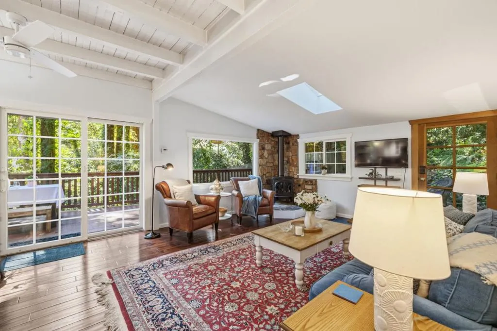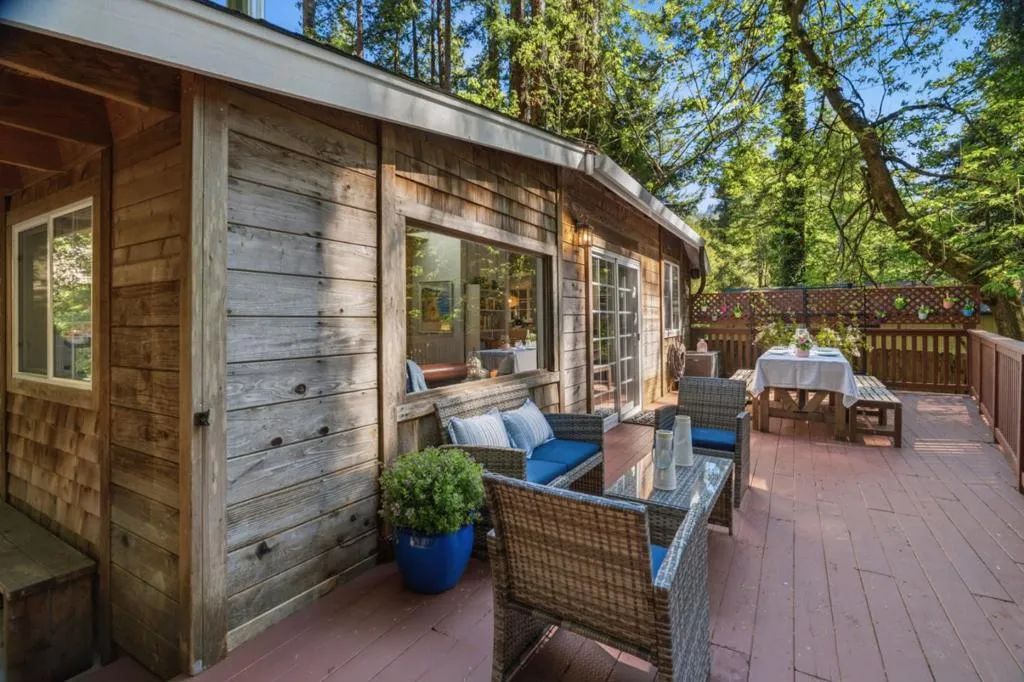 Tucked among the redwoods and set back from the road, this remodeled mountain retreat offers privacy, charm, and a remarkable story. Originally built in 1905 by early Brookdale resident Virginia Garland Ballen, a naturalist, writer and contributor to the movement that helped preserve Big Basin Redwoods, this home was known as 'The Call of the Wild' where Virginia hosted gatherings of writers, artists and early conservationists inspired by the Santa Cruz Mountains. Today the home blends that historic character with modern comfort. Vaulted ceilings, skylights, wood floors and a stone hearth create a warm and inviting living space while the updated kitchen features stone countertops and modern appliances. Outdoor living is central to the property with multiple seating areas, a large entertaining deck, a hot tub beneath the redwoods and a detached studio ideal for an office, art space, or guest overflow. The fully fenced property offers parking for multiple vehicles and a seasonal babbling brook that adds to the peaceful setting. This move-in ready home offers a rare blend of history and comfort just a short drive to Boulder Creek, Santa Cruz, the beaches, and hiking in Big Basin and Henry Cowell. A unique opportunity to own a piece of history in a setting that continues to inspire.