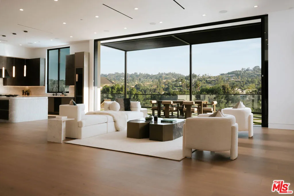 Welcome to a truly exceptional estate in the prestigious Royal Oaks enclave of Encino, where elevated design, breathtaking views, and modern luxury come together seamlessly. Meticulously curated materials and finishes are showcased throughout this five bedroom plus an office, nine bathroom residence. Upon entry, soaring ceilings, expansive walls of glass, and a light-filled open layout create a seamless connection to the surrounding landscape. A striking titanium gold staircase with an integrated water feature serves as a sculptural centerpiece, setting the tone for the level of design and detail carried throughout. The formal dining room is complemented by a temperature-controlled wine cellar, while a nearby powder room is finished in Brazilian green marble, adding a refined touch. The culinary experience is elevated through a dual-kitchen concept. The main kitchen showcases a fluted natural stone island and white onyx countertops paired with custom German cabinetry, finished with aluminum and leather accents. A secondary kitchen provides additional functionality, ideal for both everyday living and entertaining. The primary suite serves as a private sanctuary, capturing stunning views and offering a spa-inspired bathroom with bookmatched stone. Designed for both wellness and entertainment, the home features an indoor sports court ideal for racquetball or basketball, a game room, and a fully equipped fitness area with a red light sauna and cold plunge. A private theater and expansive entertainment level with a custom bar finished in agate blue stone create the perfect setting for hosting, seamlessly opening to outdoor living spaces. The outdoor setting features an infinity edge pool, and a rooftop deck, all designed to enhance the overall sense of luxury and relaxation. This new construction estate offers a rare combination of scale, design, and lifestyle in one of Encino's most sought-after neighborhoods.Additional features include a five car garage with high ceilings, elevator, and Control4 smart home automation system.This is a rare opportunity to own a statement property where design, views, and lifestyle converge at the highest level.