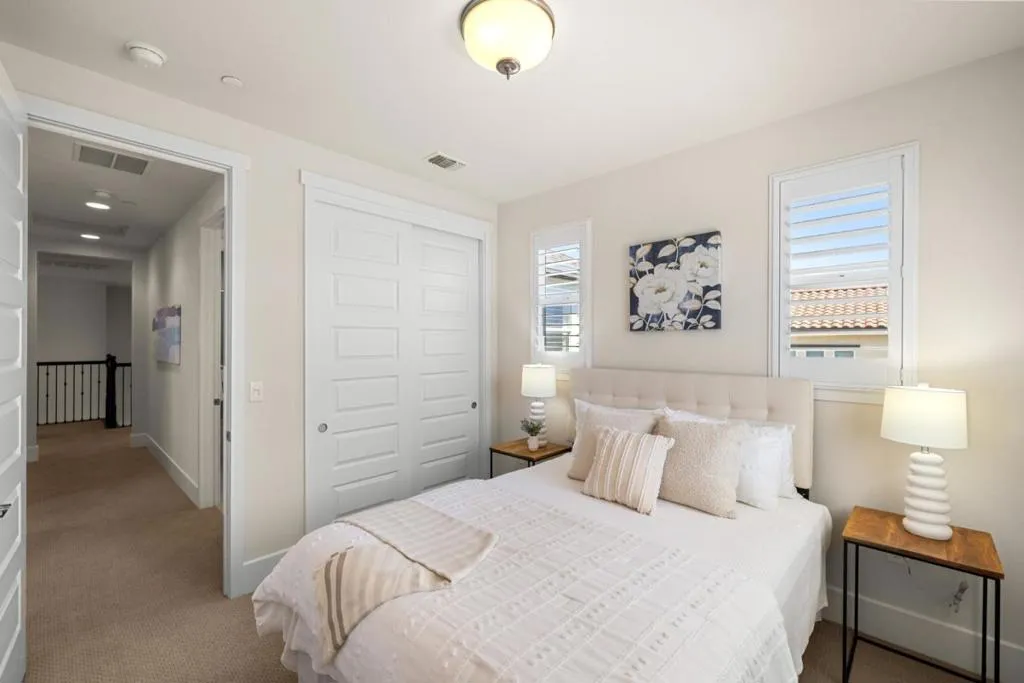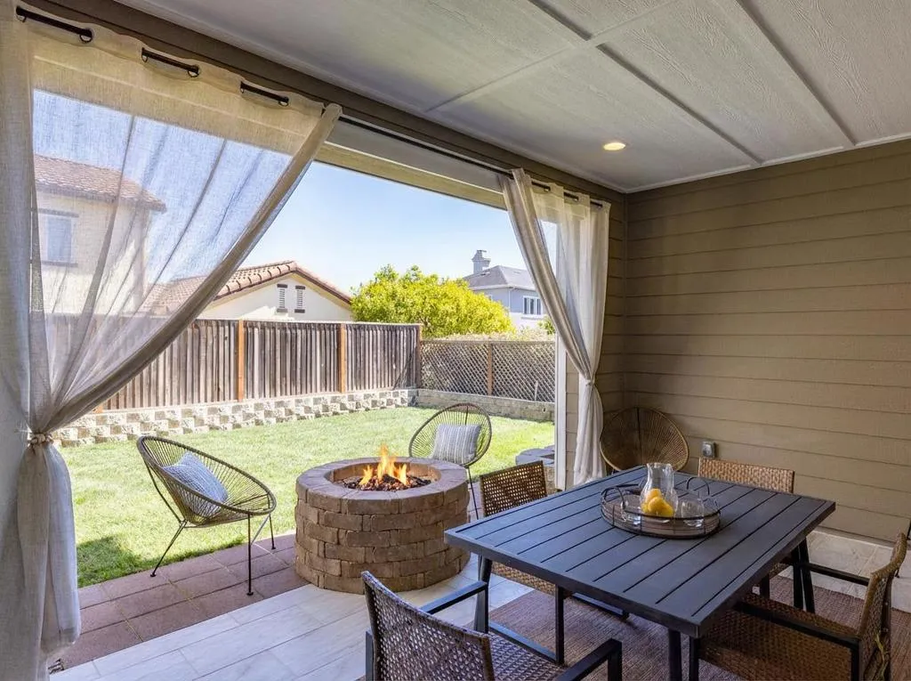 East Garrison remains one of the few new home developments within easy reach of the Monterey Peninsula. Warren Avenue is a wide, sun-drenched street where the community's signature pride of ownership resounds through every manicured yard, and residents enjoy a sprawling park just seconds away. This immaculate home is on the market for the first time since it was built, and it appears in true showroom condition. Step inside, and sense the grand scale immediately. An open concept living and dining area flows into a gorgeous kitchen and, through windows lining nearly every wall, the fenced backyard with its built-in fire pit and covered patio is visible from the moment you walk through the front door. Dark wood cabinetry, granite countertops, a cream tile backsplash, a massive pantry, a five-burner gas range, and a breakfast bar fill a kitchen to satisfy the most discerning chefs. A wide carpeted staircase sweeps up to a second level with three bedrooms and a lofted bonus space or home office. But the true discovery appears before you ever enter the home: a curtained outdoor sunroom off the front porch, custom-built and lit naturally by massive square-paned windows. Pull back the drapes on a sunny afternoon, set down your coffee, and feel the luxury of a home that wants for nothing.