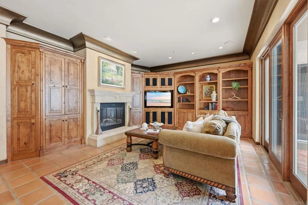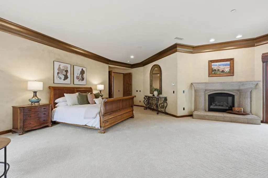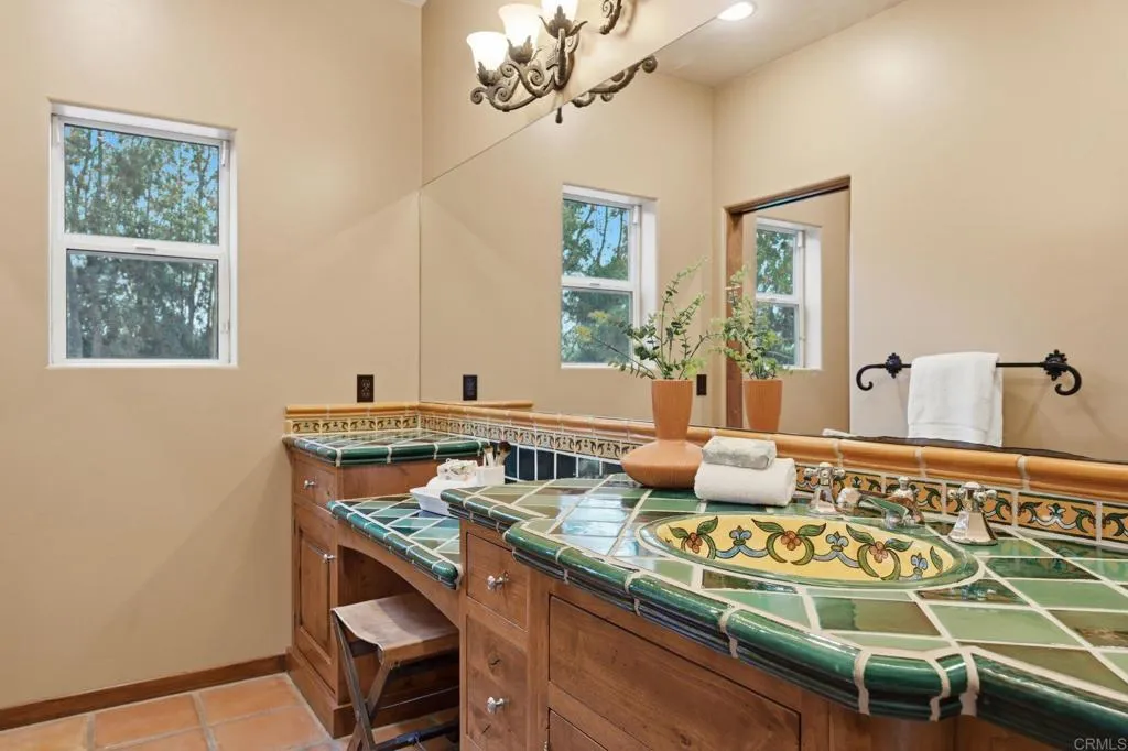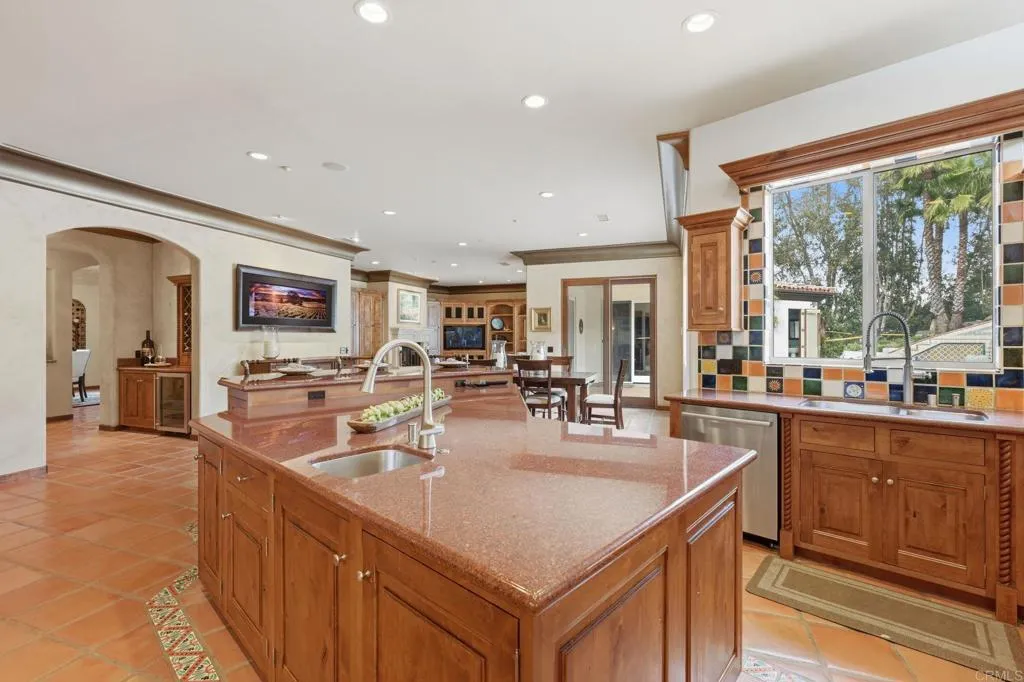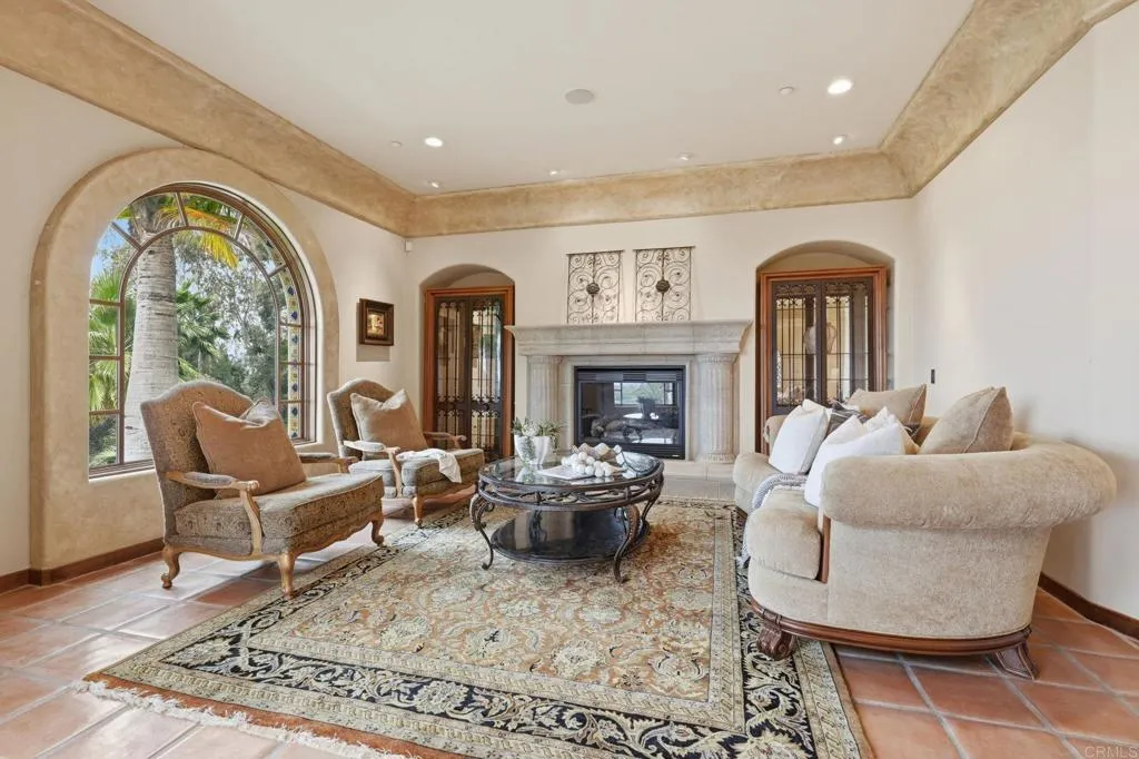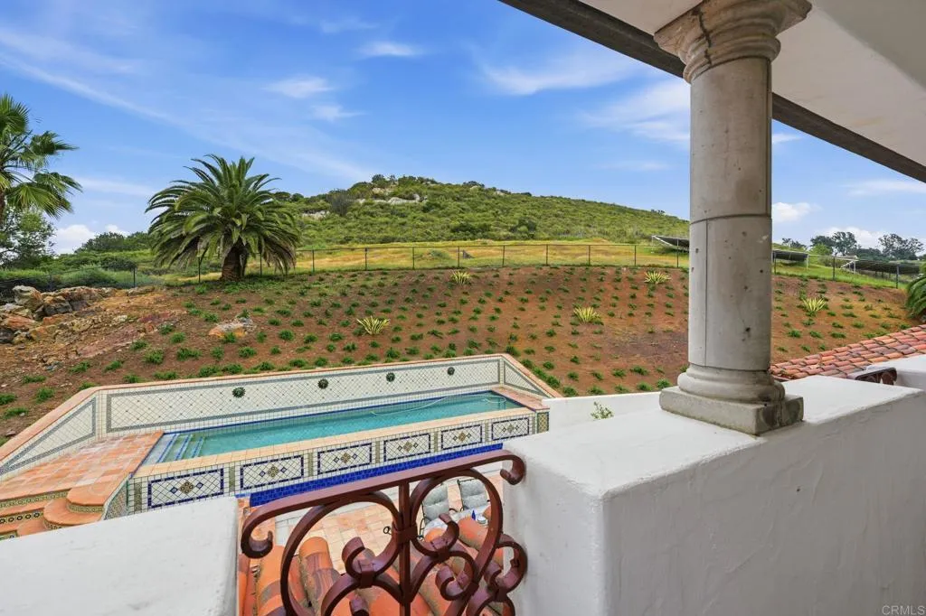 Enjoy panoramic views from this custom Spanish/Mediterranean-style Olivenhain hilltop estate. The home features high-end finishes, a grand two-story foyer, elegant living and dining rooms with arched windows with lovely views to the west, Saltillo tile flooring, and imported kitchen and bath tiles. The main floor offers a spacious primary suite with two patios, luxurious bath, walk-in closet, a separate office with private entrance, guest ensuite, large kitchen with premium appliances, and family room with Alderwood built-ins and fireplace. Upstairs includes a second primary ensuite, additional bedroom, theater room (convertible to a bedroom), and library with Juliet balcony overlooking the foyer. 2 AC units and owned solar. The fully fenced backyard has a pool, spa, and solar system. The acerage allows space for amenities like a sport court, stable or orchard. There is also an approximately 1,300 sq ft 4-car garage with storage in this private hilltop estate.