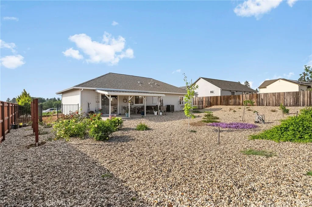 Built by local Paradise contractor West Construction and thoughtfully improved upon by its first owner, this move-in ready home offers quality construction and added enhancements throughout! This attractive home is located in lower Paradise in the highly desirable Circlewood neighborhood and just 8 miles from Chico for an easy commute. Offering 1,771 sq ft, this 3-bed, 2-bath home features a well-designed open floor plan with 9-foot ceilings throughout and a 10-foot tray ceiling in the living room, creating a spacious and functional main living area. Interior highlights include Charter Oak luxury vinyl plank flooring, 5-inch baseboards, and recessed LED lighting throughout. The kitchen is equipped with a 7-foot breakfast bar, granite slab countertops, glass tile backsplash, walk-in pantry, stainless undermount sink, shaker-style cabinetry with dovetailed soft-close drawers, natural gas range/oven, built-in microwave, and dishwasher. The adjacent dining area opens to a covered 10x20 concrete patio and a fully fenced backyard. Additional features include central heating and air, plus a QuietCool whole house fan, tankless water heater, and a dedicated laundry room with gas & electric dryer hookups. Guest bedrooms are spacious, and the guest bath includes a granite vanity and tub/shower combination. The primary suite offers a walk-in closet, dual sink granite vanity, step-in shower, and a 7-foot “catio” run attached to the bedroom window. The oversized finished two-car garage features an epoxy floor and 5-inch baseboards and houses the whole house water softener system. The property also provides extensive RV/boat/trailer parking with full RV hookups. Exterior amenities include a covered back patio with water and power for year-round use, fenced and cross-fenced backyard with a cross-fenced dedicated side yard, and fully landscaped grounds with weed barrier, decorative rock, and established plantings including "showcase roses" all on a timed drip system. The front yard includes a lawn with timed sprinklers, solar driveway lighting, motion lights at front and rear, a new full-size flagpole, and a 10x10 storage shed alongside the garage. This property is designated as a “Firewise” home within a "Firewise neighborhood", with fire-safe construction and landscaping designed to support favorable insurance options for the area. Located among other quality custom homes, this is the perfect opportunity for a "better than new" home in a desirable Paradise setting.
