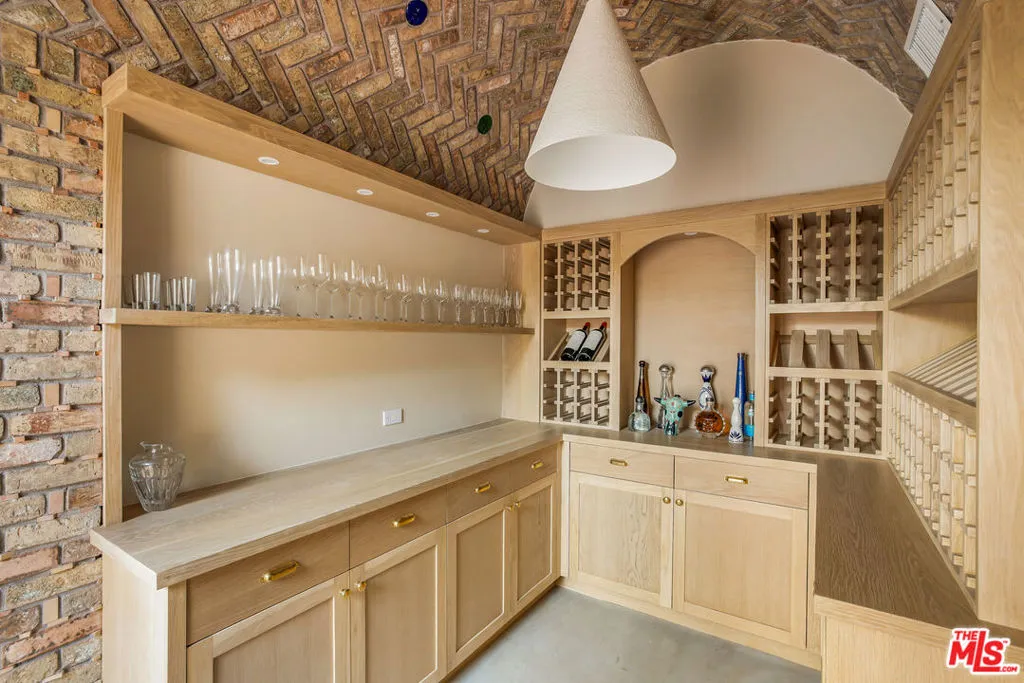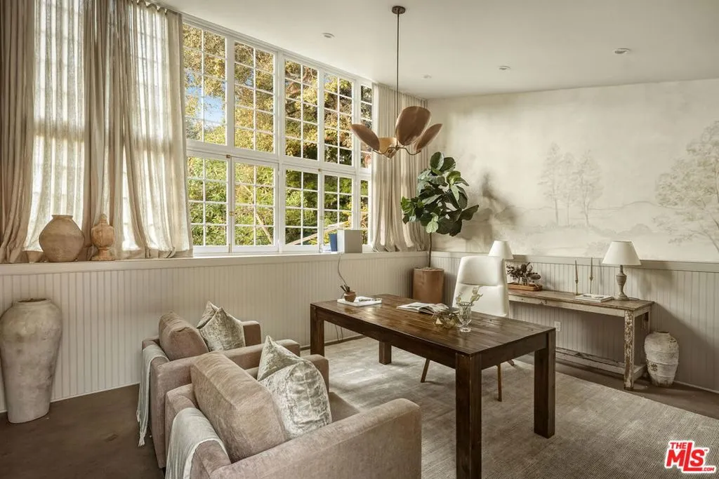 Nestled at the end of a long gated drive in Lower Mandeville Canyon, La Casa De Flores is a Spanish Revival estate of rare provenance and timeless beauty. Designed in 1929 by acclaimed architect John Byers and thoughtfully reimagined for modern living, the home sits on nearly an acre of lush, secluded grounds, offering an atmosphere that feels both grand and deeply inviting. Inside, the craftsmanship of the original era remains intact -- with wood-beamed and coffered ceilings, rich hardwood floors, graceful French doors, and hand-crafted casement windows. Sculptural designer lighting fixtures punctuate the interiors, enhancing the interplay of light and texture throughout. The formal living room, framed by garden views, is anchored by a stone fireplace and crowned by thick, solid wood beams. The formal dining room opens to verandas on both sides, creating effortless flow for gatherings, while the warm, inviting family room is wrapped in custom built-ins. The fully remodeled gourmet kitchen blends elegance and function with stone countertops, custom cabinetry, and an expansive dual-surface marble and butcher block island. A Lacanche range sits within a bespoke alcove, complemented by a walk-in pantry. Adjacent, the glass-topped atrium breakfast room dazzles with direct access to the outdoor kitchen and al fresco dining patio outfitted in vibrant Spanish tile and an original fountain. The primary wing offers a serene retreat with a private covered balcony, far-reaching canyon vistas, a corner fireplace, and a designer walk-in dressing room. Its en suite bath, bathed in natural light, features dual marble vanities and a custom-tiled shower. Four additional guest suites, including two joined by a Jack-and-Jill bath, provide comfort and flexibility. A detached office with a tranquil handpainted mural and expansive windows offers an inspiring workspace, while a coved wine cellar adds an indulgent touch. The grounds are a true sanctuary -- mature fruit trees, flowering gardens, peaceful fountains, and sweeping lush views frame a 55-foot swimmer's pool, brick patios, and a pergola lounge with firepit. Accessory structures and a three-car garage complete this rare and private compound, just moments from Brentwood's finest restaurants, boutiques, and top-rated schools. Blending architectural pedigree with modern comfort, La Casa De Flores is not merely a home -- it's a priceless work of art in one of Los Angeles' most coveted neighborhoods.