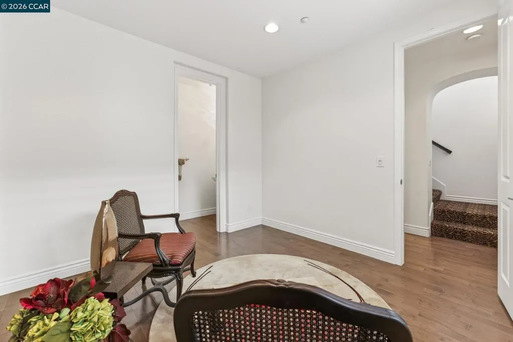 Enter through a private, landscaped courtyard to find a tranquil tiered fountain and then into this beautifully appointed 3-bedroom, 2.5-bath townhome offering approx. 1,730 sq ft in the heart of San Ramon. Mediterranean-inspired details, including arched doorways, wood-style flooring, and plantation shutters, create a warm and refined feel throughout. The spacious great room with fireplace offers flexibility for everyday living and entertaining. A private balcony is ideal for BBQs with easy access to the kitchen featuring a gas range, granite countertops, a generous island with storage, and built-in hutch with workspace. The adjacent dining area is light-filled and welcoming. The primary suite offers a walk-in closet, dual vanity, glass-enclosed shower, and French doors to a Juliette balcony. Secondary bedrooms are generously sized, including one with walk-in closet and courtyard views. Additional features include recessed lighting, designer accents, and attached 2-car garage. Ideally located near top-rated SRV schools, Mosaic pool, City Center, shopping, dining, HWY 680, Iron Horse Trail, and Dublin BART.