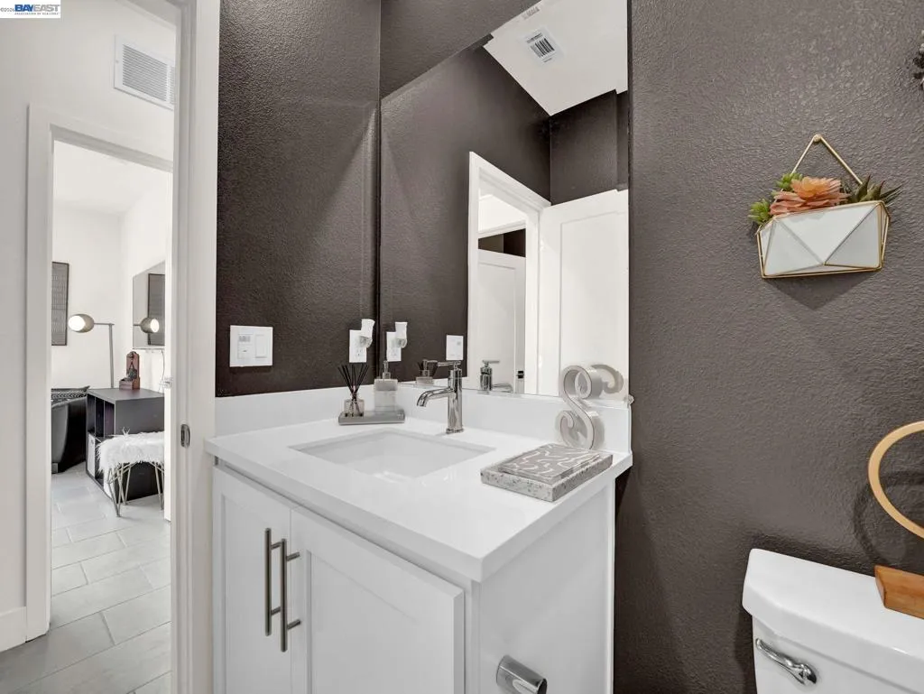 Situated in the highly desirable Bayshores community of Newark, this beautifully designed three-level home offers a bright, open floor plan with modern finishes throughout. The main living area is filled with natural light and features open-concept living and dining with smart automatic shades. The chef-inspired kitchen includes white shaker cabinets, granite countertops, subway tile backsplash, stainless steel appliances with a gas range and griddle, a spacious pantry, and a large island with breakfast bar seating, plus sliding door access to a private balcony. The main level also offers a guest bedroom or office, full bath, and laundry room. The expansive primary suite features a large walk-in closet and spa-like bath with dual sinks, soaking tub, and separate shower. Two additional bedrooms share a hall bath. Additional highlights include a finished two-car garage with EV-ready setup, central A/C, owned solar, and smart upgrades including a water shutoff system. Community amenities include a clubhouse, pool, dog park, and playground with easy access to shopping, dining, Hwy 84, Dumbarton Bridge, Hwy 880, and major tech employers.