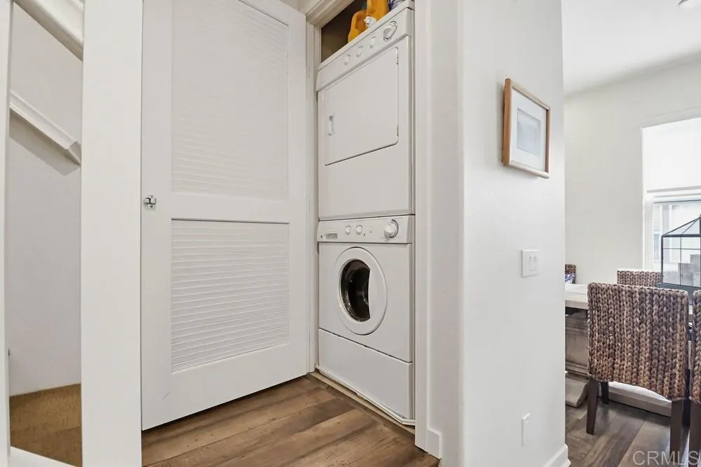 Nicely upgraded 2 bedroom condo in Solaire complex. Professional window coverings with black out shades in both bedrooms. Built in wire ceiling racks for overhead storage in 2 car garage plus extra storage area. Recessed lighting throughout the house with dimmers. Stacked washer /dryer in unit Ceiling fans in both bedrooms and family room. The gourmet kitchen offers a center island, granite countertops and stainless steel appliances. Tiled backsplash above kitchen sink with decorative shelves. Luxury vinyl wood-look flooring throughout living areas. Community amenities include a swimming pool, spa, and an outdoor barbecue area. Current tenant will be vacating late June. Unit will be available July 1st.