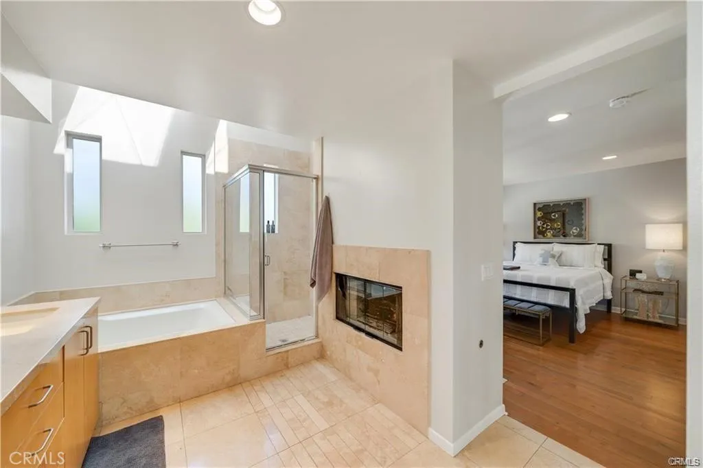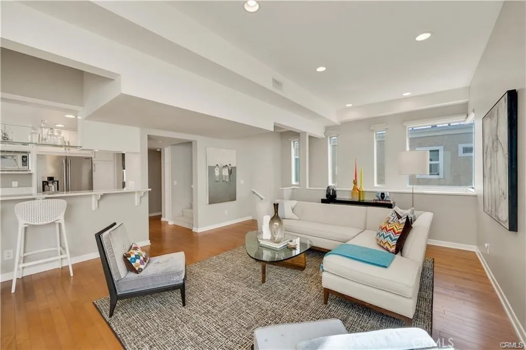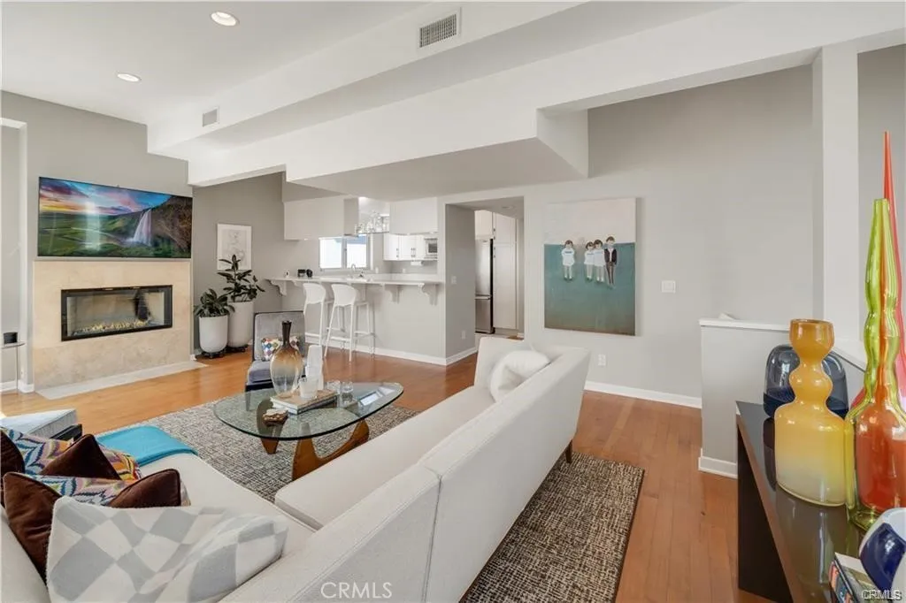 Stunning rear unattached condo on Poinsettia- a beautiful Corona Del Mar tree lined street. Built in 2005, this Strickler designed home is exceptionally light and bright, with no large homes on either side. With numerous windows, the ocean breeze and sun pour through this freestanding back unit. Enjoy the contemporary architectural details throughout as well as hardwood and travertine floors throughout the main floor. The completely upgraded kitchen includes stainless appliances, and flows perfectly into the living room with high ceilings as well as a cozy fireplace. Cook and entertain simultaneously! Large master suite is connected to the luxurious master bath by a duel fireplace. Enjoy the impressive separate soaking tup and shower. Spacious second bedroom, and full bath is upstairs with glass tile countertops. Direct access to the rooftop deck with peek-a-boo ocean views by day and twinkling lights by night. Enjoy this amazing Corona Del Mar condo and all the Village has to offer!