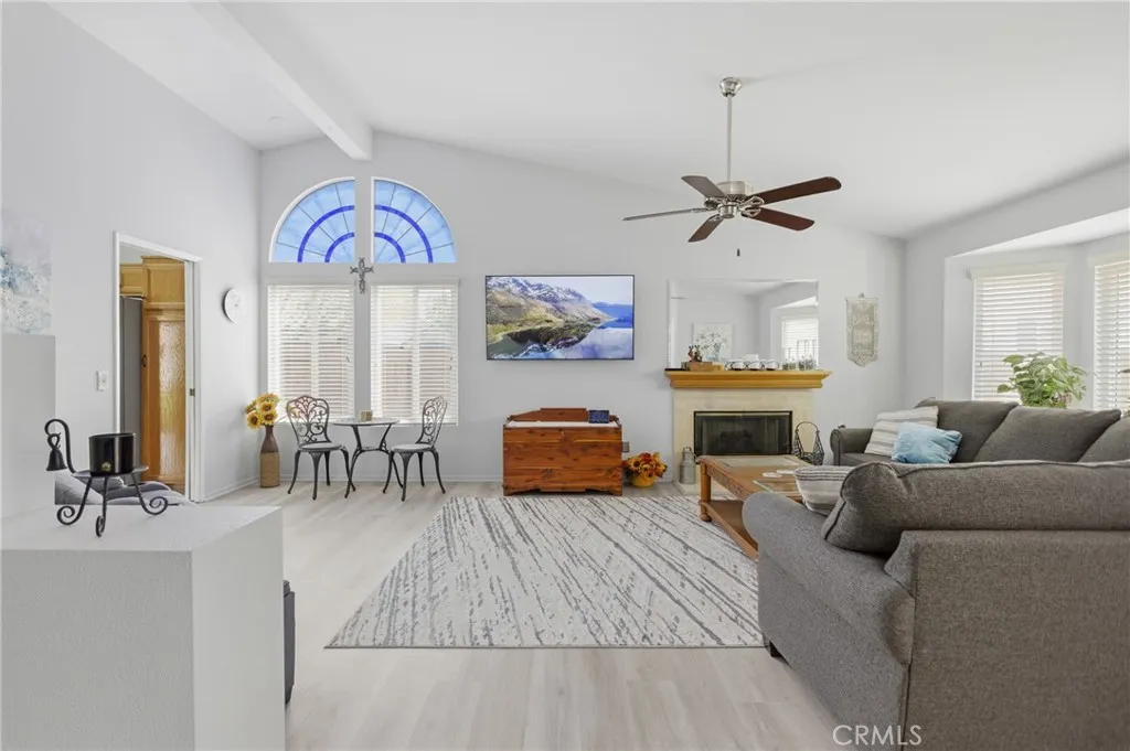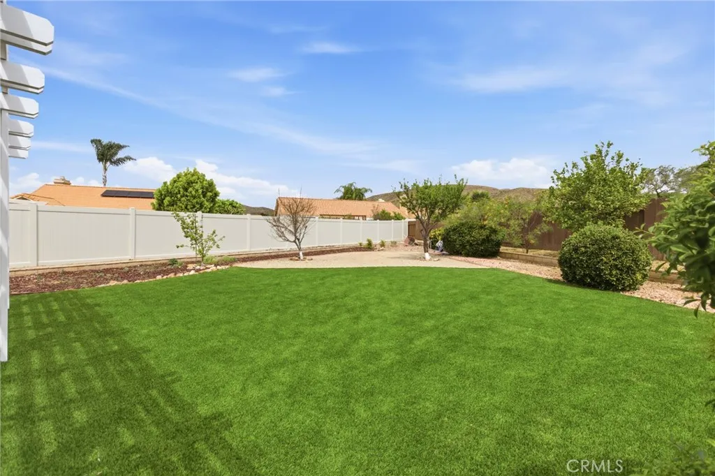 Welcome to this beautifully maintained single-story cul-de-sac home in the desirable Serenade 55+ community in Menifee. This 3 bedroom, 2 bathroom home offers 1,550 sq ft of comfortable living, featuring updated flooring throughout and a very well cared for interior that truly shows pride of ownership. The spacious layout includes formal living and dining areas with a cozy fireplace, plus an upgraded kitchen with granite countertops, island, pantry, and plenty of cabinet space. The primary suite features a double door entry, walk-in closet, and a custom tile walk-in shower. Both bathrooms have been tastefully updated with custom tile finishes. Additional upgrades include a whole house fan, newer dual pane windows, newer water heater, and a newer heating and air conditioning system. Indoor laundry adds everyday convenience. Step outside to a huge backyard with a park-like setting, updated with turf, mature fruit trees including apricot, peach, lemon, and plum, and a covered patio perfect for relaxing in the afternoon shade. The oversized 2+ car garage features epoxy flooring, with possible RV parking on the side. Sale includes all appliances including gas oven, microwave, dishwasher, refrigerator, washer, and dryer. The mounted 65” TV, sectional sofa, and electric fireplace heater are negotiable. Located just minutes from gyms, Starbucks, gas stations, convenience stores, shopping, medical centers, and with quick access to the 215 and 15 freeways, convenience is truly unmatched. No HOA and low property taxes (CC&Rs apply). This is a must see, come experience it for yourself, you won’t be disappointed.