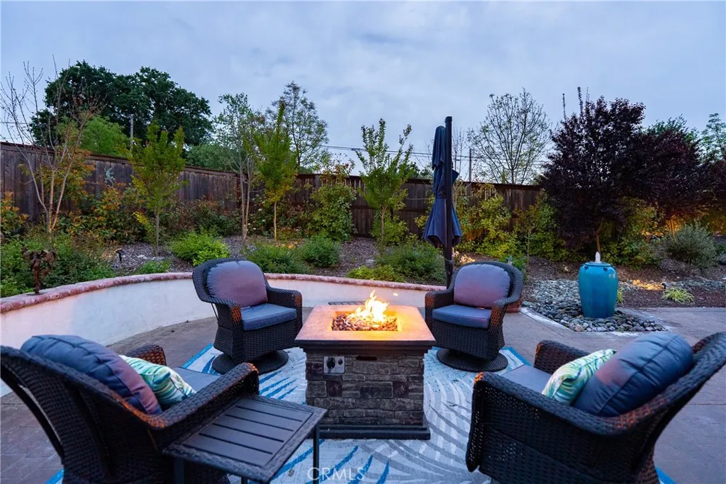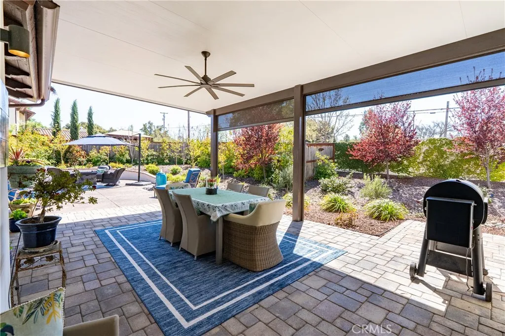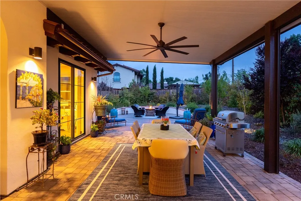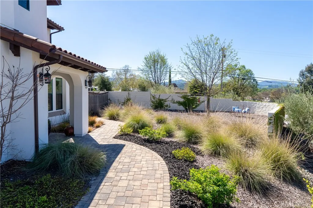 Welcome to 9300 Via Castillo in the Atascadero neighborhood of Cerro Roble! Built in 2021, this Santa Barbara Spanish-style home is a beautifully designed 4-bedroom, 2.5-bath residence offering approximately 2,546± sq ft showcasing modern elegance, thoughtful architecture, and comfortable living on an 11,579± sq ft lot. A brick-paved driveway and walkway lead to the home’s inviting entry, complemented by a landscaped front yard that enhances the property’s refined curb appeal. Inside, the open-concept main level is designed for both everyday living and entertaining. The spacious living room is highlighted by a cathedral ceiling open to the second story, allowing natural light to pour into the space while creating a sense of volume and sophistication. A gas fireplace and striking metal chandelier provide an elegant warm focal point. The kitchen blends style and function with a large center island, quartz countertops, stainless steel appliance package, and double oven, while sliding glass doors from both the kitchen and dining area create a seamless connection to the backyard. The primary suite on the main level offers flexibility and comfort, featuring a walk-in closet, sliding glass door access to the backyard, and a well-appointed bathroom with dual sinks, step-in shower, and a separate toilet room. The first floor also includes a laundry room with upper and lower cabinetry and a convenient half bath. Upstairs, three additional bedrooms provide comfortable accommodations, including one generously sized bedroom offering versatile use as a secondary living space, office, or guest retreat. The upstairs hall bathroom includes dual sinks and a separate shower and toilet room. The backyard is designed to enhance outdoor living with two distinct patio areas finished with stone pavers. The covered patio features electric shades and a ceiling fan, creating a comfortable setting for gatherings or quiet evenings outdoors. A second patio area is enhanced by two decorative blue fountains, adding character and ambiance. The side yard offers a versatile flex area that may be suitable for storage, workspace, or gardening. Additional features include a 2-car garage and a well-planned layout that balances modern style with everyday comfort.
