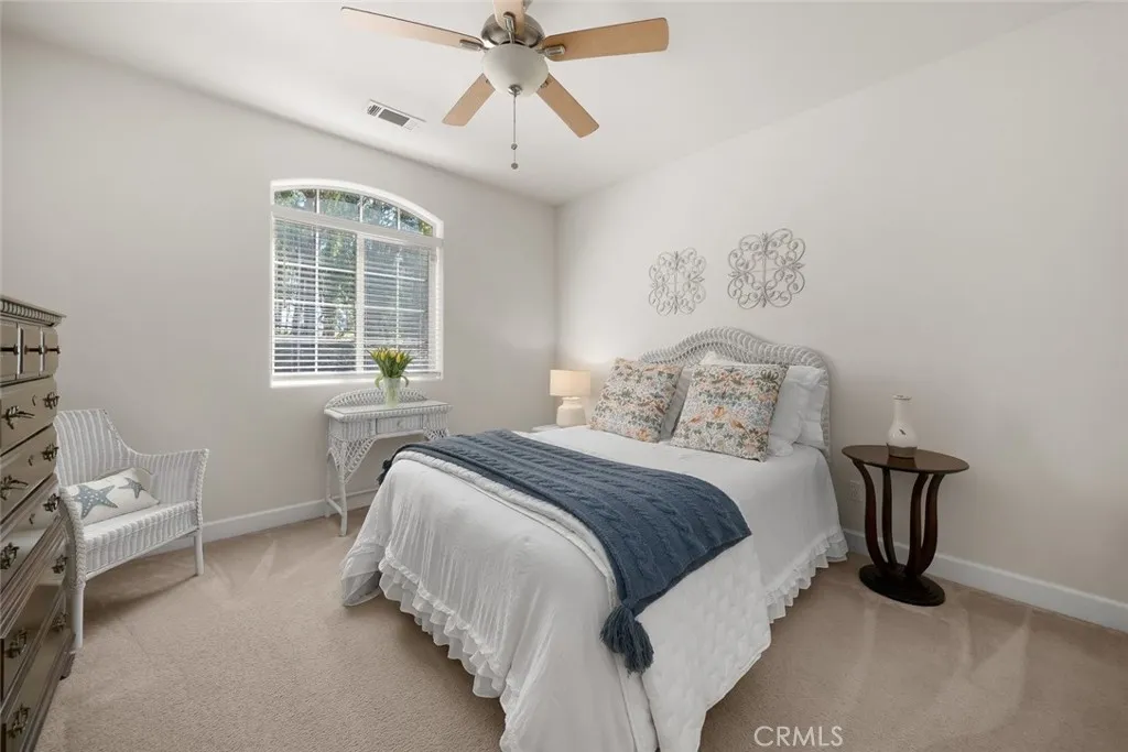 An exceptionally positioned townhome, defined by dramatic cathedral ceilings and soaring windows that capture uninterrupted views of the magnificent, tree-lined edge of the Monarch Butterfly Preserve. Few homes enjoy a setting this immersive—where the preserve’s natural beauty becomes a living backdrop felt throughout the interior and enhances the sense of privacy at every turn. The main level features an open layout with a living room anchored by a cozy fireplace, newer laminate wood flooring, and plantation shutters. The space flows seamlessly into the dining area and the well-appointed kitchen, enhanced by a new dishwasher and microwave and offering convenient access to the patio—an inviting place to relax, dine, and enjoy the serene surroundings. A main-floor bedroom enjoys the same tranquil views and is paired with a spa-like remodeled bathroom showcasing an elegant walk-in shower and dual vanity. Upstairs, three additional bedrooms and two full baths provide comfortable accommodations for family, guests, or an office or hobby space. Crisp interior paint, ceiling fans, and thoughtful finishes throughout contribute to the home’s move-in-ready appeal. Additional conveniences include a 2 car-garage with a built-in storage closet and a car vacuum system. Located within the Trilogy Monarch Dunes Resort Community, the home sits close to the clubhouse and its exceptional amenities, blending a peaceful, nature-oriented setting with the ease of resort-style living.