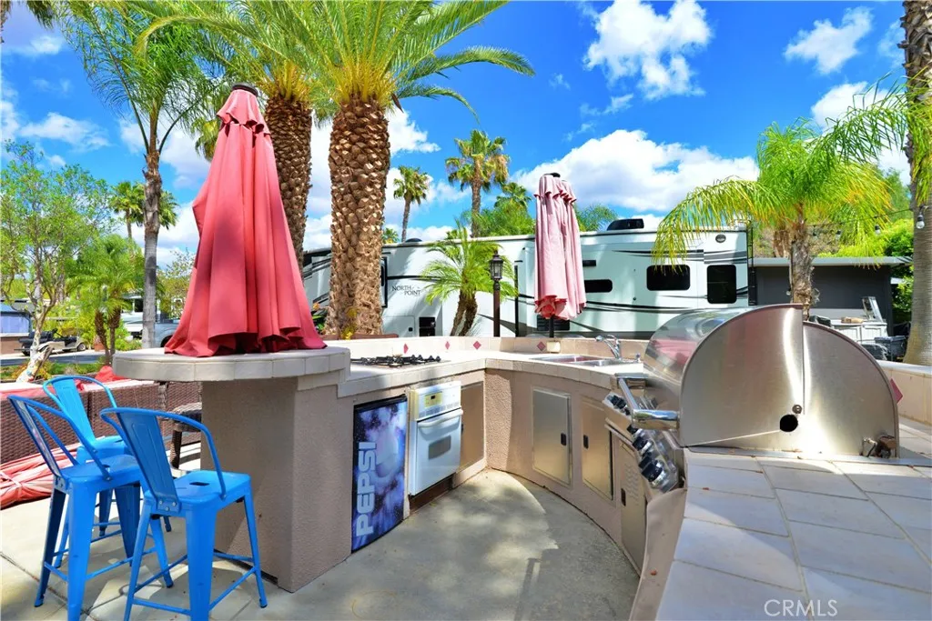 Luxury RV Lot in Rancho California RV Resort – Prime Outdoor Living. Welcome to one of the most beautifully improved RV lots in the highly sought-after Rancho California RV Resort. This spacious, oversized lot offers the perfect blend of comfort, privacy, and resort-style living. Framed by stunning Canary Island palm trees, the property creates a warm, tropical ambiance the moment you arrive. A thoughtfully designed outdoor kitchen makes entertaining effortless—ideal for hosting friends and family or enjoying quiet evenings under the stars. Specifically, stainless steel grill, side burner for large pots or searing, 4 burner cooktop, oven, stainless steel sink with hot water and under counter washer/dryer. Wrap around style tiled bar offers comfortable seating. This lot also features a lush grass area, providing a soft, green space for relaxation, pets, picnics or outdoor lounging. A mature hedge lines the South East side of the property, offering both beauty and added privacy, creating your own secluded retreat within the resort. The resort itself offers endless amenities. Such as a 14 hole par 3 golf course, 5 crystal blue pools and spas, fishing lake, pickleball, bocce ball, dog park, laundry facilities with showers and restrooms, market, restaurant, 2 club houses. Notable things to know: resort is not age restricted, owners golf for free with no tee times required, RCRVR is gated with a security service, trash and water service is included in HOA. Resort is roughly an hour from shopping/restaurants on El Paseo in Palm Desert, just over an hour to the coast and 20 minutes from several Temecula Valley wineries. Creating a fantastic southern California resort RV living experience on your own deeded lot.