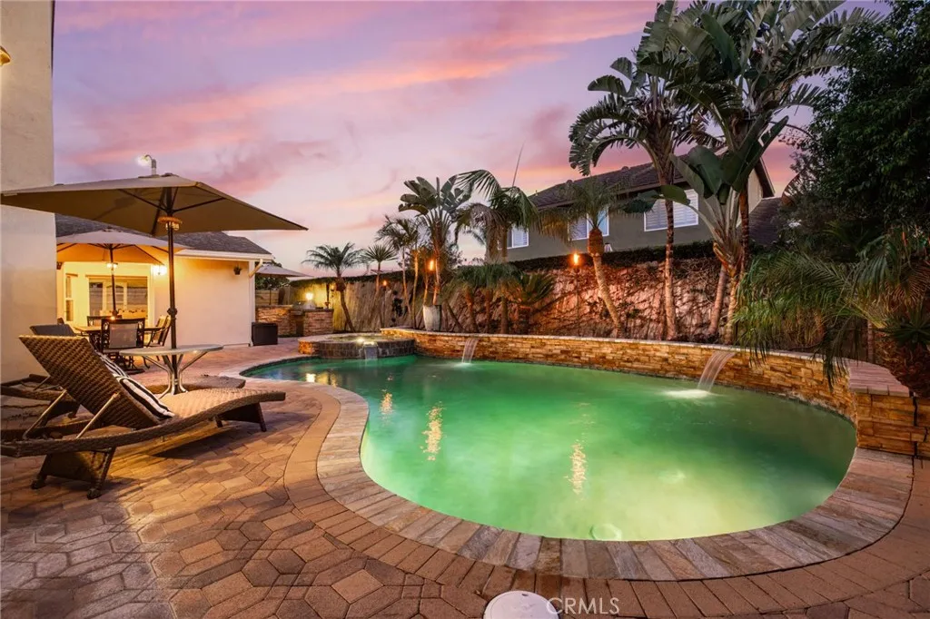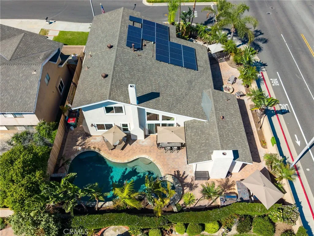 Expanded and thoughtfully updated, this South Huntington Beach home offers nearly 2,300 square feet of functional living space in one of the area’s most sought-after neighborhoods. A tile entry welcomes you in and transitions into wood flooring that runs throughout, complemented by upgraded windows and plantation shutters that bring in natural light while maintaining privacy. The layout is both practical and flexible, featuring a formal living room, separate dining area, and a spacious family room. At the center of the home, the kitchen has been upgraded with a high-end, entertainer-focused design—white cabinetry, a breakfast bar, and an open flow into an added family room with French doors that lead directly to the outdoor patio and pool. Two fireplaces add warmth and separation between the main living spaces without disrupting the open feel. A downstairs bedroom—currently set up as an office—sits adjacent to a full bathroom, creating an ideal space for guests, remote work, or multigenerational living. Upstairs, two generously sized bedrooms with a well-appointed hall bathroom. Find peace at the end of a long day in the comfort of your own private master suite, complete with walk-in closet, shutters, and full ensuite with glass shower and large vanity. The outdoor spaces are designed to be used year-round. An enclosed front patio adds privacy and an additional place to gather, while the yard wraps around the home, offering multiple areas to entertain—including a built-in BBQ with bar seating, a cozy fire pit, and a large pool with waterfall features and a spa. Additional highlights include a fully finished 2.5-car garage with epoxy floors and built-in cabinetry, providing both functionality and clean storage. Located in a highly regarded South Huntington Beach neighborhood, the home is just minutes from local schools, everyday shopping and dining, and within a few miles of the coastline.