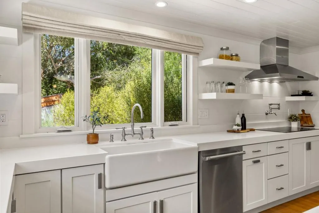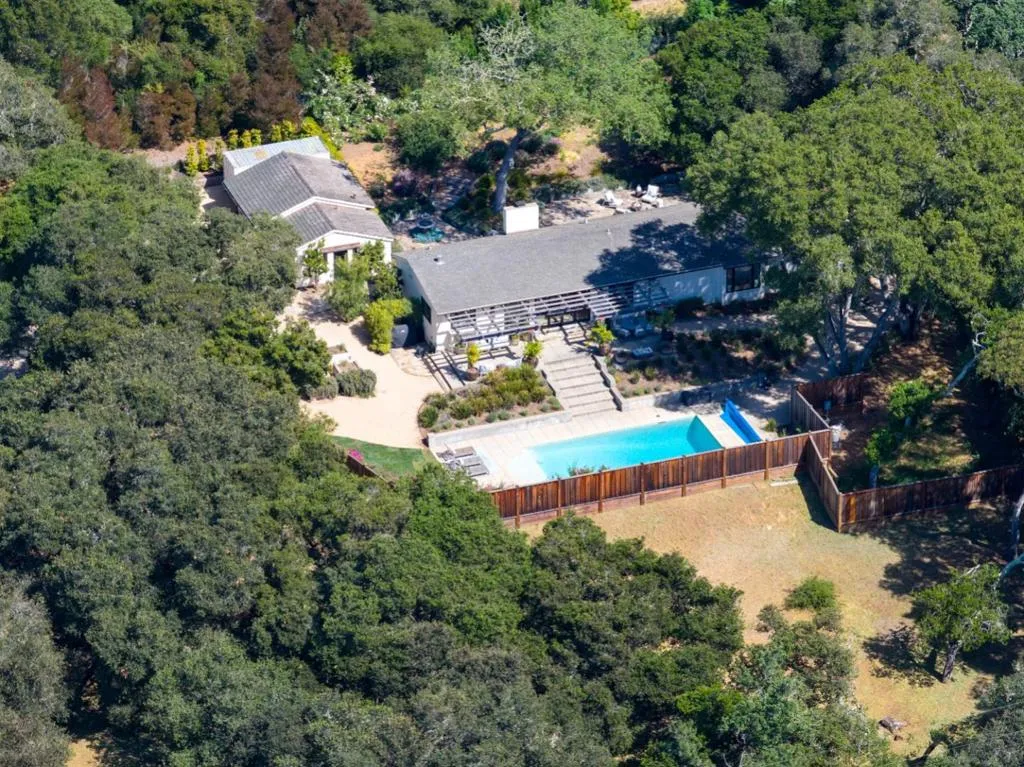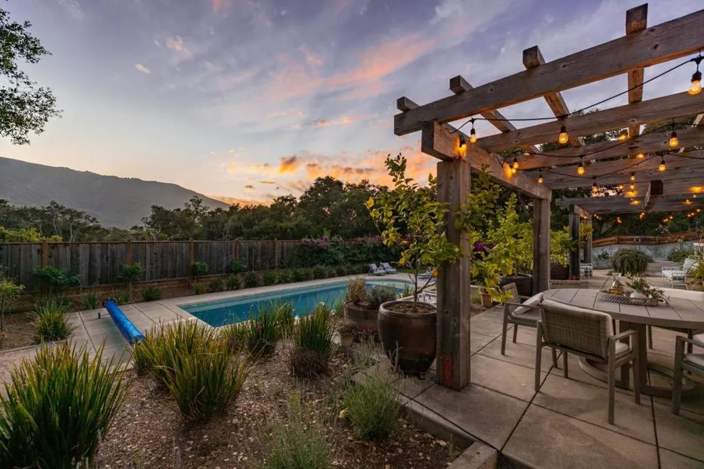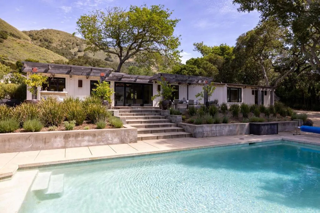 Nestled beneath ancient oaks with sweeping mountain views, this impeccably reimagined California ranch estate offers a rare blend of privacy, beauty, and sophistication. The 2,297 sq ft single-story main residence features soaring vaulted beam ceilings, wide-plank hardwood floors, and walls of glass that open to a stunning pool and gardens. The bright chef's kitchen features quartz countertops, a farmhouse sink, and custom cabinetry. The generous primary suite includes direct garden access, a spa-inspired bath with soaking tub, glass shower, and a custom walk-in dressing room. Outside, a string-lit pergola terrace runs the length of the home, terraced steps lead to a sparkling pool framed by lavender and mountain views, and a raised-bed kitchen garden adds charm and function. The detached guest quarters offer flexibility for guests, extended family, or a studio. A stone court with a fountain, mature oaks, and vibrant bougainvillea completes these incredible grounds.