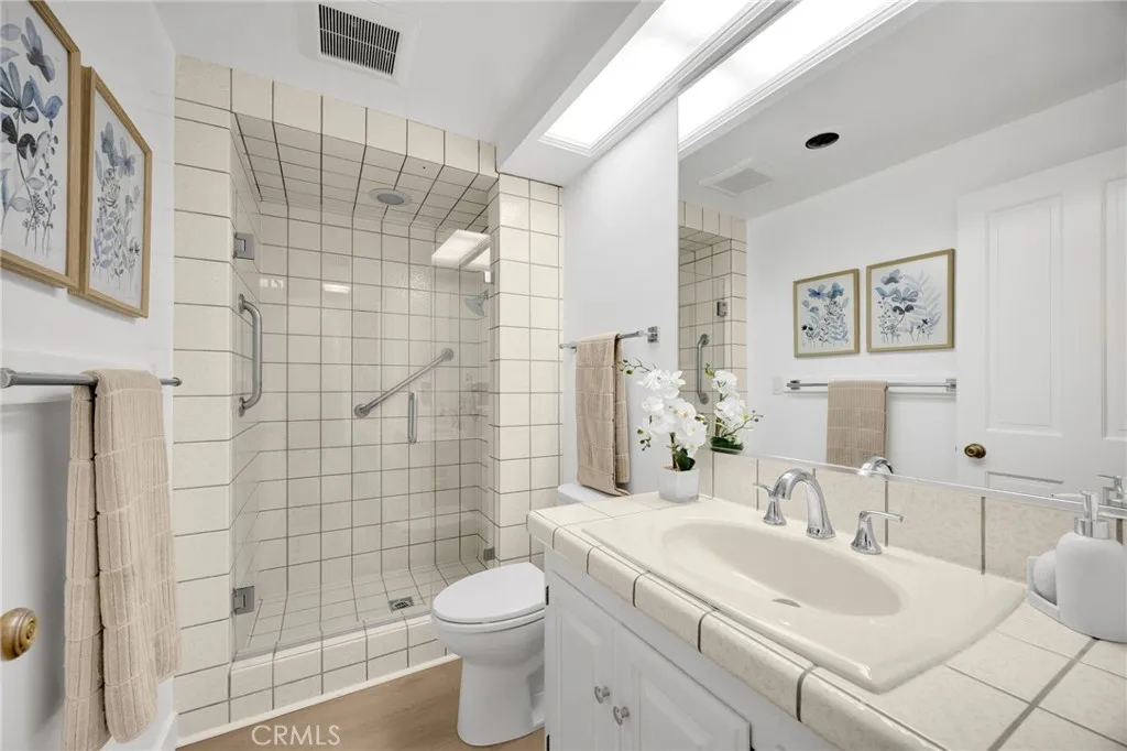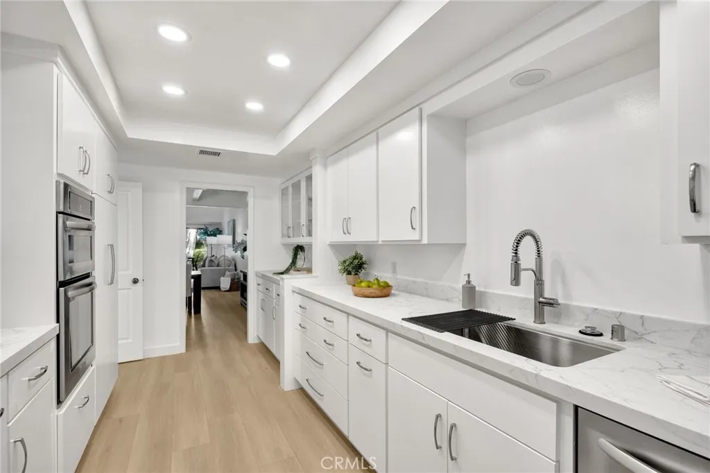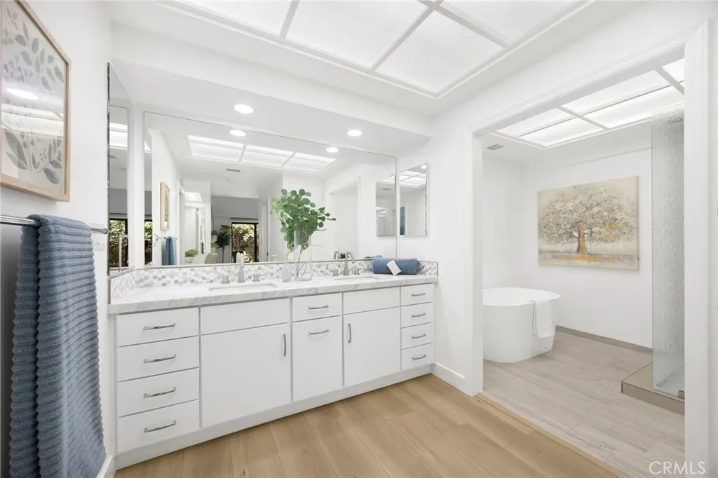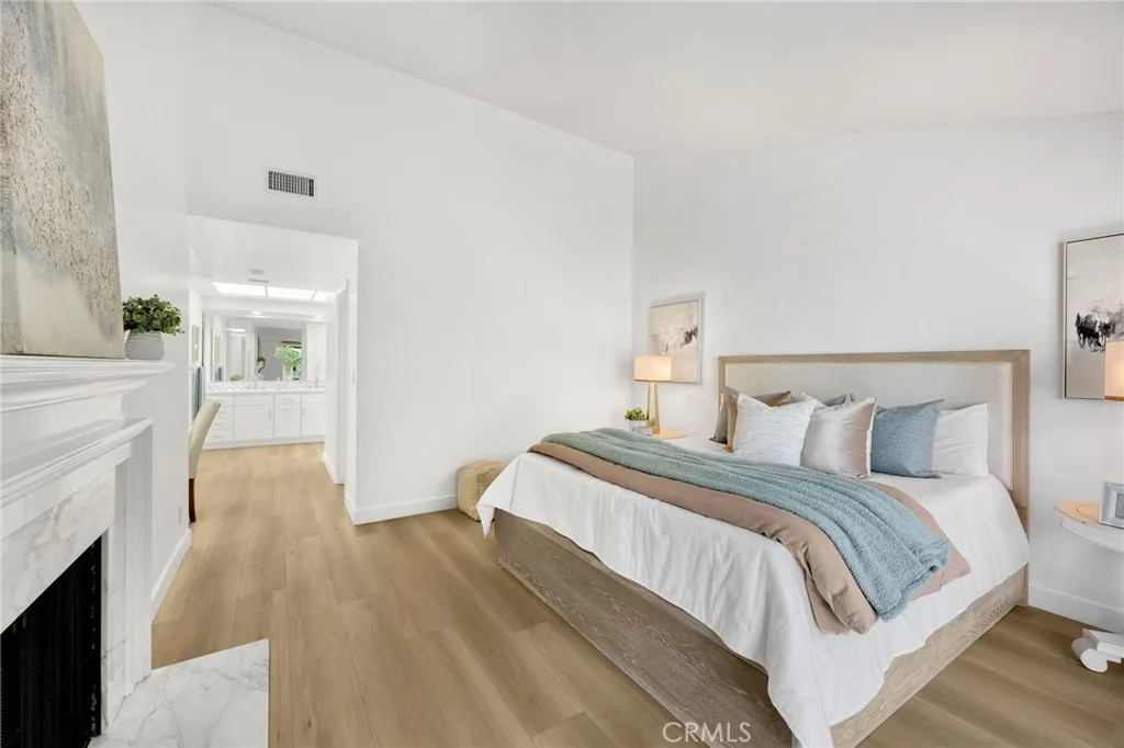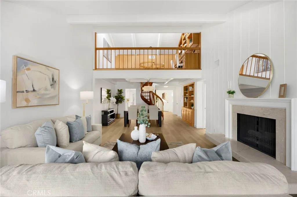 The gated community of Friendly Woods is a much sought after enclave of only 36 homes in Whittier - an oasis with manicured greenery, a swimming pool, spa and tennis court, yet convenient to civilization. This home in particular has been freshly renovated to please the most discerning home buyer. The "beachy" floors and warm white walls give this home an expansive, inviting vibe. The large galley kitchen has new flat front cabinet doors and drawer fronts (easy to clean), quartz counters, stainless 5 burner cook top, double oven and stainless fridge and dishwasher. The dining nook has glass doors overlooking your private courtyard, a small secretary's desk and washer/dryer tucked into a closet. The great room is perfect for entertaining. Imagine gathering for a meal with your loved ones, the ambience of the fireplace, the expansive sliding doors that open onto your patio and the green belt beyond. From the great room you can climb the spiral staircase up to the loft which makes a terrific home office - it's private without feeling "locked away" while you work. While you're up there, be sure to look for the secret doors in the paneling that conceal book shelves and a filing cabinet. Both bedrooms are quite large. The spa-like primary en-suite bath has a gorgeous walk-in shower with custom tile work, a vessel soaking tub with floor mounted fixtures, double sinks and lots of storage. The primary bedroom has a walk in closet + a second smaller closet, a built-in vanity and a gas fireplace - you'll never want to leave. Even the secondary bedroom is large with original floor to ceiling windows overlooking your private front court yard. Home has an attached, oversized two-car garage with a utility area and ample guest parking available.