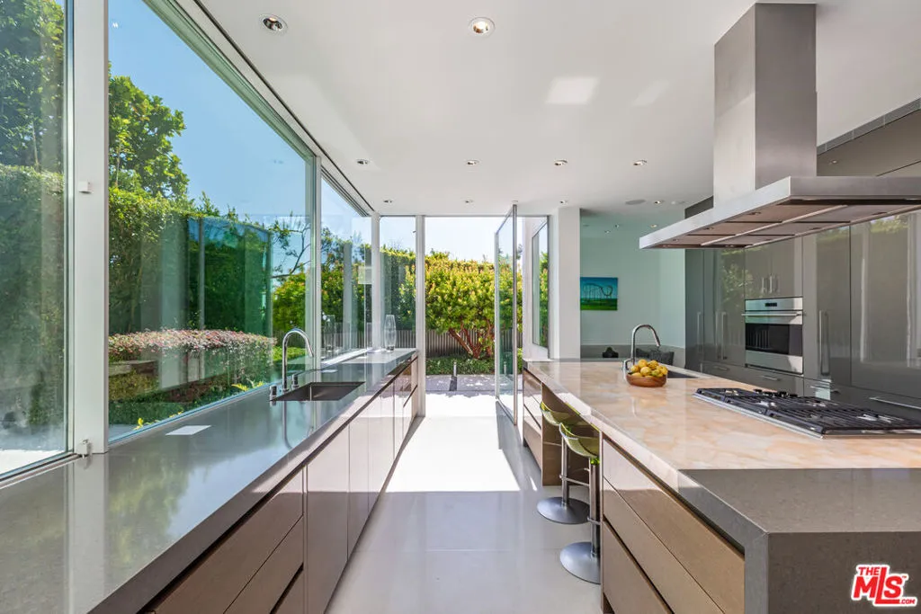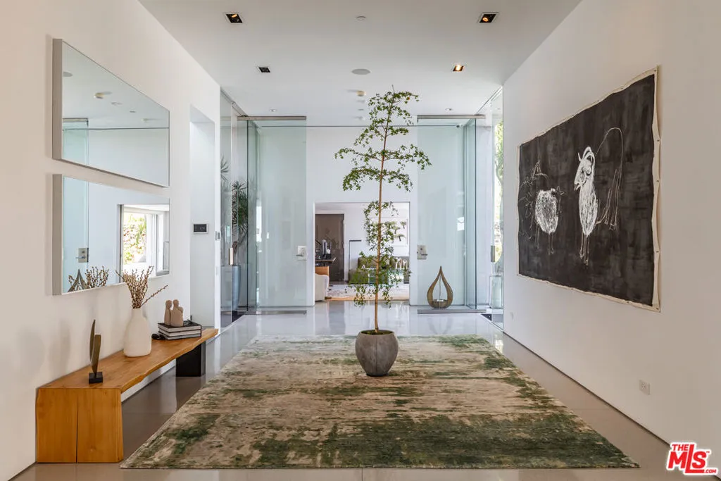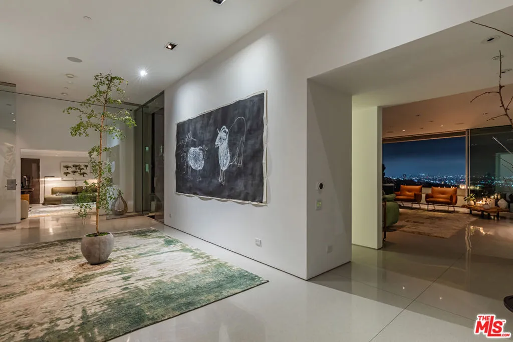 Perched to capture sweeping city lights and sunset ocean views, the Full Moon House is a masterclass in refined modern luxury and bespoke international craftsmanship. With interiors thoughtfully curated by Max Amirsole, featuring artful pieces from Italy, France, and beyond, the home exudes inviting warmth and worldly elegance. His design seamlessly complements James Magni's architectural vision, where bold lines and open-concept spaces meet light, texture, and panoramic city-to-ocean views. Floor-to-ceiling glass walls connect seamless indoor-outdoor spaces, leading to expansive terraces and newly landscaped grounds featuring a stone water feature and a sculpture installation. The main level features a dramatic living area with disappearing glass walls, a sleek chef's kitchen centered around a backlit onyx island, and a formal dining space ideal for entertaining. Designer bedrooms include imported pieces from Spain and Italy, Toto toilets, and flexible use options such as a pre-wired theater suite. The primary suite spans the entire upper level with motorized shades, lime-washed walls, dual spa baths, a soaking tub set on stone, two walk-in closets, and a private outdoor gym terrace. Additional features include terrazzo flooring throughout, Control4 smart home automation, Lutron lighting, solar panels, and a redesigned cabana with smooth stucco and custom shelving. This residence offers an unparalleled blend of modern sophistication, curated design, and indoor-outdoor serenity in the hills above Los Angeles. Furnishings thoughtfully curated from Cantoni, Poliform, BoConcept, and bespoke designer pieces.