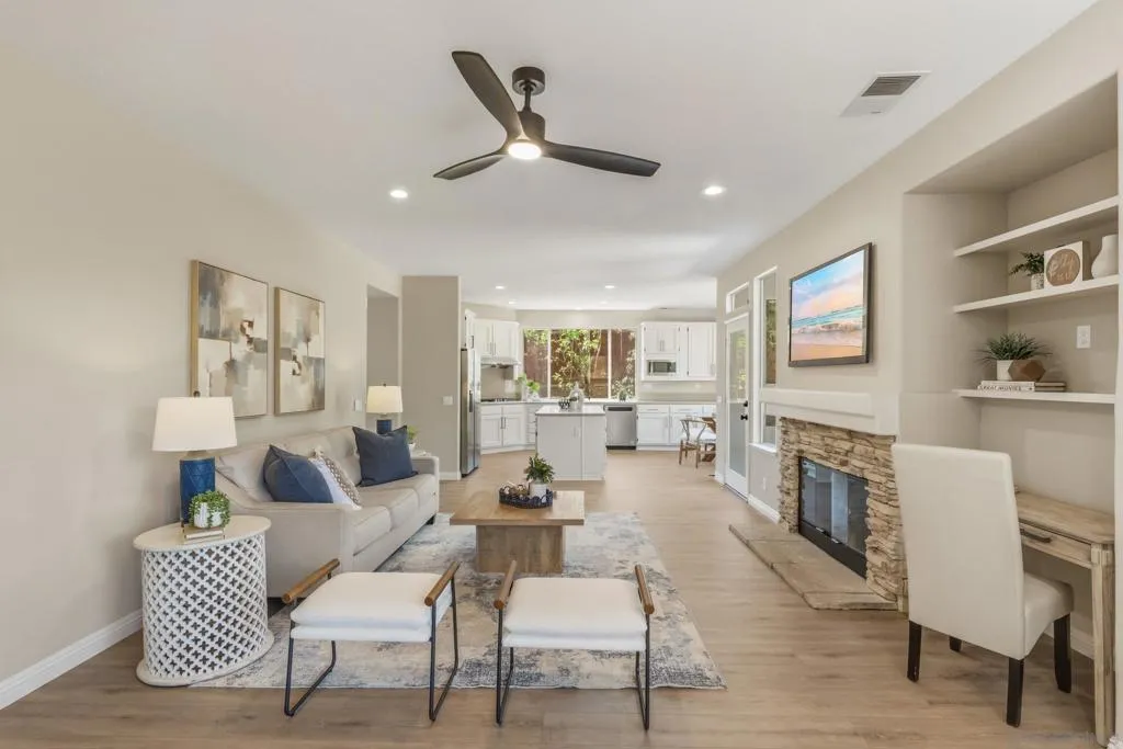 Welcome to your dream home in Park Village — where everyday living feels like a retreat. This stunning home sits on a spacious, private corner lot with fresh flooring, paint, fixtures, and hardware throughout. The soaring two-story great room, chef's kitchen, stone fireplace, and sun-drenched backyard create spaces made for both entertaining and unwinding. A main-floor optional bedroom/office and full bath add flexibility. Paid solar keeps costs low. And the best part? You're steps from the trails of Los Peñasquitos Canyon Preserve — San Diego's most beloved open space. This is Park Village living at its finest. Home Upgrades: Paid Solar: 16 panels Added unpermitted downstairs office 2022 (Builder option to add the bedroom in this model). Upgraded downstairs bath and upstairs kids bath 2022. New blinds throughout, exterior home painting- all done between 2022-2024 . Interior painted and new water heater 2026. New Luxury Vinyl Plank flooring 2026 New carpet 2026. New light fixtures in entry, dining room and primary bath 2026. New ceiling fan with light in family room 2026. New interior door handles 2026. New kitchen, primary bathroom and laundry cabinet hardware 2026. Schools: Park Village Elementary, Mesa Verde Middle, Westview High. No HOA. No Mello Roos