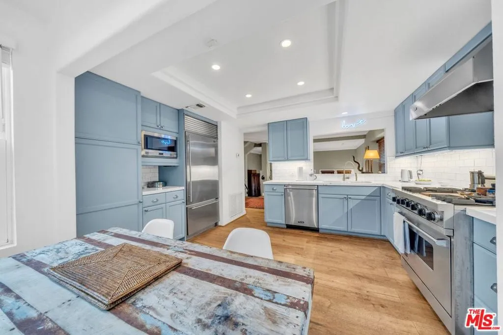 824 Amherst is a FURNISHED townhome available May 15 (possibly earlier). Perfectly situated in the highly sought after neighborhood in the flats of Brentwood. Tree-lined streets await you in this primarily single-family home enclave tucked between the Brentwood Country Club, Santa Monica & Brentwood Village. Just a block and a half from arguably the best Sunday Farmer's Market, bustling restaurants and shops of the Village and Montana Avenue, this is a prime location whether you need a full-time residence or a pied-a-terre in Los Angeles. The townhome is west facing, bright with natural light from abundant windows and French doors with a spacious tri-level floorplan. Elegantly furnished with timeless pieces, the home exudes comfort from the moment you enter the first floor living space with its inviting armchairs, generous couch and fireplace. French doors flood light and lead to a front patio perfect for al fresco dining or just enjoying a sunny afternoon (or throw them open and enjoy the breeze off the, not so far away, ocean). Several stairs up, the dining room awaits adjacent to the sunny kitchen with sky blue cabinetry giving the space an airy feel. The kitchen has stainless-steel high-end appliances & a comfy place to enjoy your breakfast. Upstairs the primary suite welcomes you with a four-poster bed, beautiful contemporary ensuite bathroom with a walk-in shower and soaking tub. The primary also has a bonus loft with a fireplace --- perfect private lounge room. Across the hall is the second generous bed and bath. This is a beautifully appointed home and spectacular location to begin a new chapter in Los Angeles. Just unpack your suitcase & enjoy. Property owner seeking a 12 month lease, no extensions.