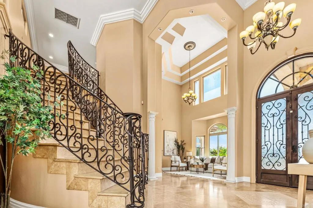 Located in Proctor Valley’s most desirable neighborhood, this gated estate offers a rare opportunity to experience elevated living on a beautifully positioned corner parcel just over an acre. Surrounded by sweeping mountain vistas and open skies, the setting captures the essence of Jamul living while remaining just 10 minutes from Rancho San Diego and an easy 20-mile drive to Downtown San Diego. A grand arrival begins with impressive architectural presence and elegant wrought iron entry doors, opening to interiors defined by soaring ceilings, natural light, and timeless finishes. Rich travertine floors run throughout the main living areas, complementing the statement staircase and refined spaces that create an inviting yet sophisticated atmosphere. The formal living room is anchored by a custom precast concrete fireplace, while the formal dining area is framed by large windows that bring the outdoors in. Designed for both everyday comfort and entertaining, the open-concept layout seamlessly connects the main living areas. The kitchen is thoughtfully appointed with granite countertops, custom cabinetry, a walk-in pantry, and high-end appliances, flowing effortlessly into the family room and casual dining nook. The main-level primary suite offers a private retreat with tranquil views, a spacious walk-in closet, and a spa-inspired bath featuring a soaking tub and oversized shower. An additional bedroom on the first floor provides flexibility for guests or multigenerational living, while upstairs bedrooms share a full bath and include a dedicated workspace. Outdoors, the property transforms into a resort-style sanctuary. A custom rock pool with waterfall, slide, and raised spa is complemented by an outdoor kitchen, BBQ area, and expansive patio spaces designed for gathering and relaxation. Mature landscaping, including fifteen fruit and citrus trees, enhances the grounds, while a basketball court and open space offer flexibility for animals or a detached ADU. Additional features include owned solar, Tesla charger, a three-car garage, extended driveway, and full fencing for privacy and security. With no HOA, proximity to local wineries and golf, and a peaceful setting framed by natural beauty, this home delivers a lifestyle that feels both refined and effortless.