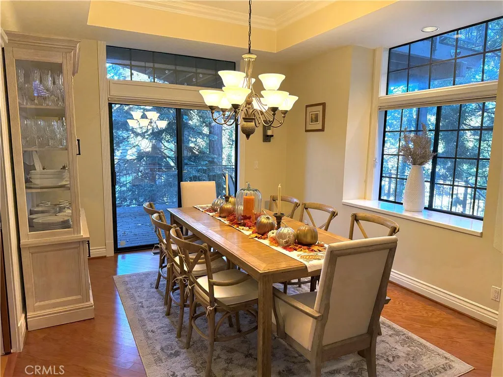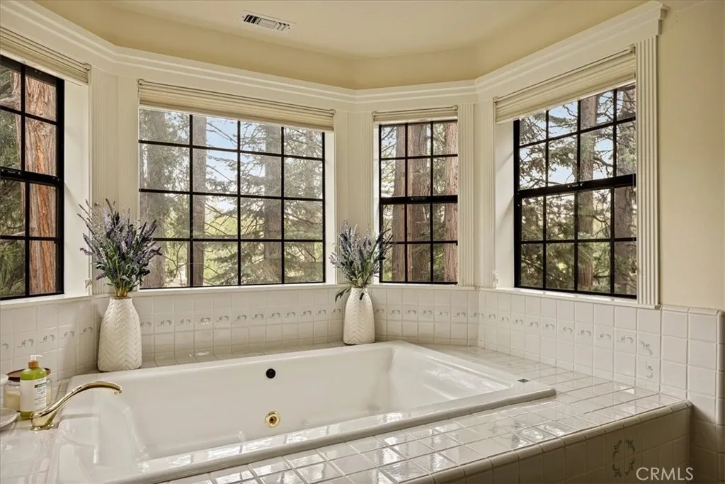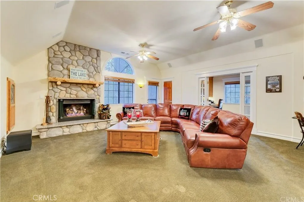 Escape the city and discover your private mountain retreat in the coveted Meadow Shores community of Lake Arrowhead. Tucked among the trees, this exclusive estate offers the perfect blend of privacy, space, and modern convenience—ideal for those looking to trade traffic and noise for fresh air and lake living. Walk to the lake and half double dock with a boat lift! Designed with easy mountain living in mind, the home features level entry and a flowing floor plan that opens to expansive decks—perfect for morning coffee, evening sunsets, and entertaining under the pines. The spacious kitchen anchors the home with an oversized cooking island, breakfast bar, recipe desk, and breakfast nook, all connecting seamlessly to the great room with a real wood fireplace and indoor-outdoor access. The primary suite is a true retreat, set apart for privacy with vaulted ceilings, its own private deck, a dual-sided fireplace, sitting area, and a luxurious bath with soaking tub, steam shower, vanity, and large walk-in closet. Additional flexible living spaces include a media/game room/library with fireplace and adjoining office, plus two more bedrooms and a full bath—perfect for guests, working from home, or multi-family living. Outside, the property is designed for both relaxation and recreation with fenced outdoor spaces ideal for children and pets, a backyard sport court, and a multi-zone irrigation system to maintain the landscaped grounds. The garage includes a 220 breaker ready for EV charging, and the home is equipped with a full-house generator—highly sought-after features for mountain living and peace of mind. There is ample parking for multiple vehicles, a boat, trailer, or golf cart, plus plenty of storage. Walk to the lake and your double dock with boat lift in wind-protected Meadow Bay, completing the ultimate mountain lifestyle property for full-time living or a luxury escape from the city.